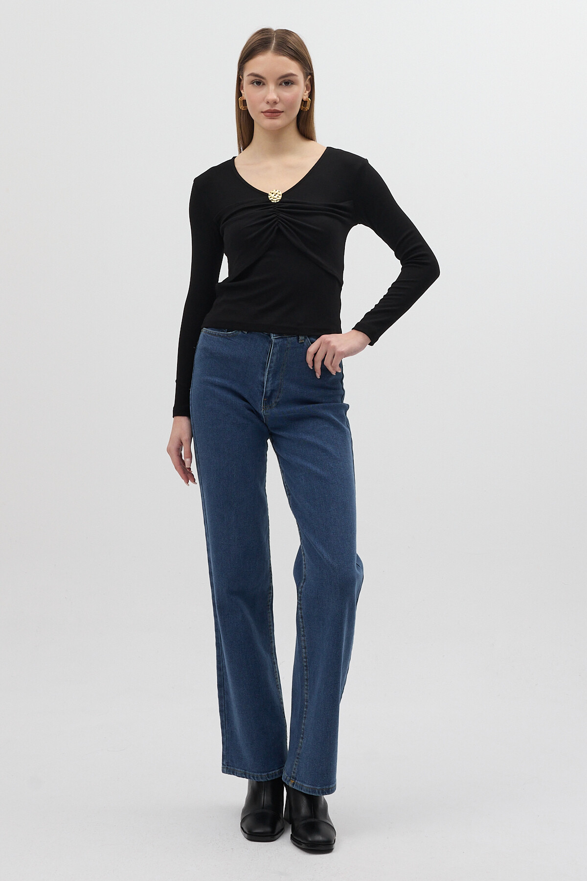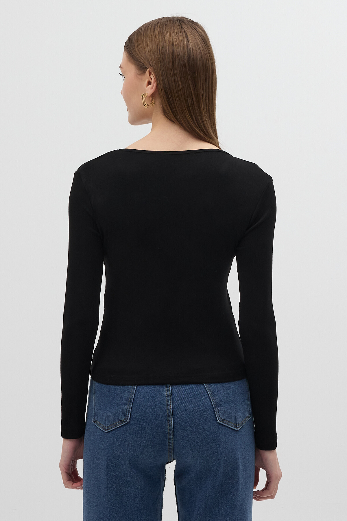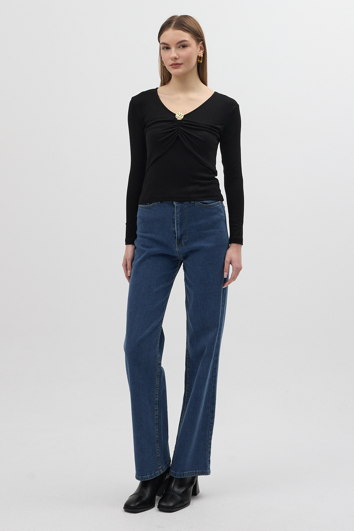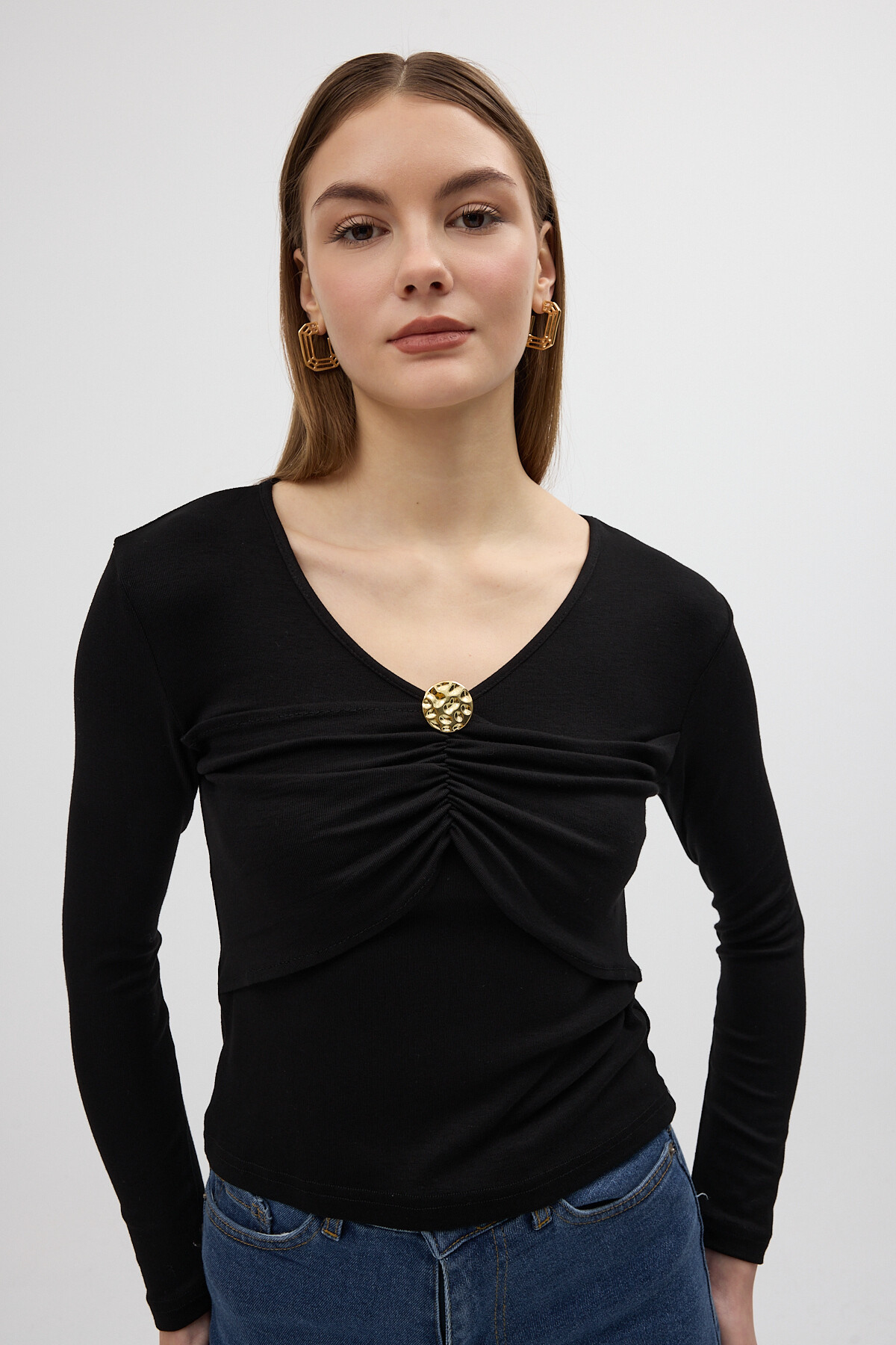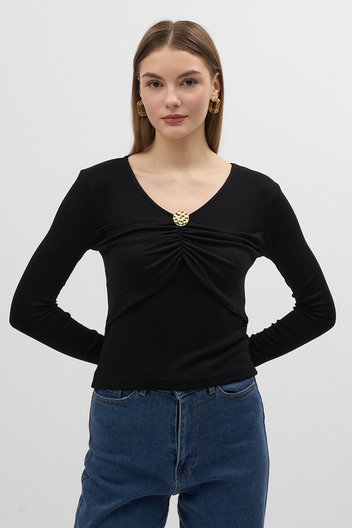 Siyah V Yaka Ön Düğme Detaylı Bluz 8226A