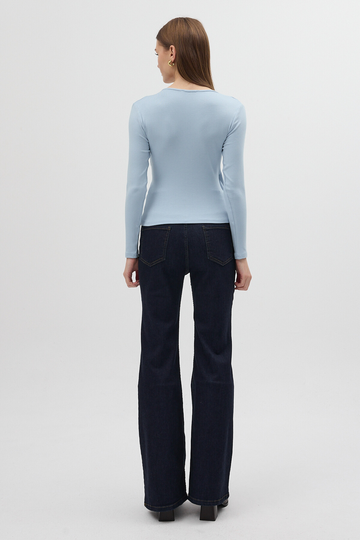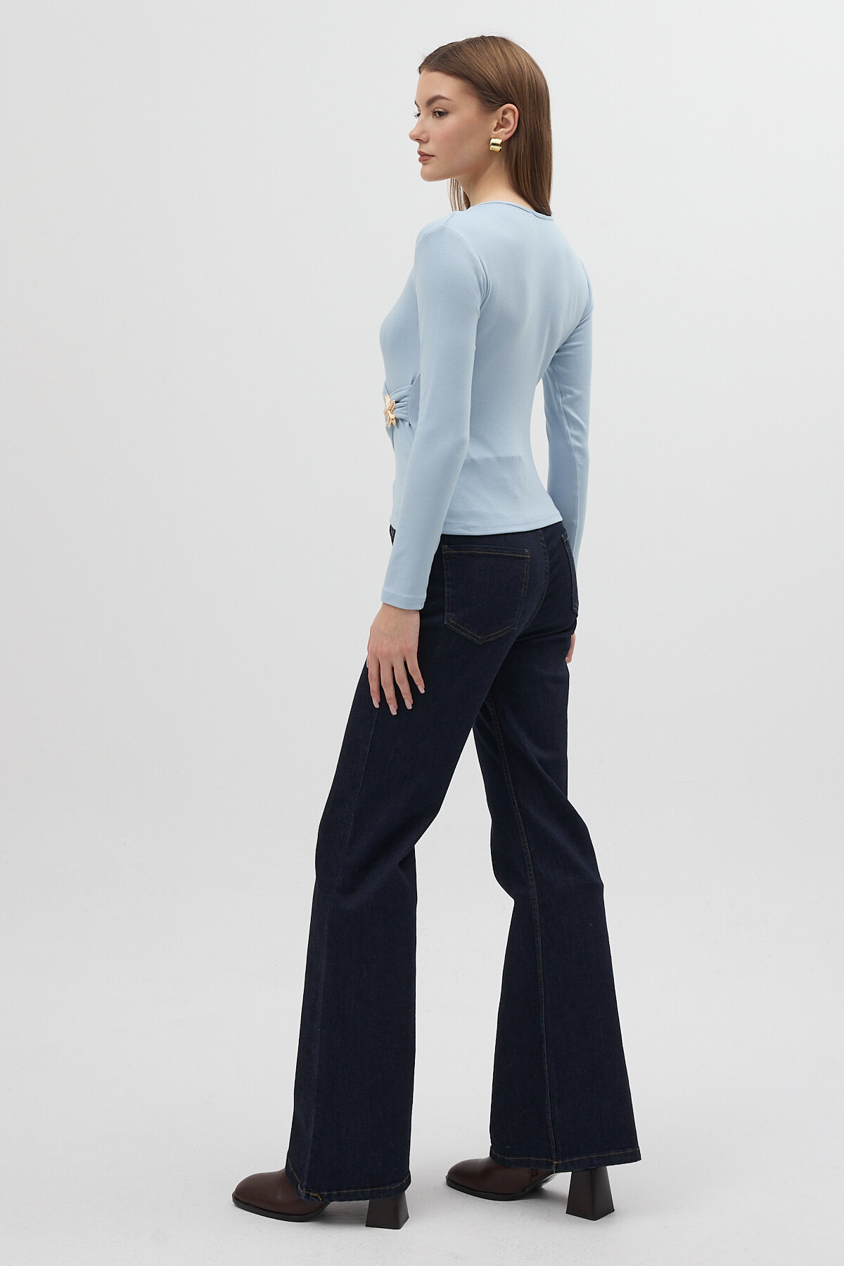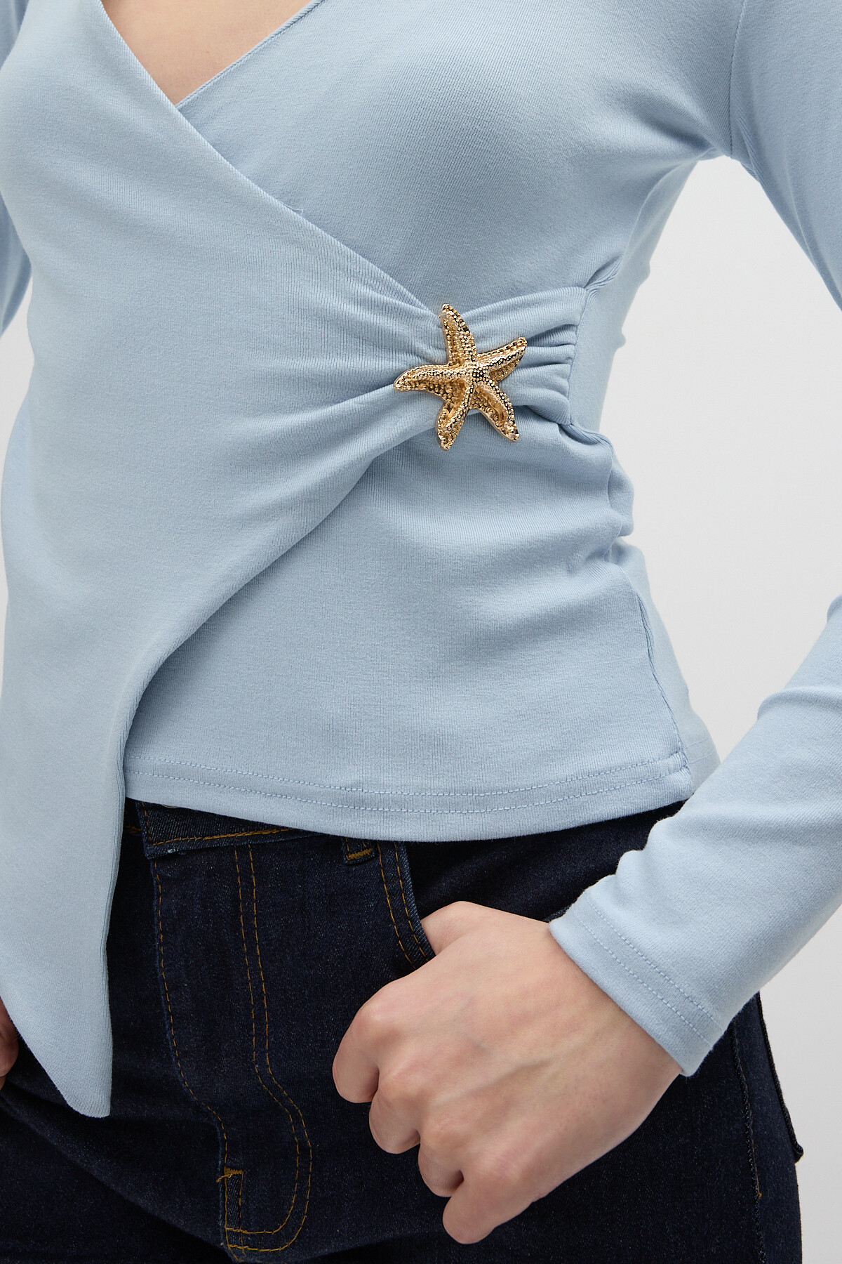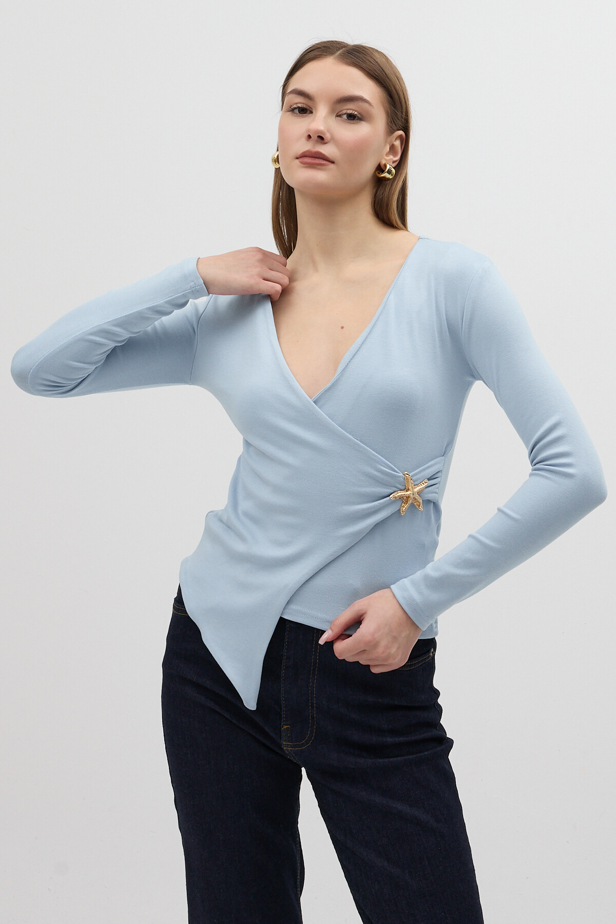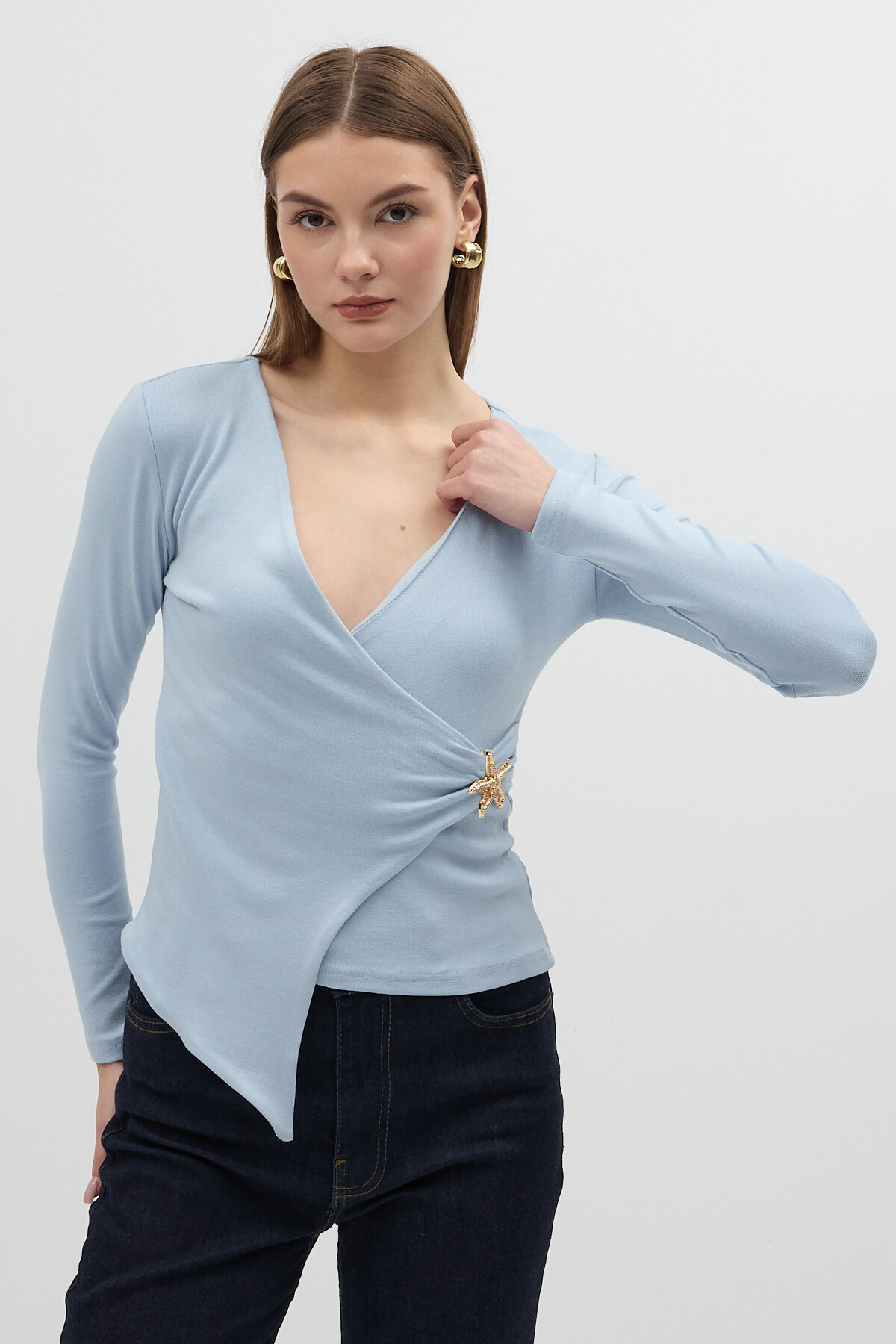 Mavi Aksesuarlı Kruvaze Yaka Uzun Kollu Bluz 8227A