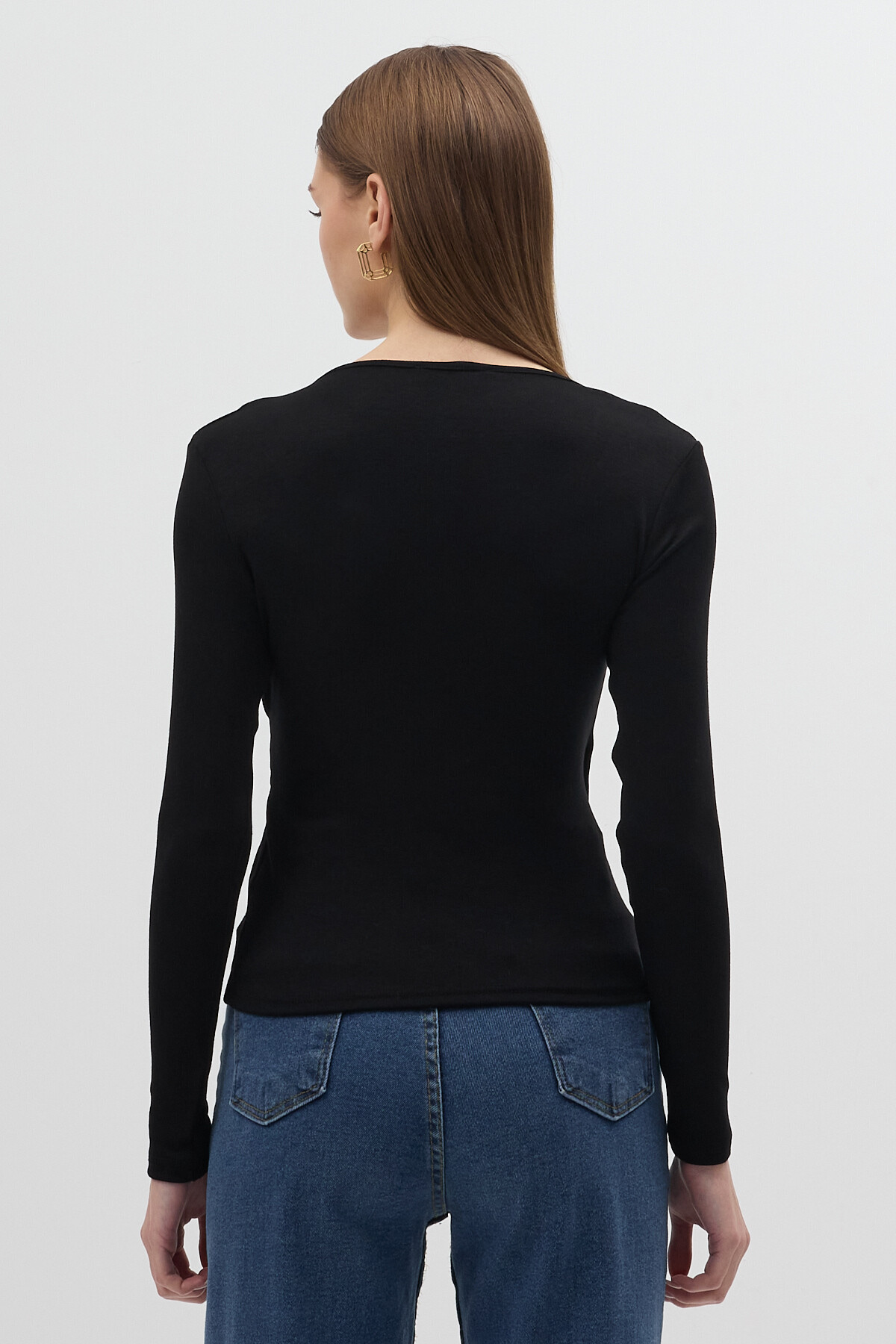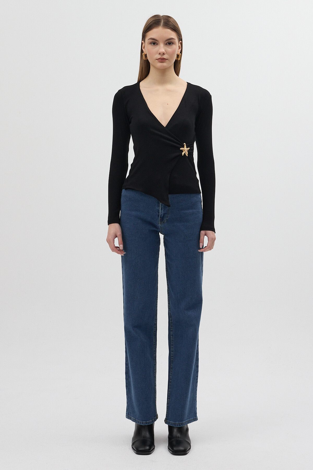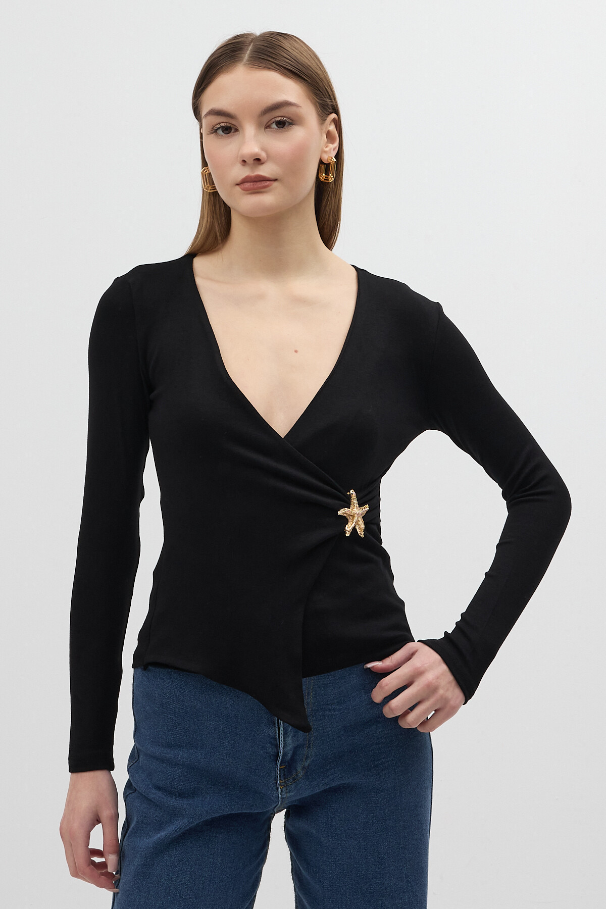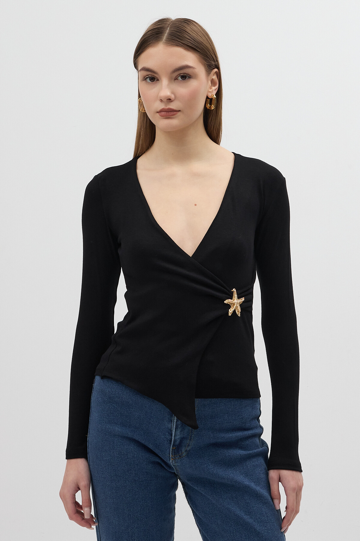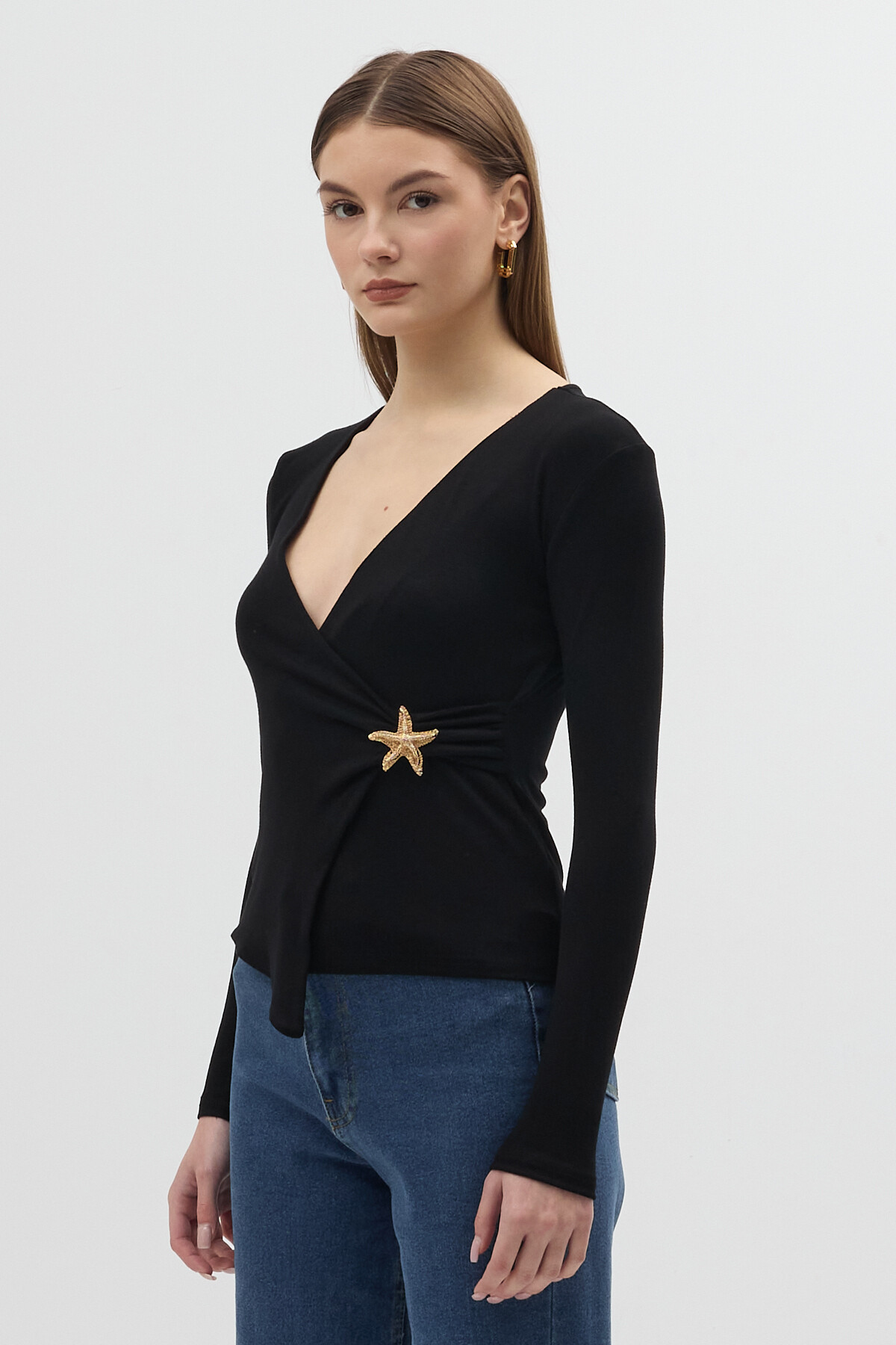 Siyah Aksesuarlı Kruvaze Yaka Uzun Kollu Bluz 8227A