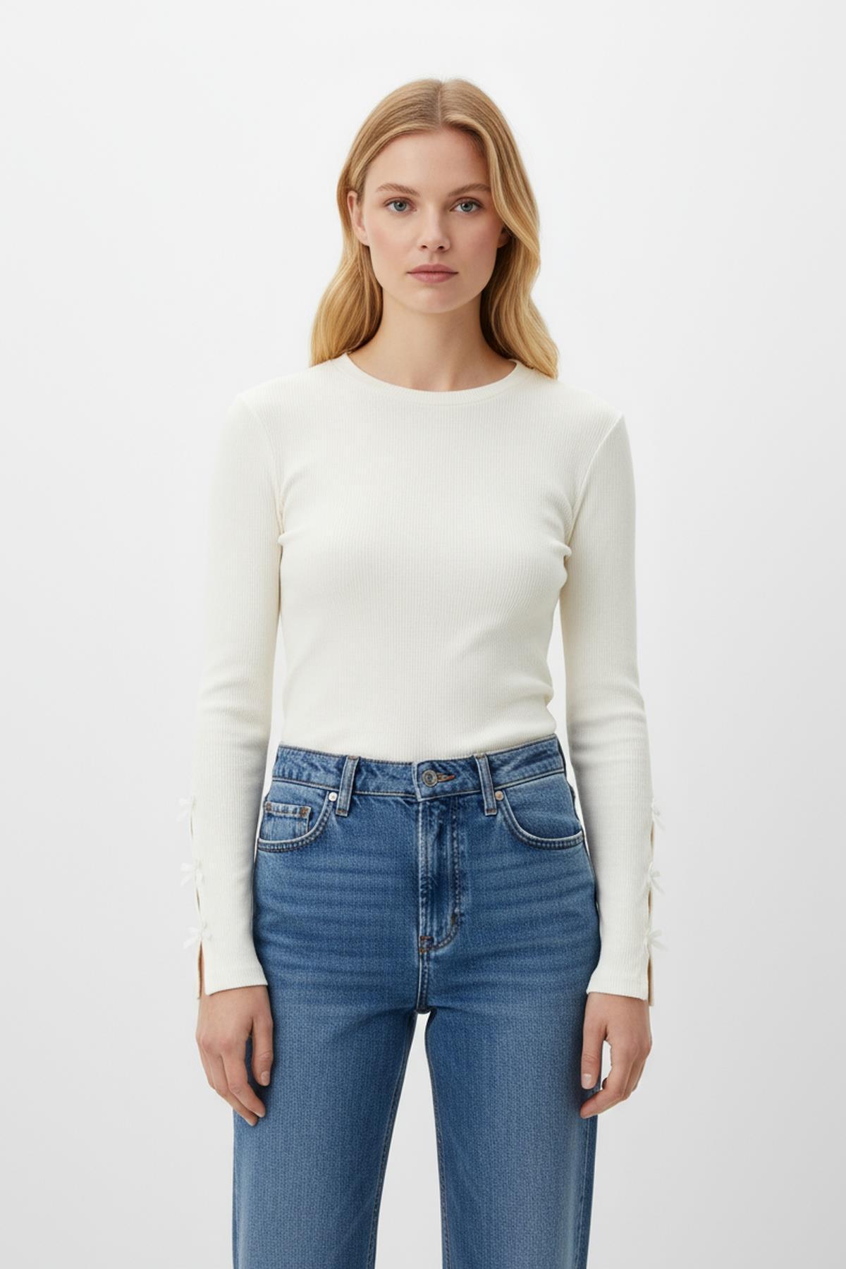 8226A V Yaka Ön Düğme Detay Bluz Ekru