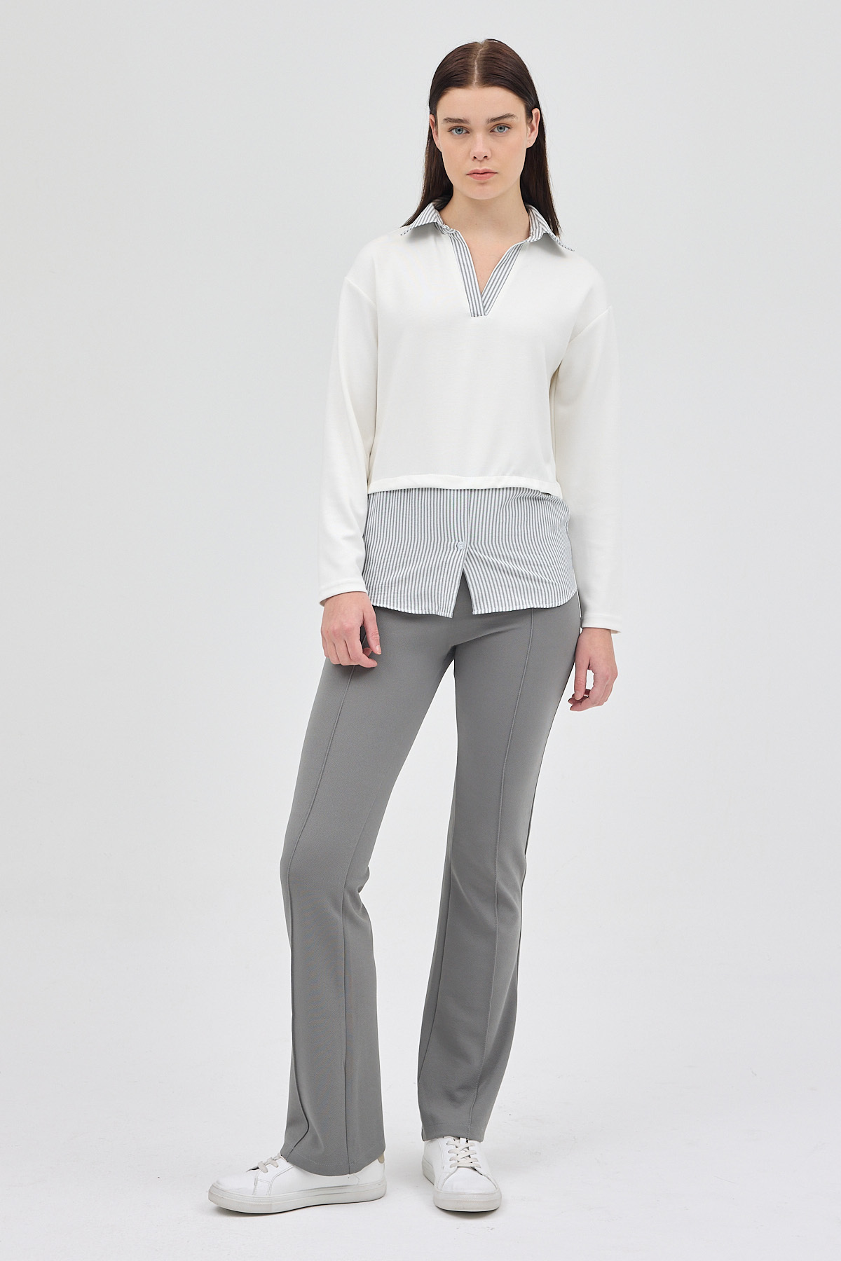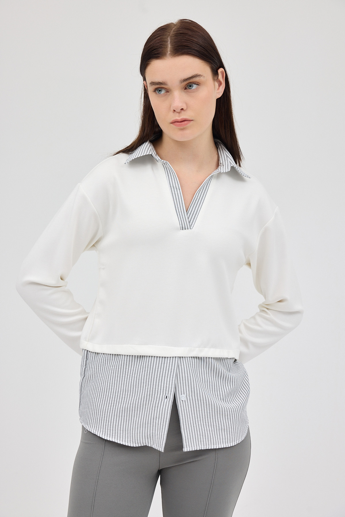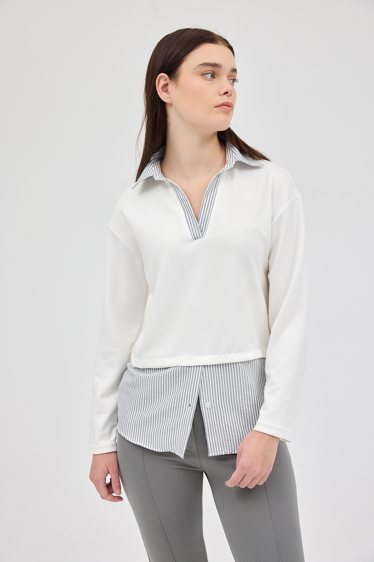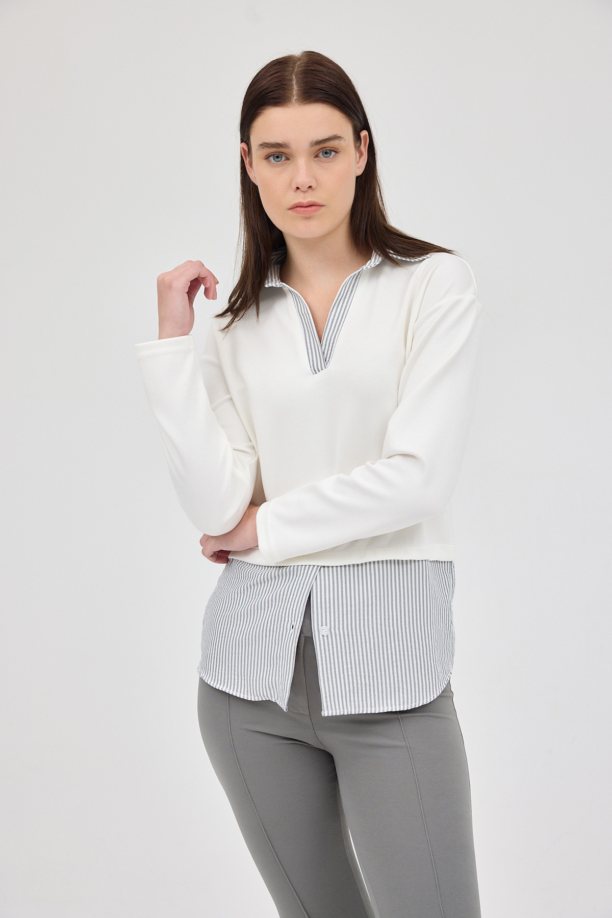 Ekru Gömlek Yaka Detaylı Triko Bluz 8241A