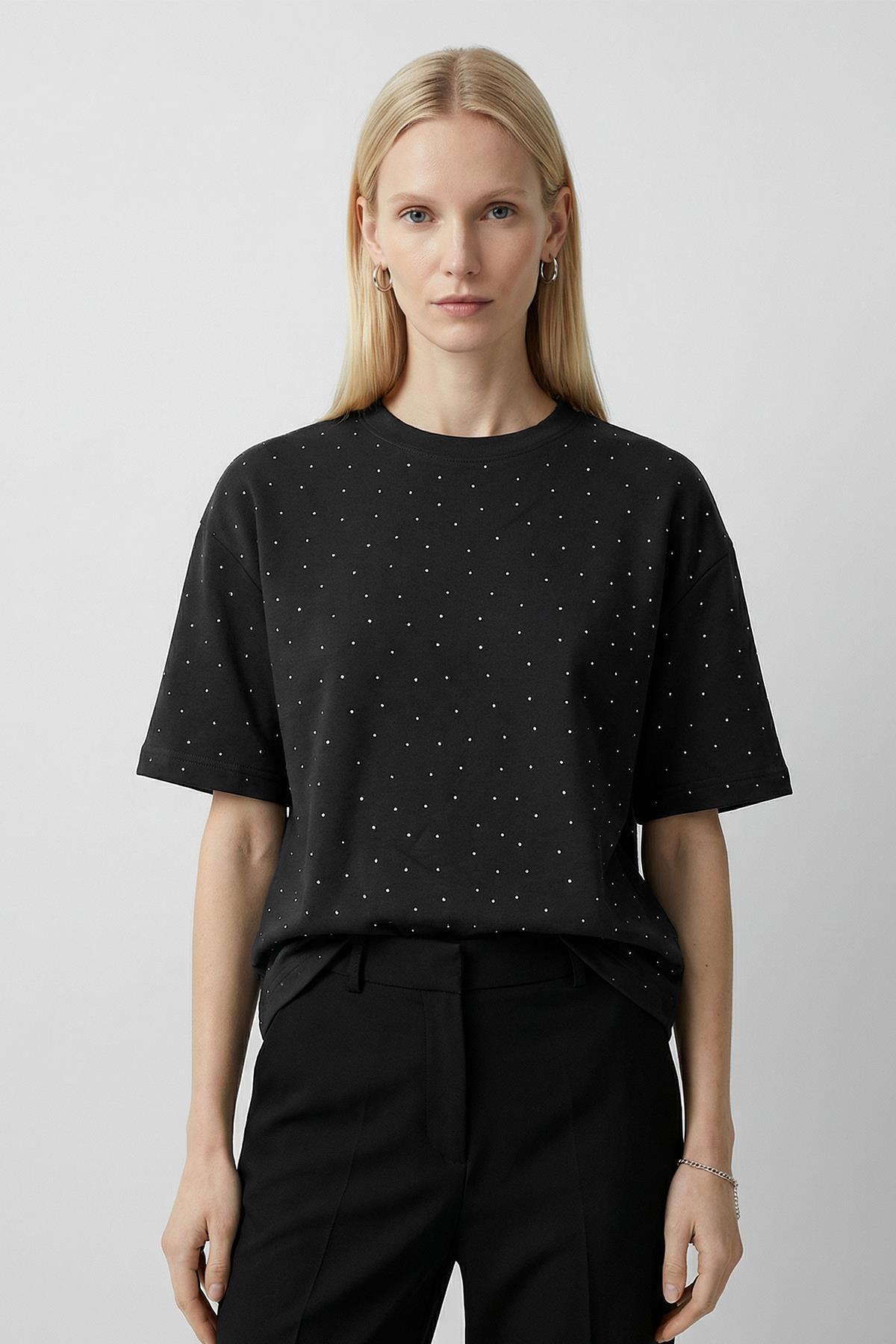 Siyah Taşlı Bisiklet Yaka Tişört 8255