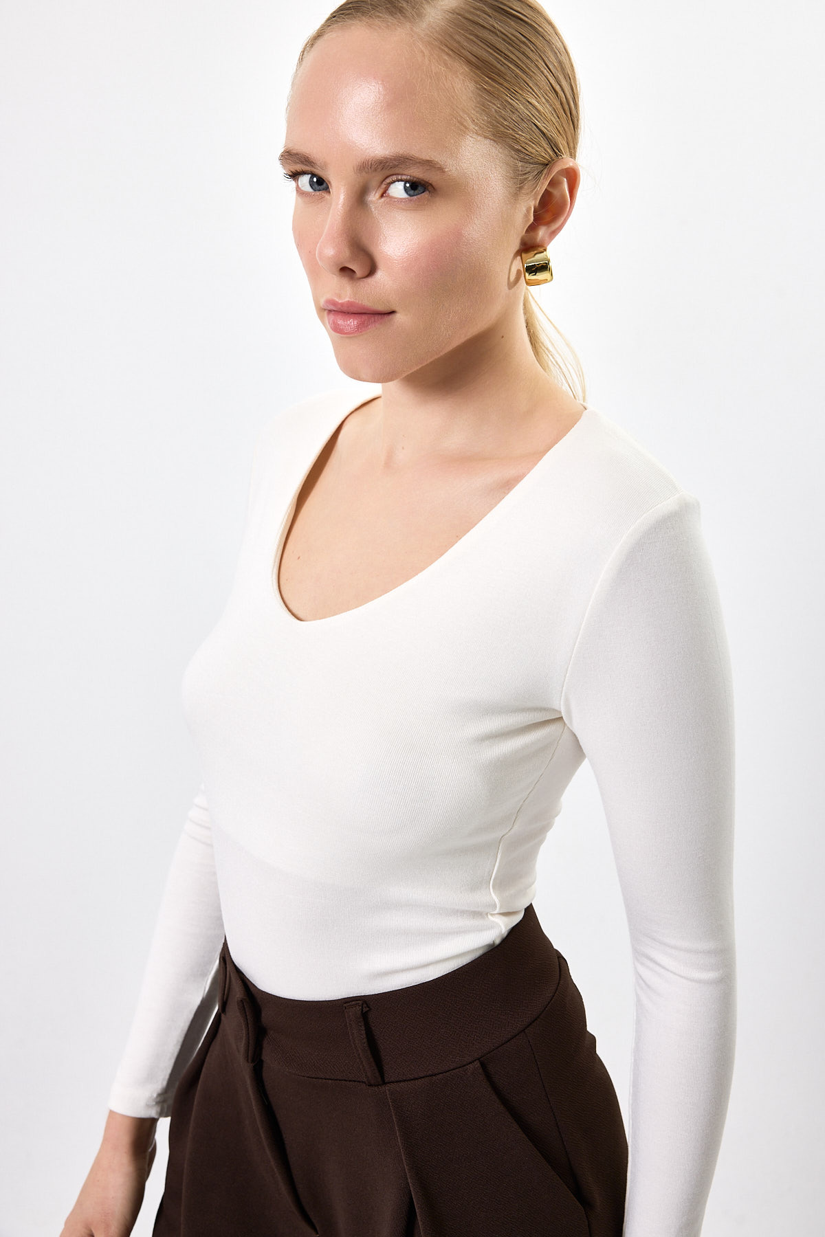 Ekru Fitilli V Yaka Uzun Kollu Kadın Body 8266A
