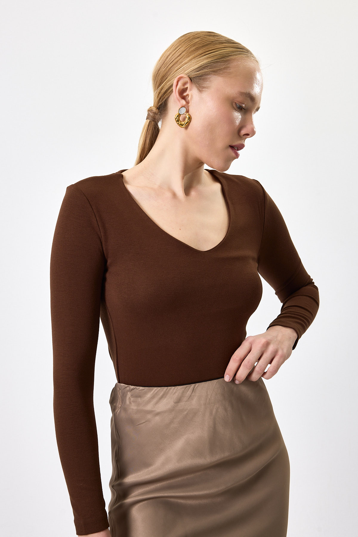 Kahverengi Fitilli V Yaka Uzun Kollu Kadın Body 8266A