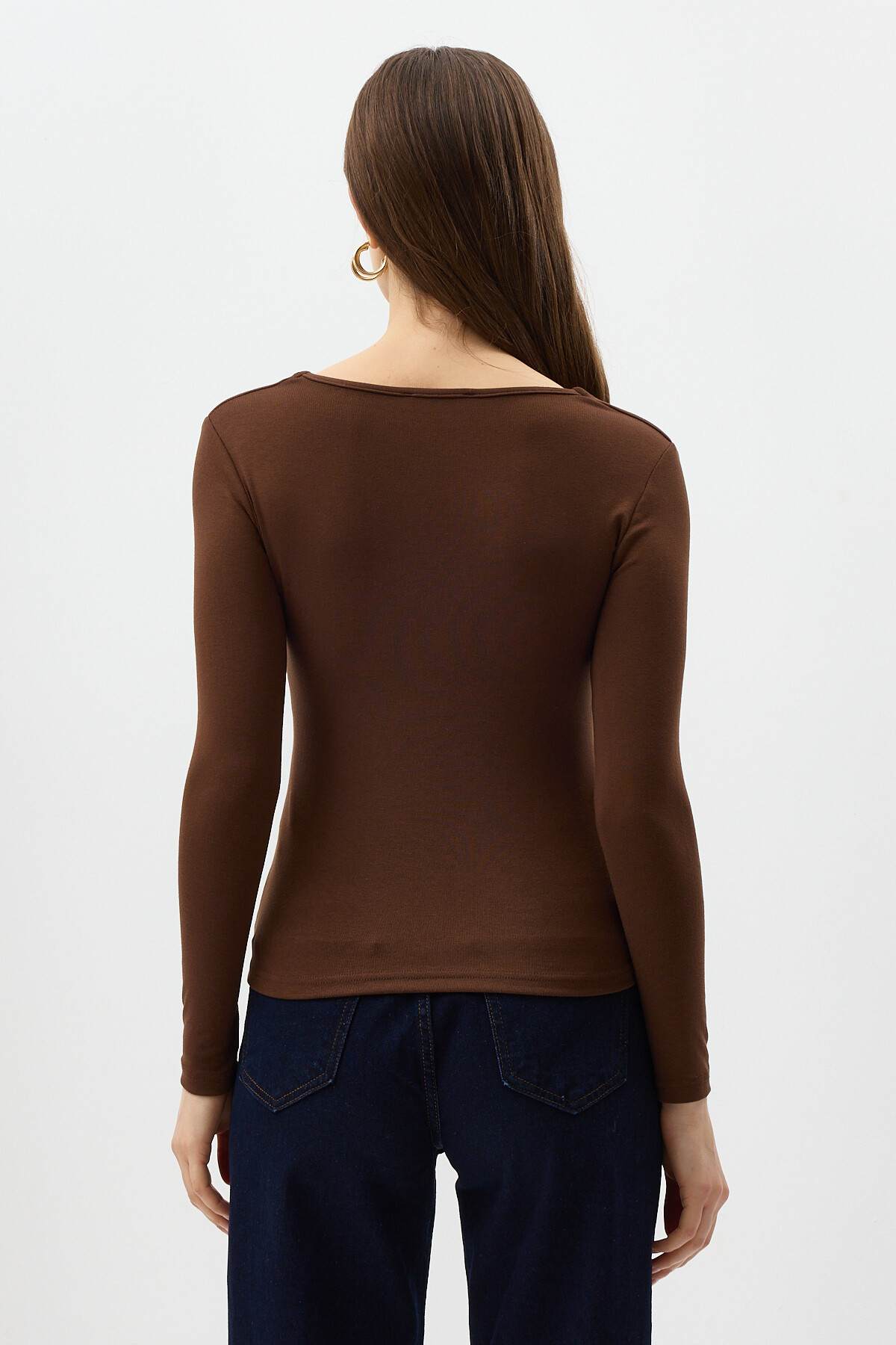 Kahverengi Kare Yaka Uzun Kollu Fitilli Kadın Body 8267A