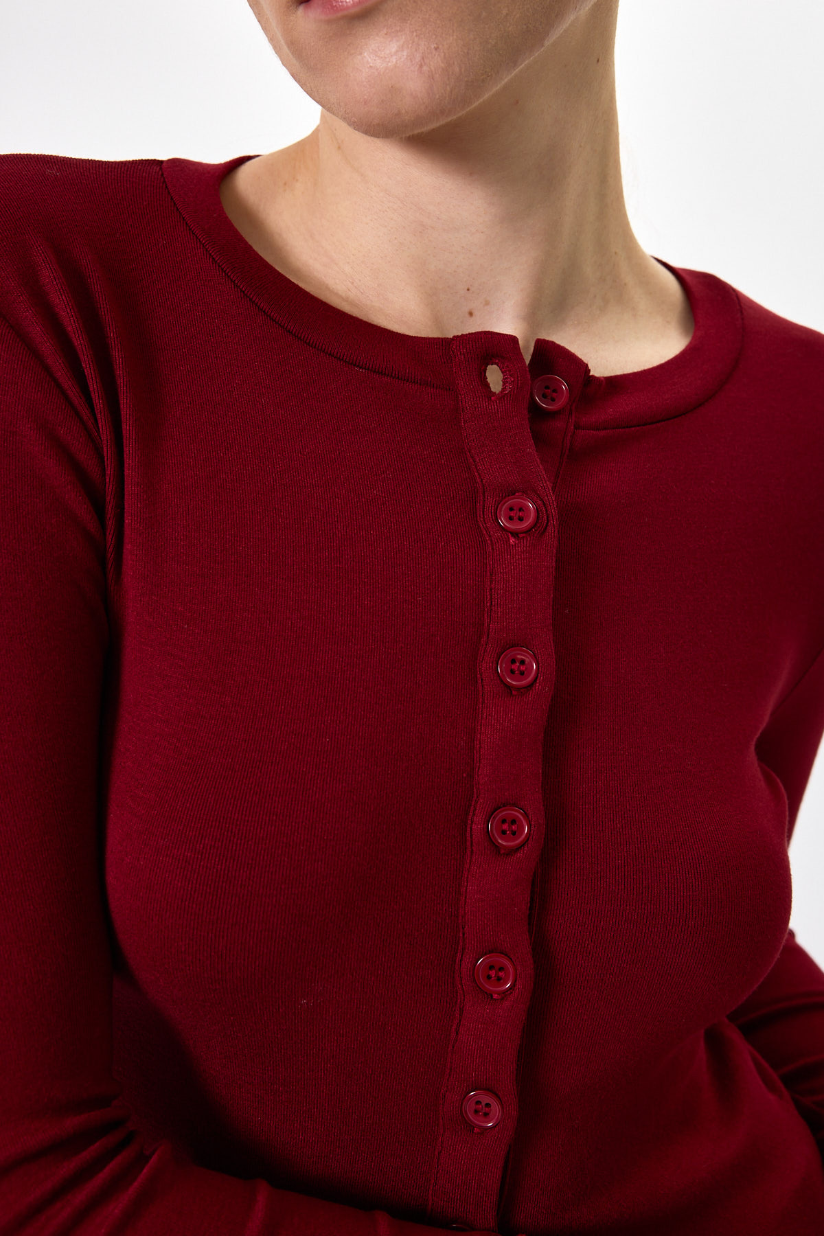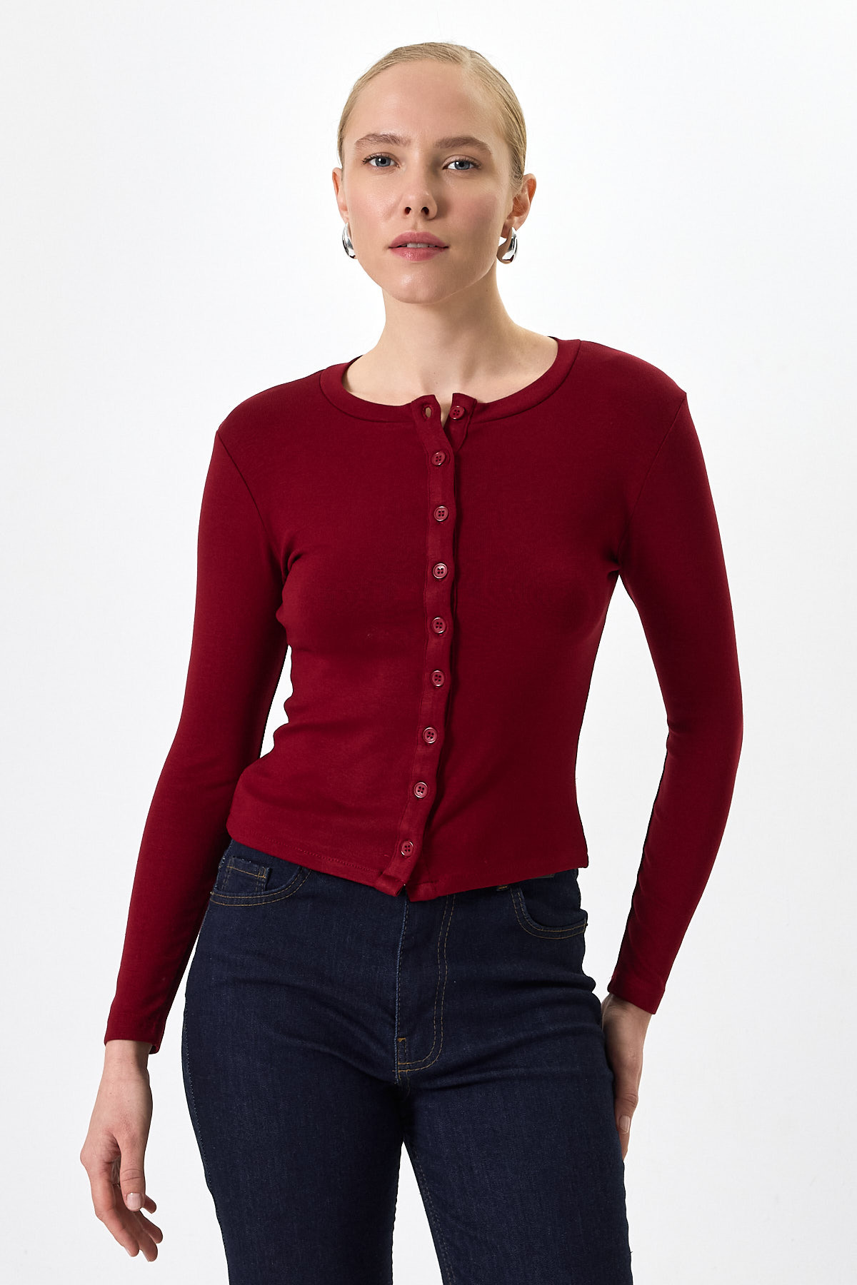 Bordo Ön Düğmeli Bisiklet Yaka Uzun Kollu Fitilli Kadın Body 8270A