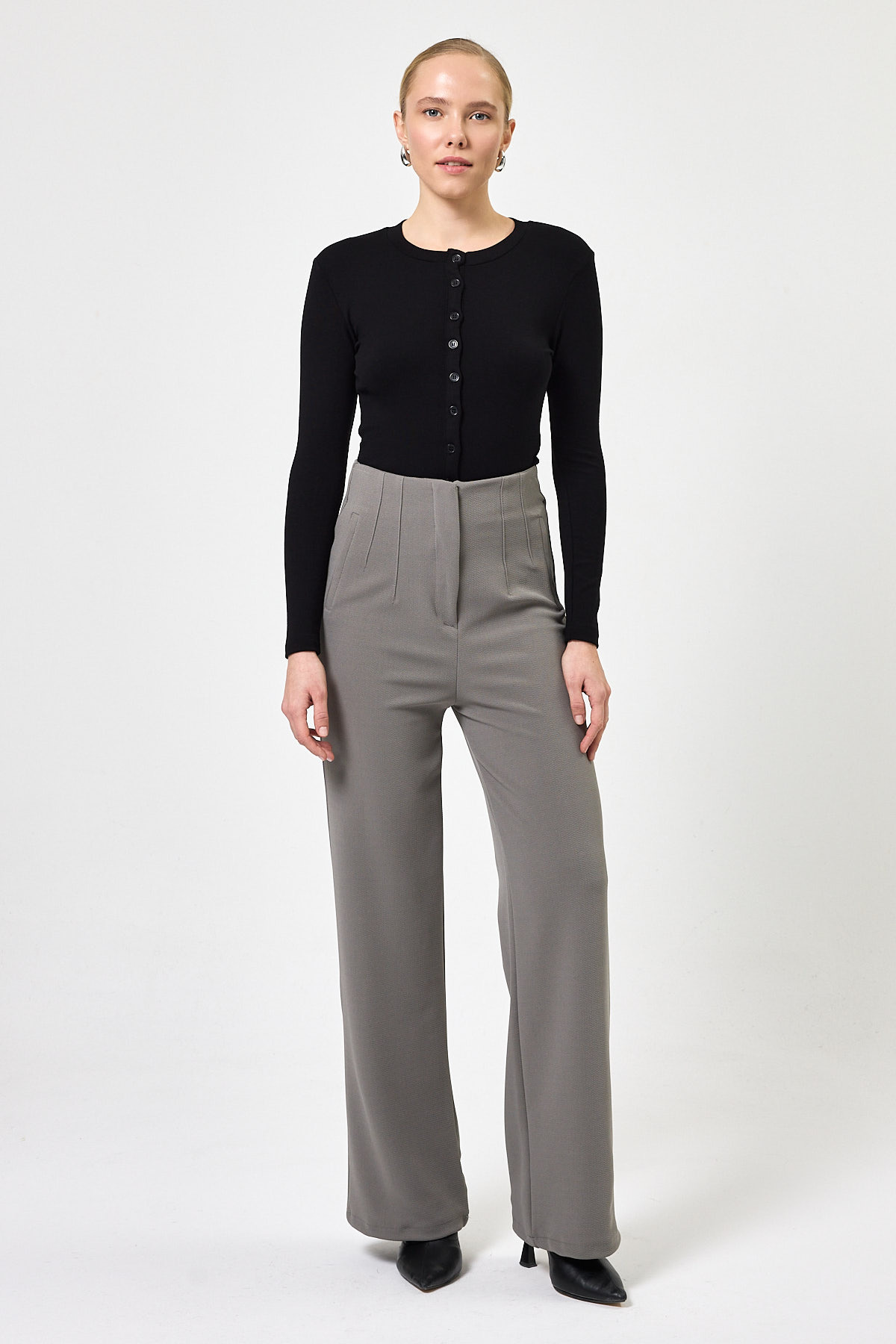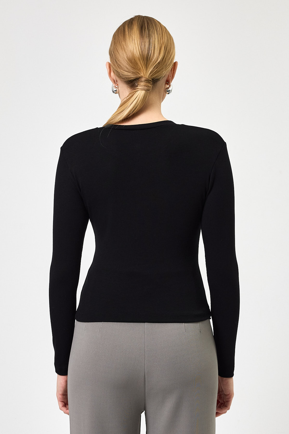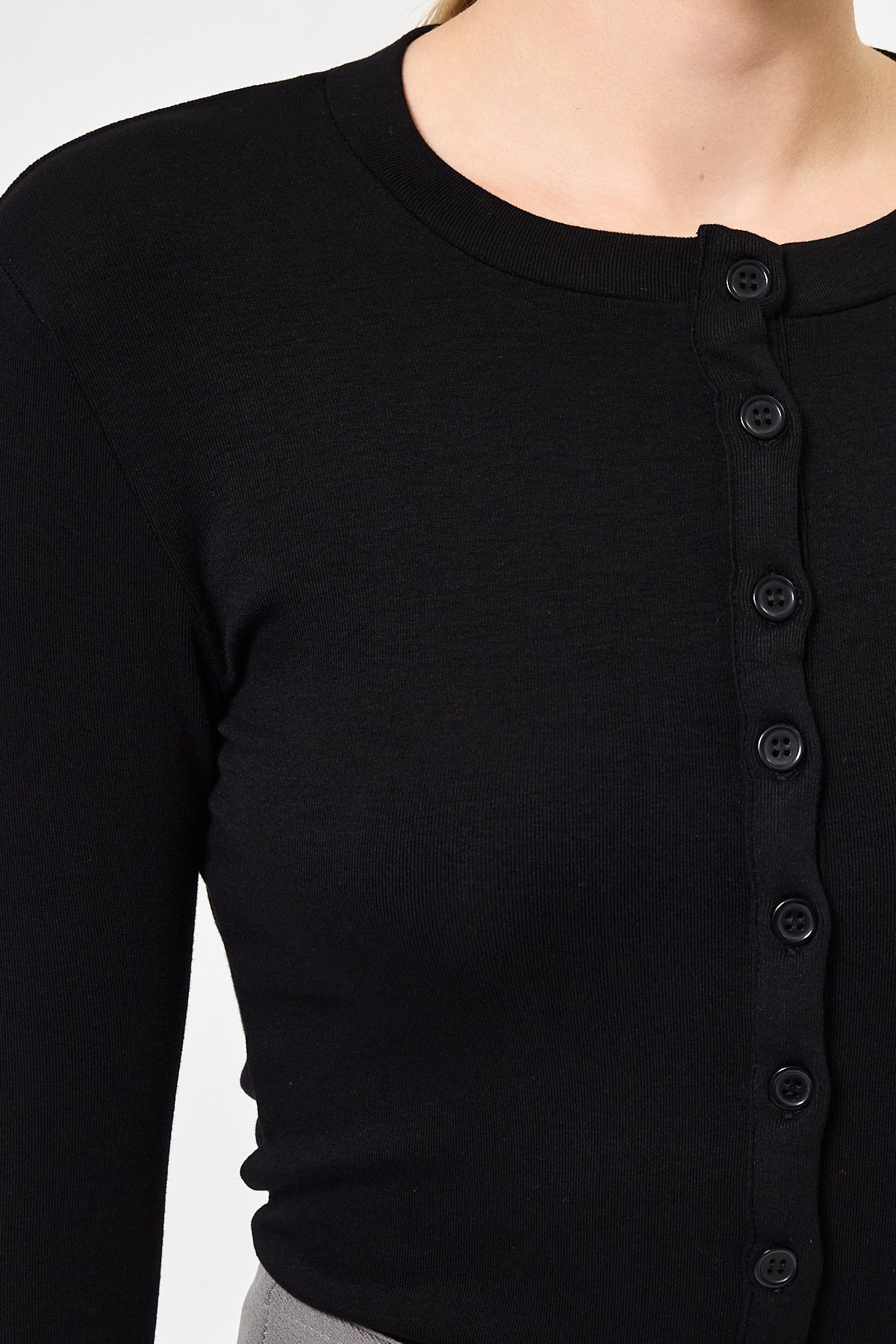 Siyah Ön Düğmeli Bisiklet Yaka Uzun Kollu Fitilli Kadın Body 8270A