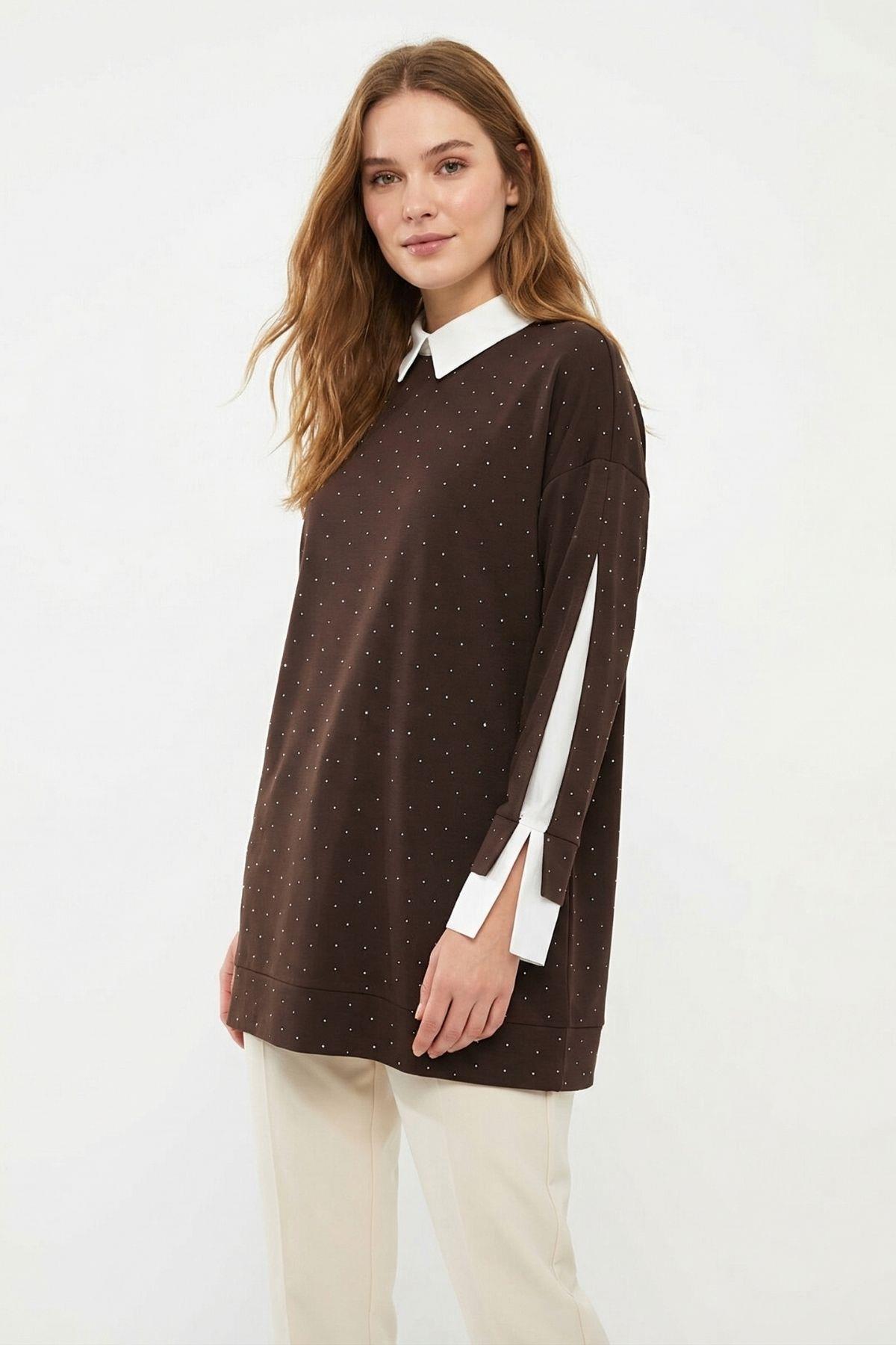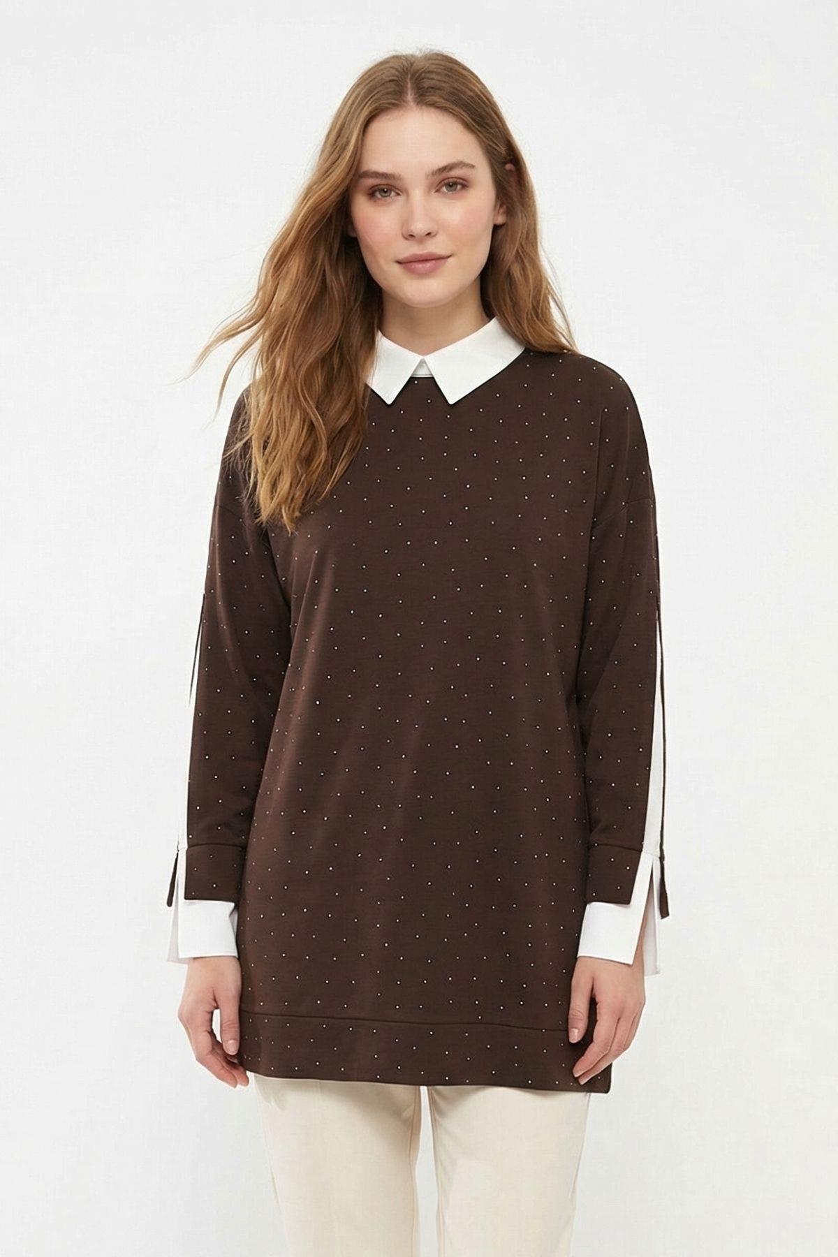 8274 Gömlek Yaka Taşlı Kol Detay Tunik Acı Kahve