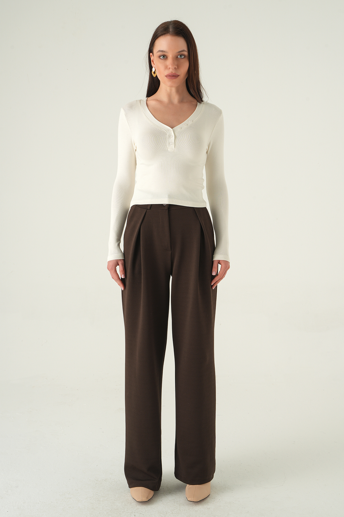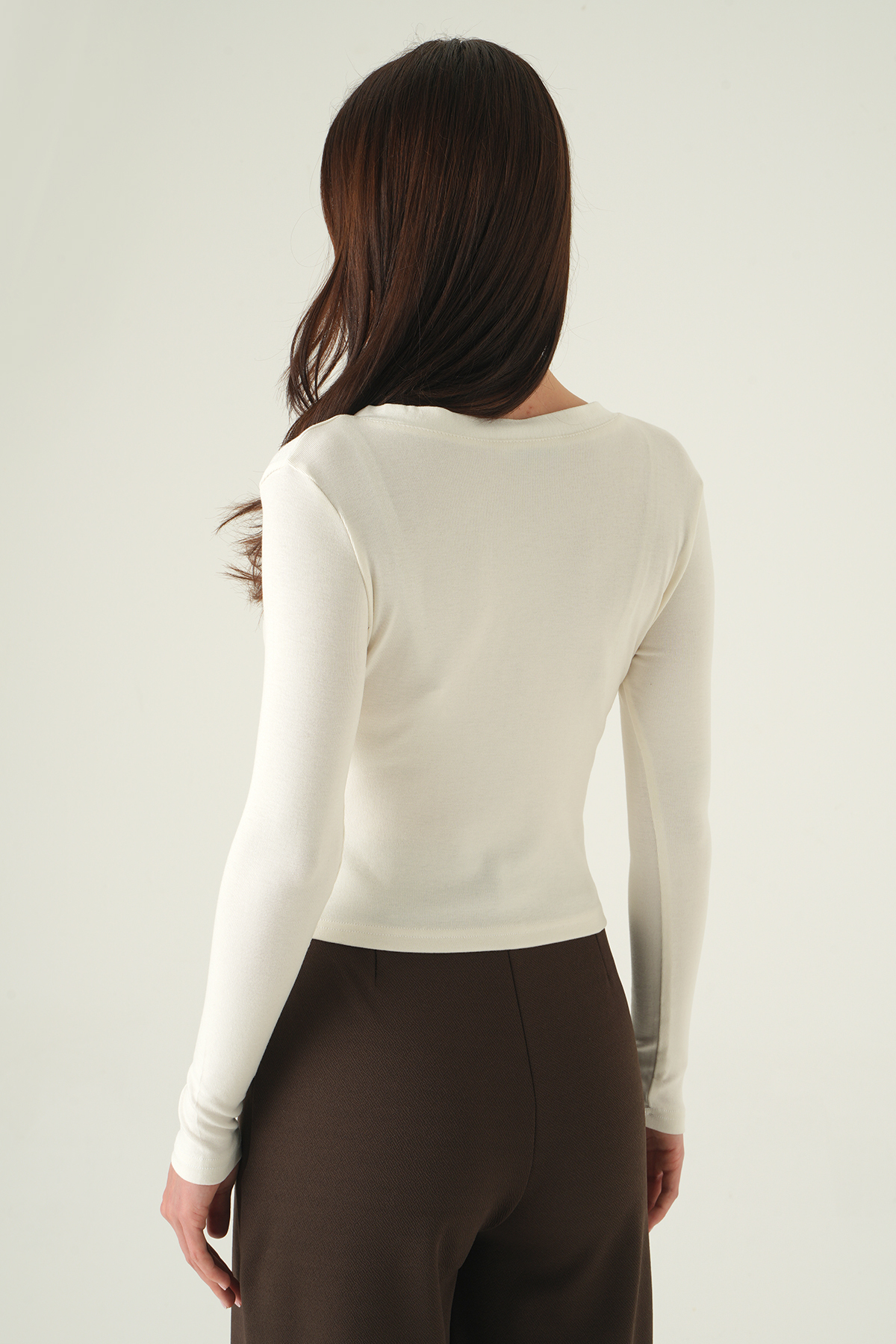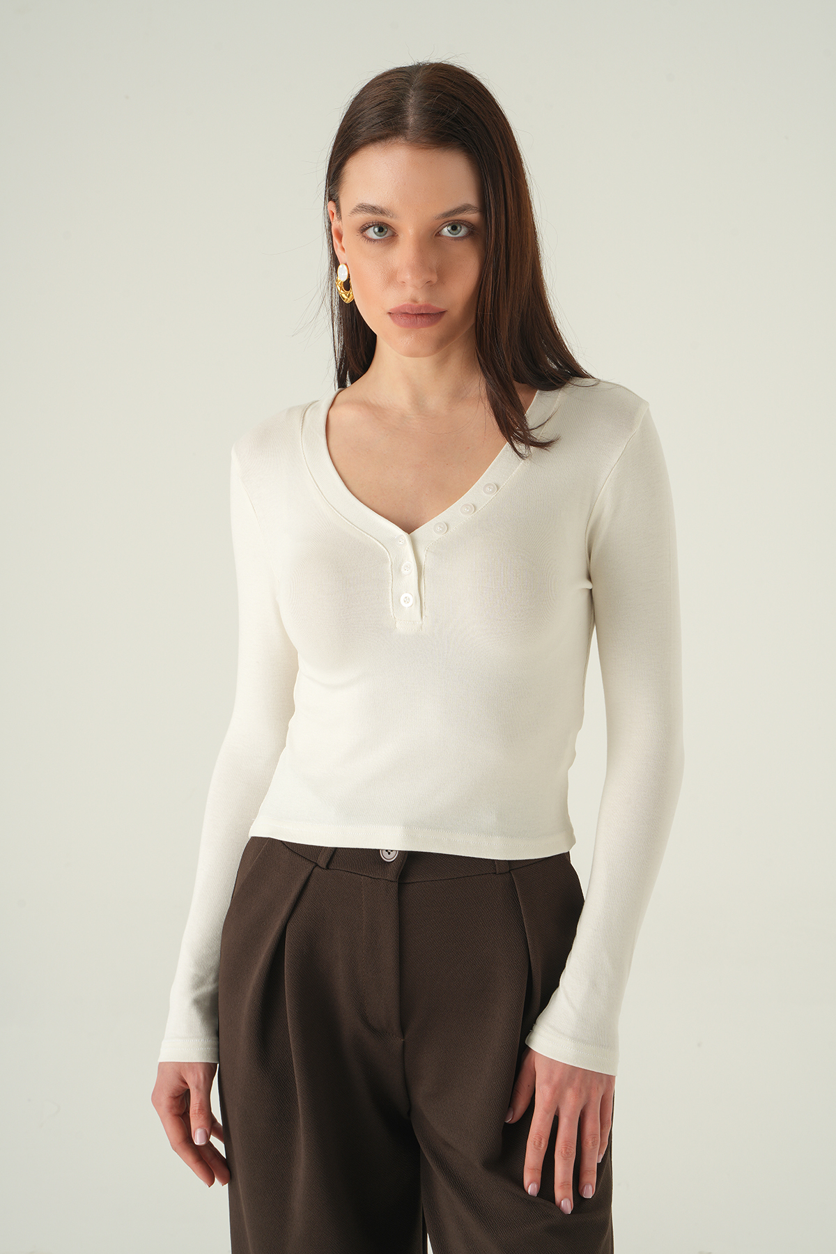 Ekru V Yaka Düğmeli Badi 8299A