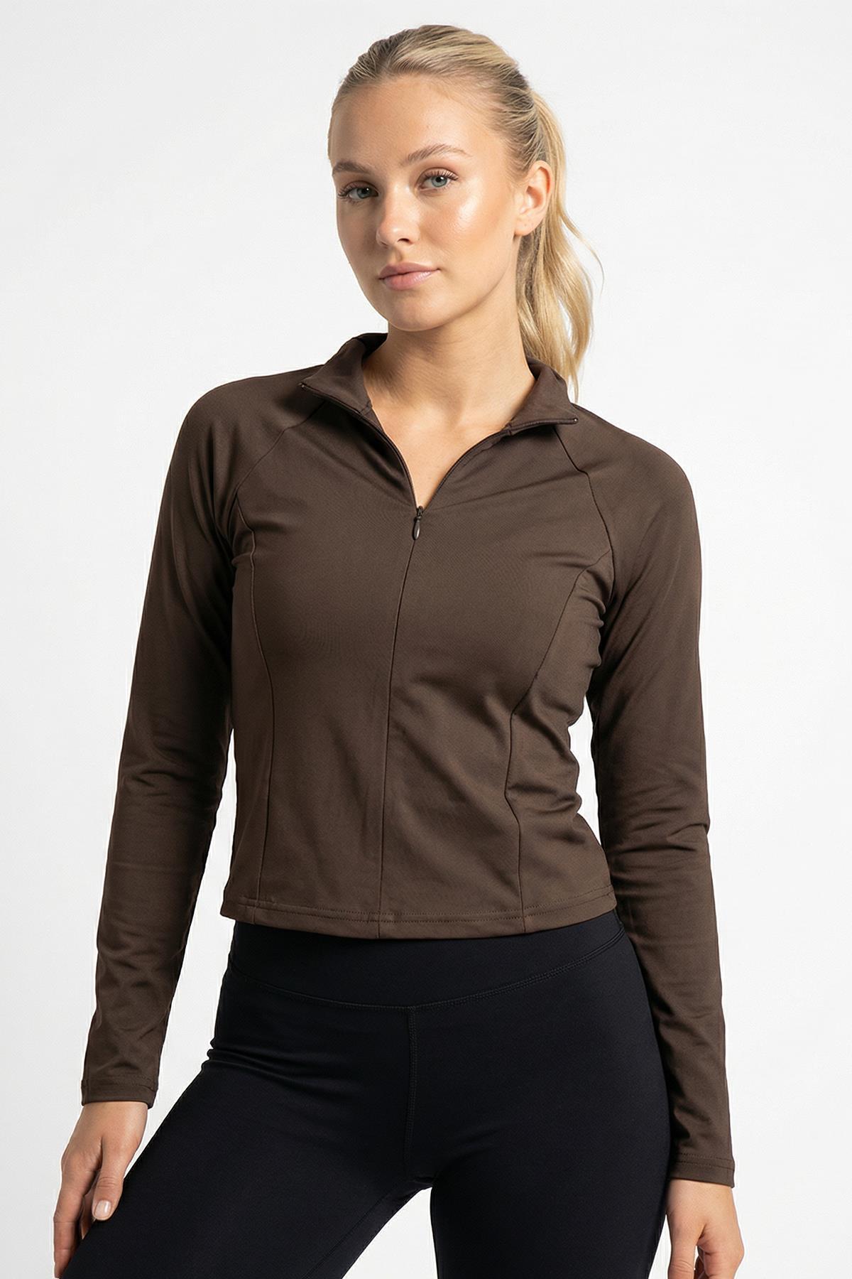 8334A Ön Fermuarlı Uzun Kol Bluz Kahve