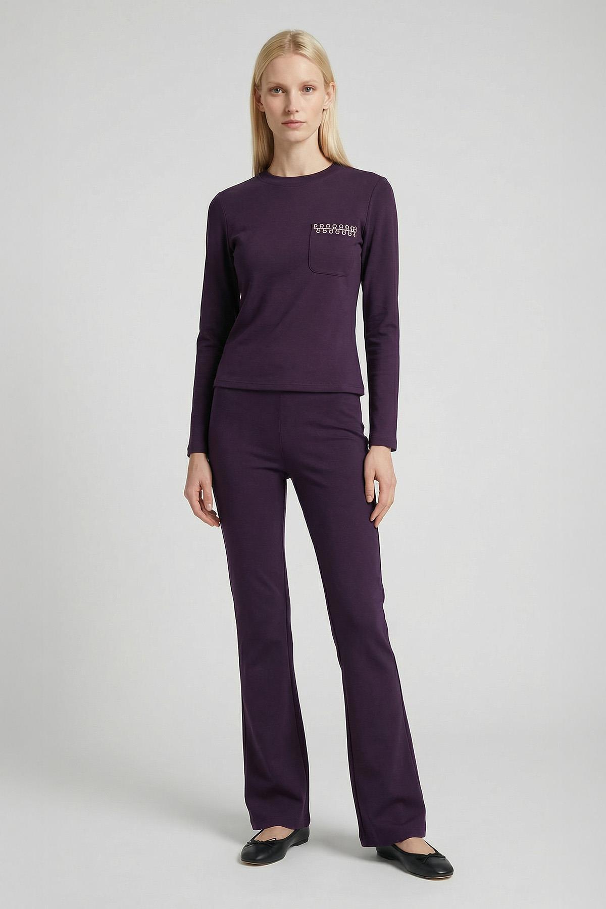 8344A Bisiklet Yaka Cep Nakışlı Badi Mürdüm