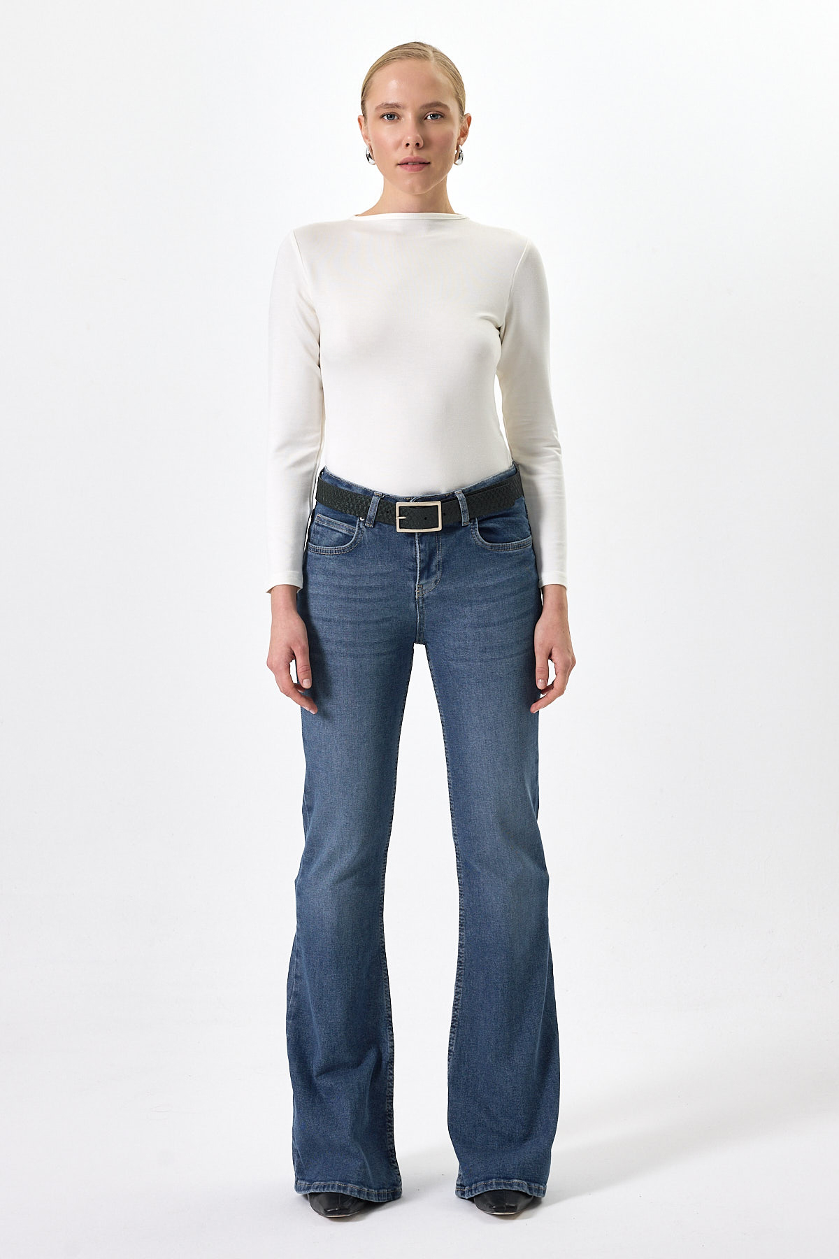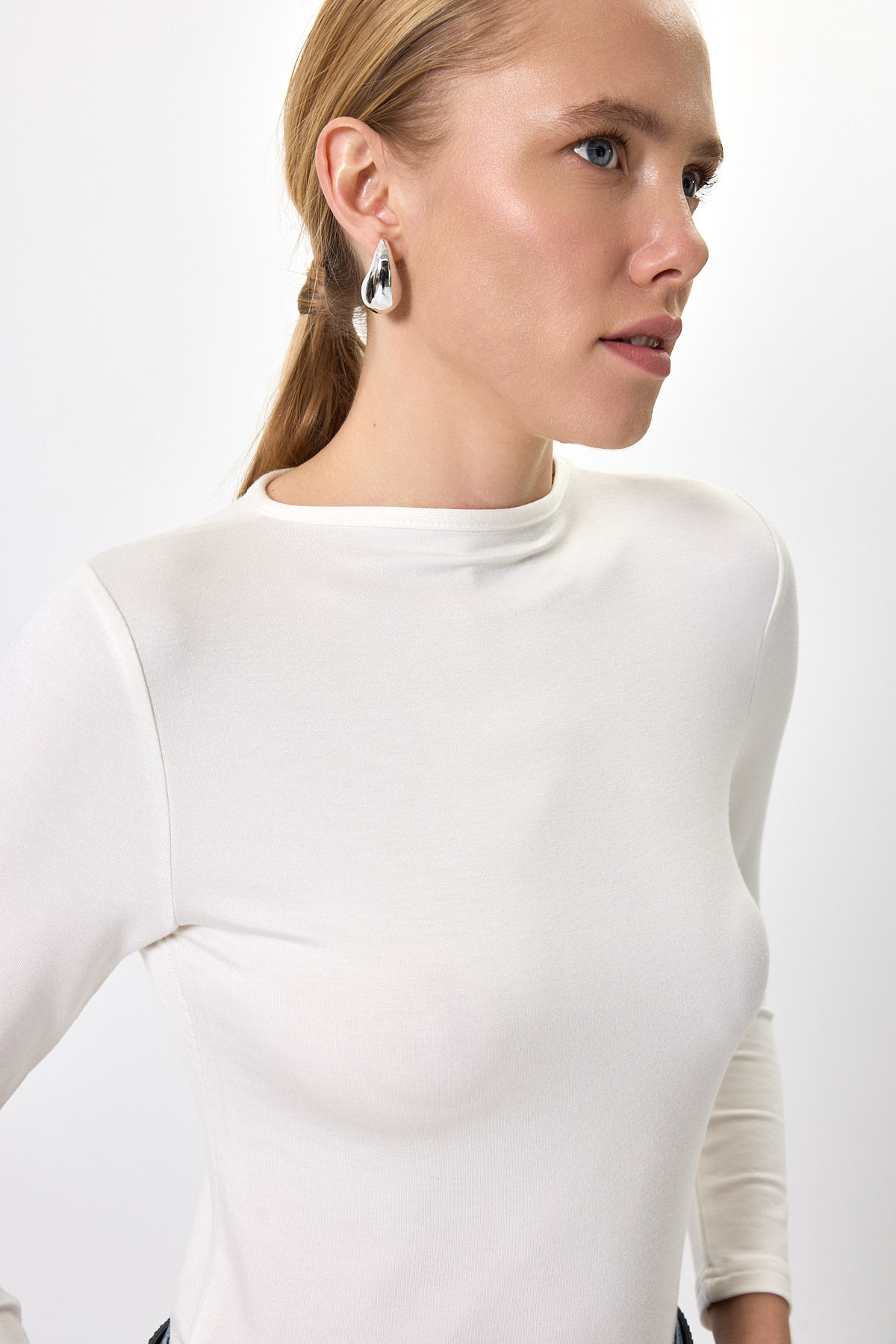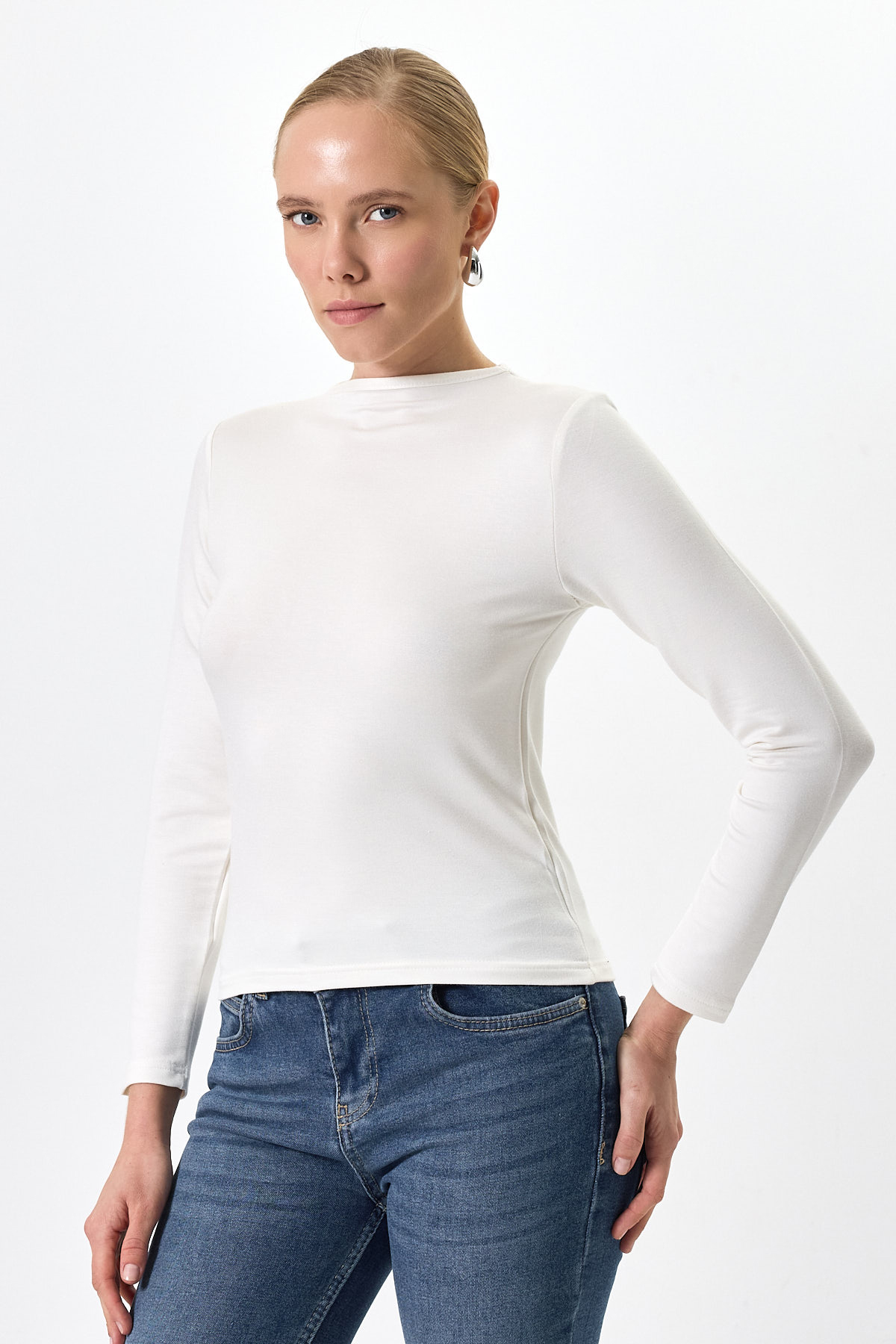 Ekru Bisiklet Yaka Uzun Kollu Basic Kadın Bluz 8393A