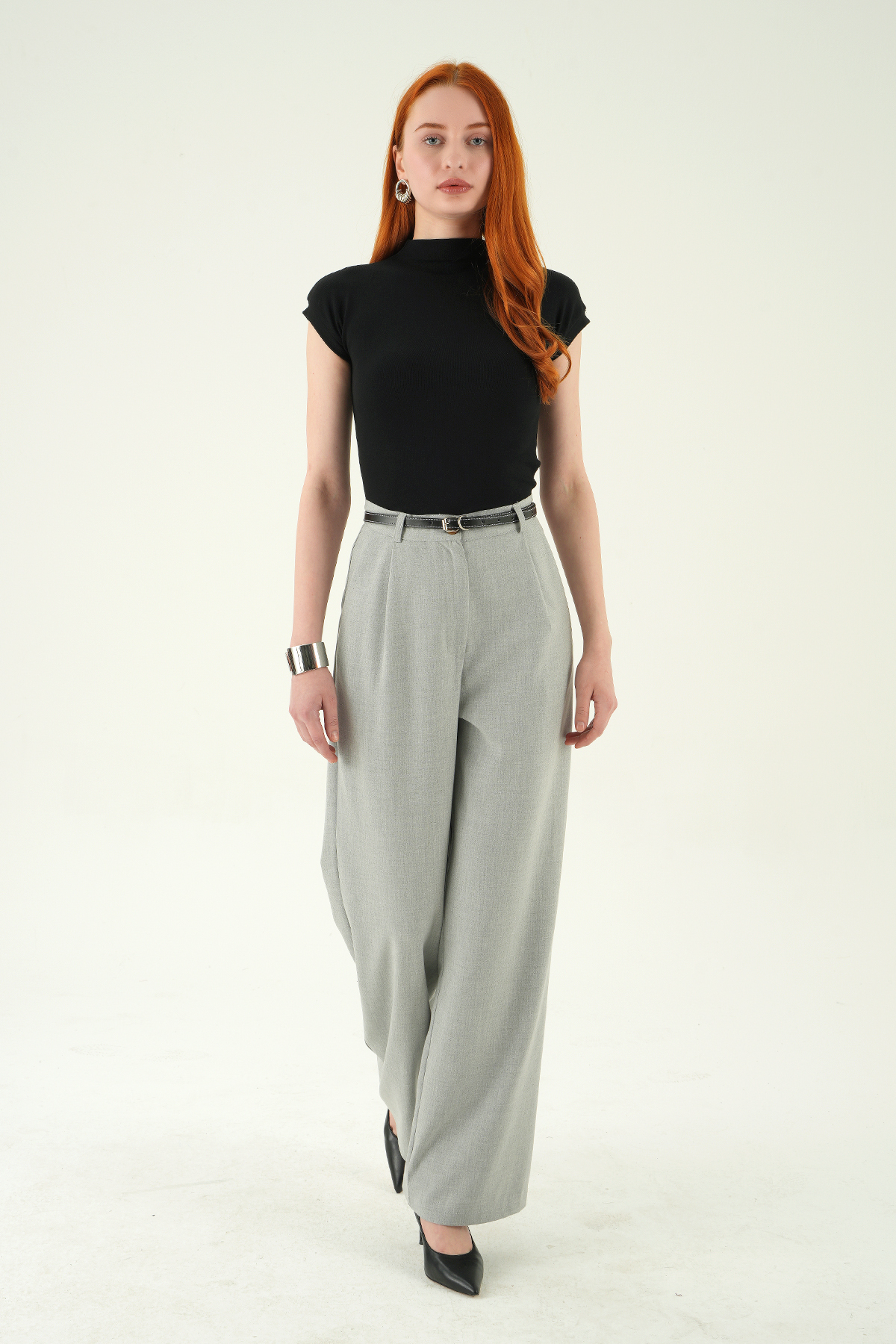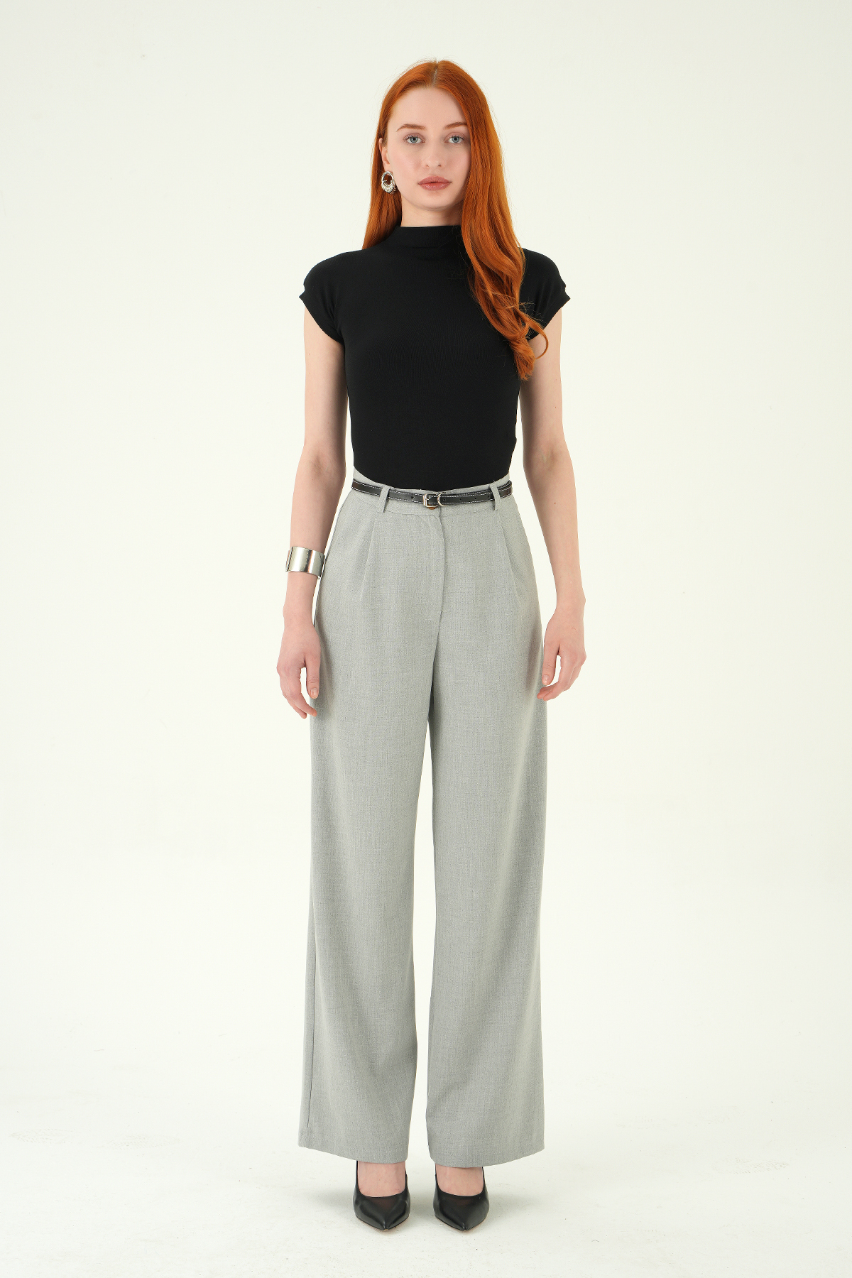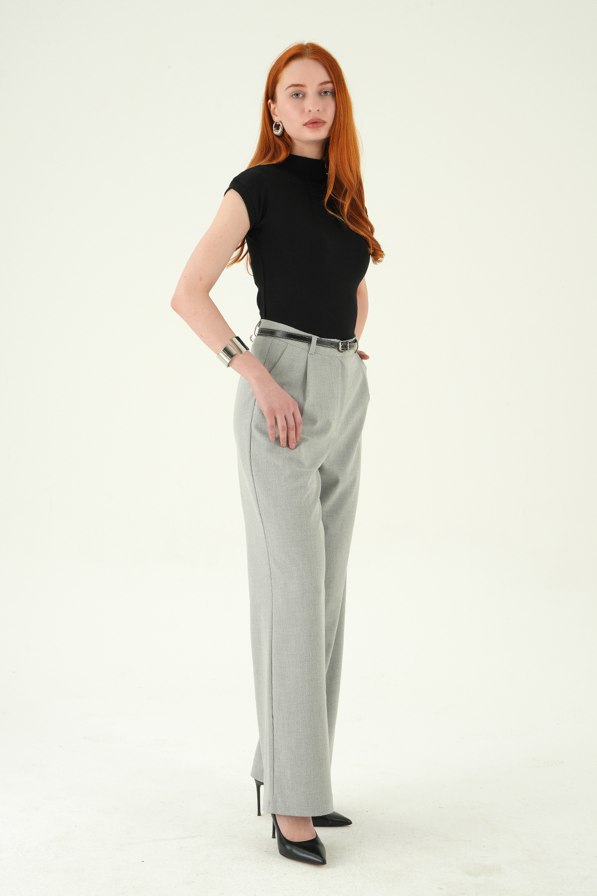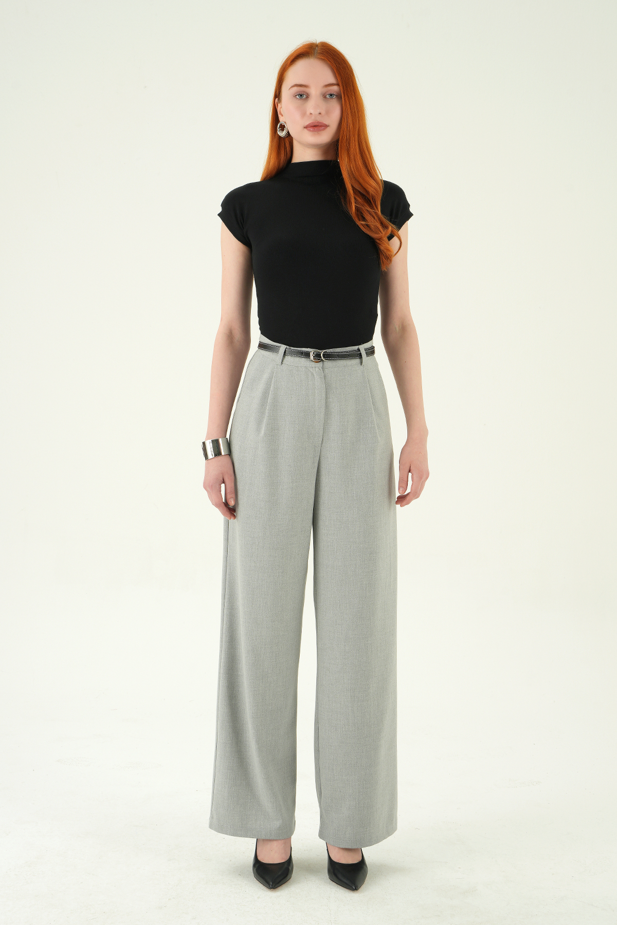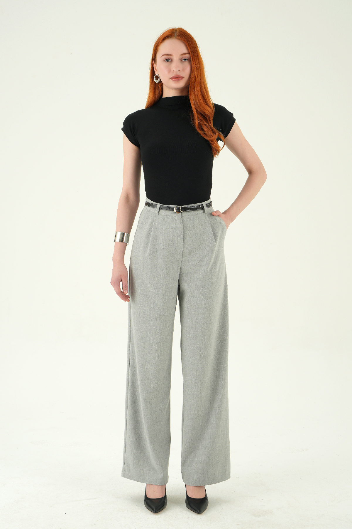 Gri Ön Pileli Kemerli Pantolon 8399A