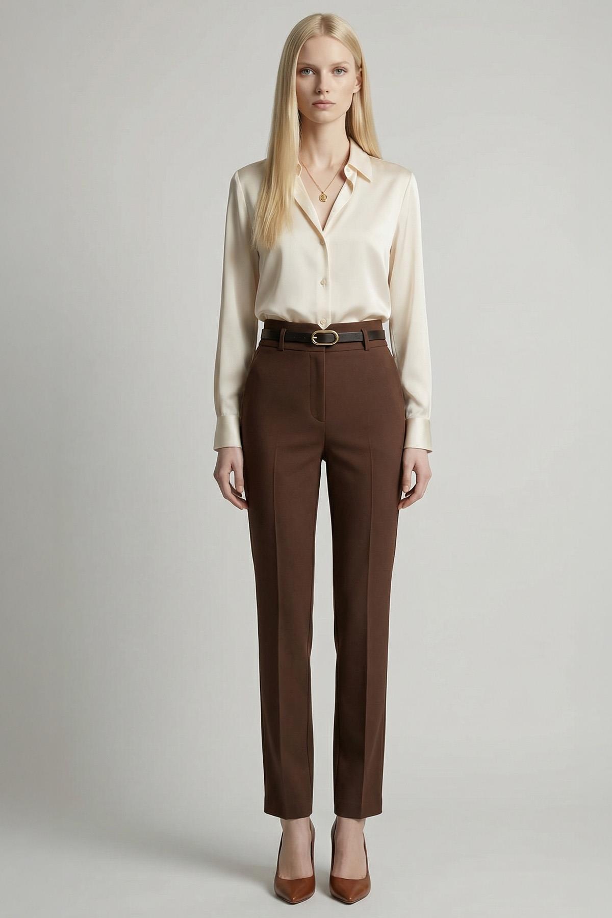 8404A Bel V Kesim Kemerli Pantolon Kahve
