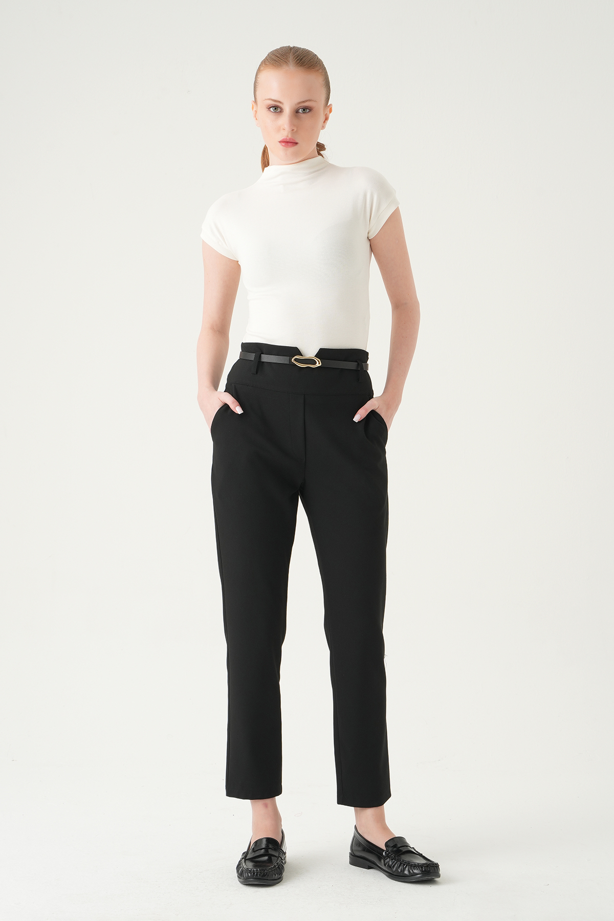 Siyah Bel V Kesim Kemerli Pantolon 8404A