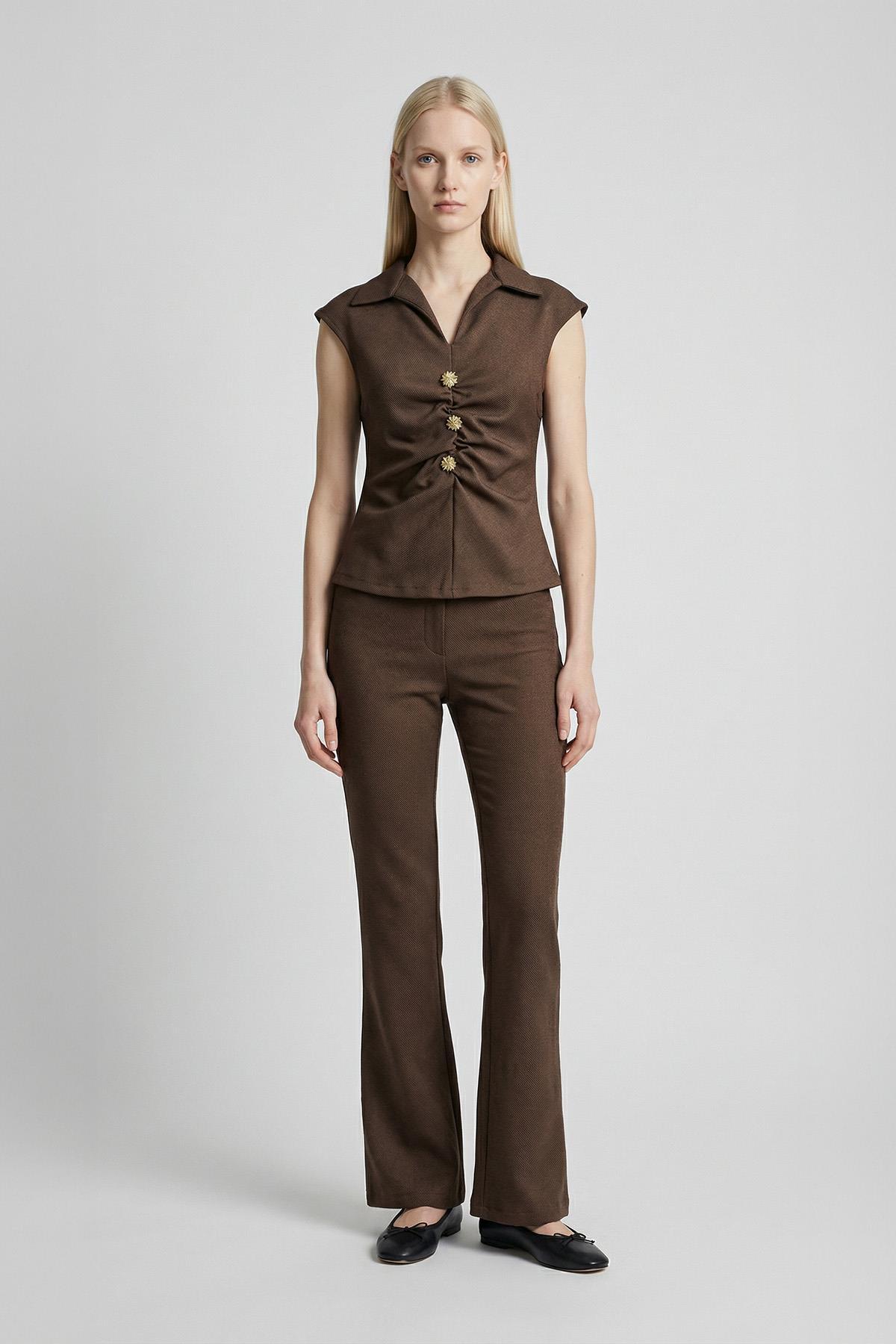 8406A Ön Düğmeli Bluz Kahve
