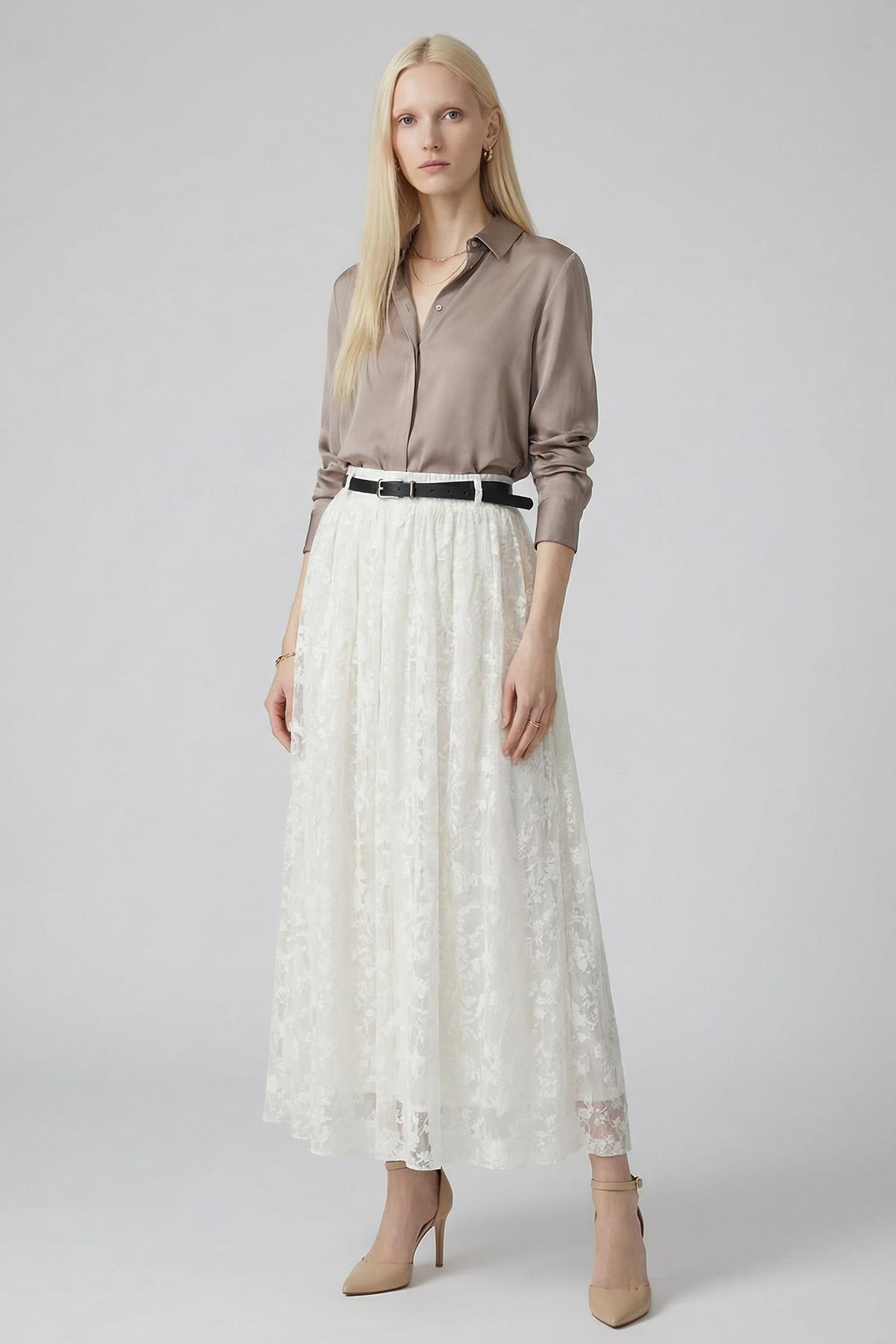 Ekru Kemerli Flok Desen Etek 8471A