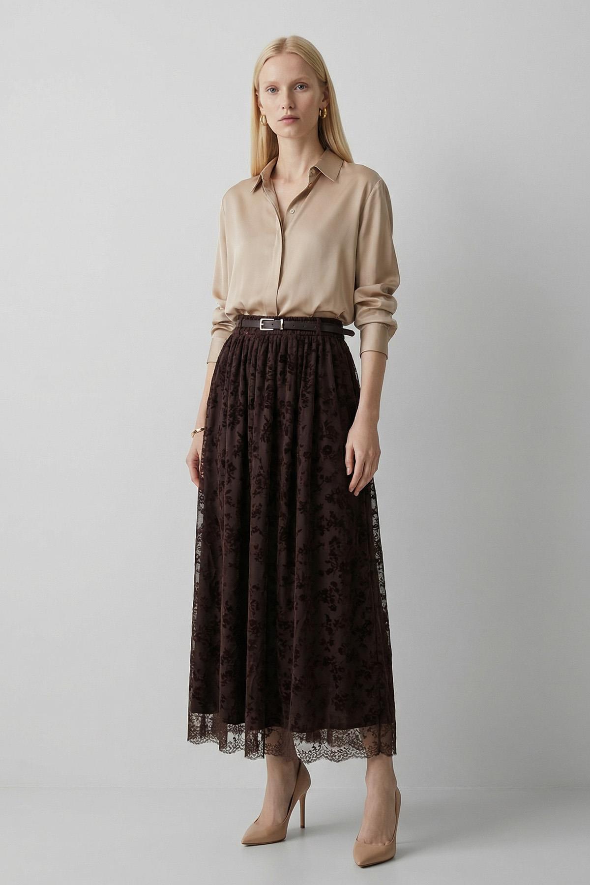 Kahve Kemerli Flok Desen Etek 8471A