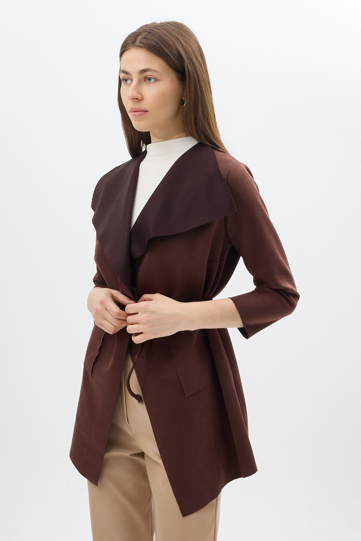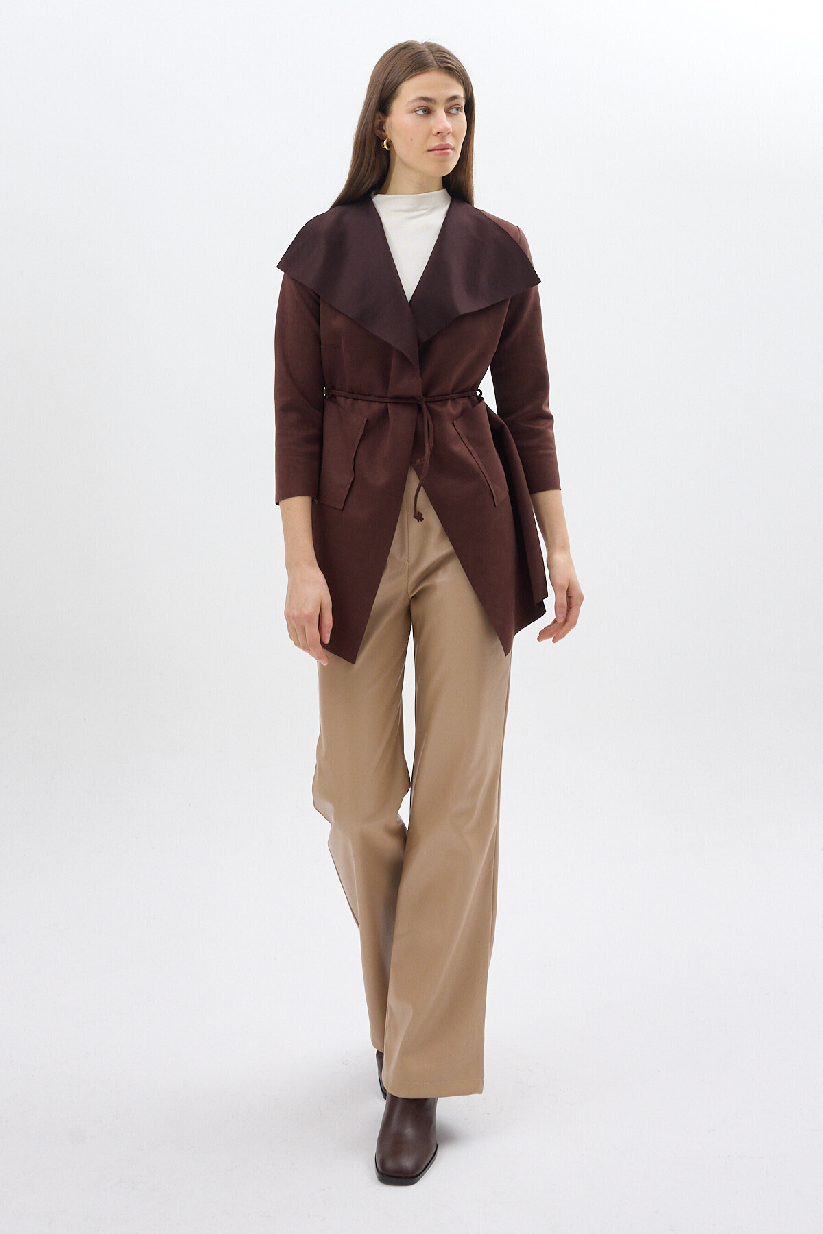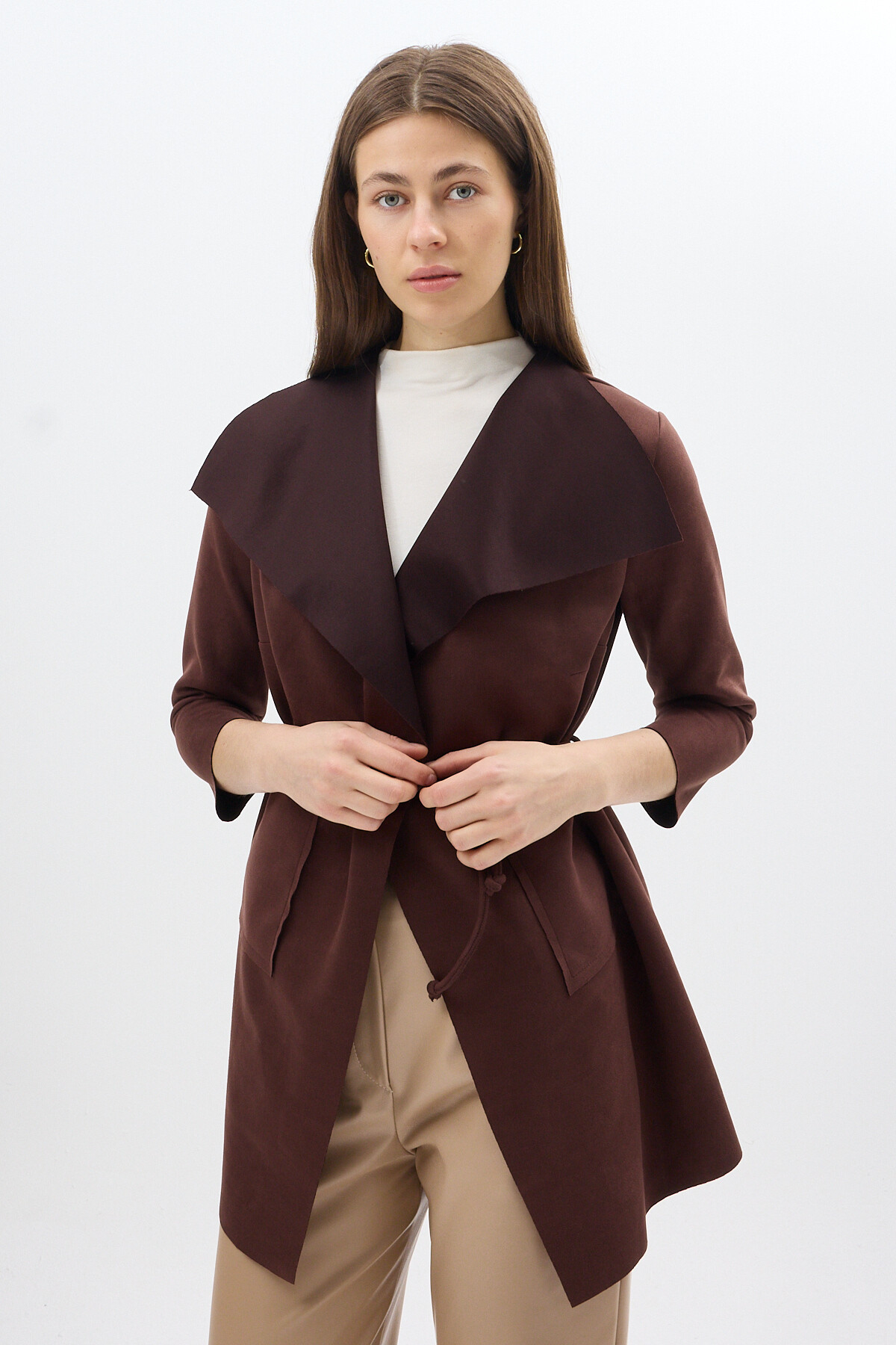 Kahverengi Bel Bağlamalı Şal Yaka Kadın Kaban 8472