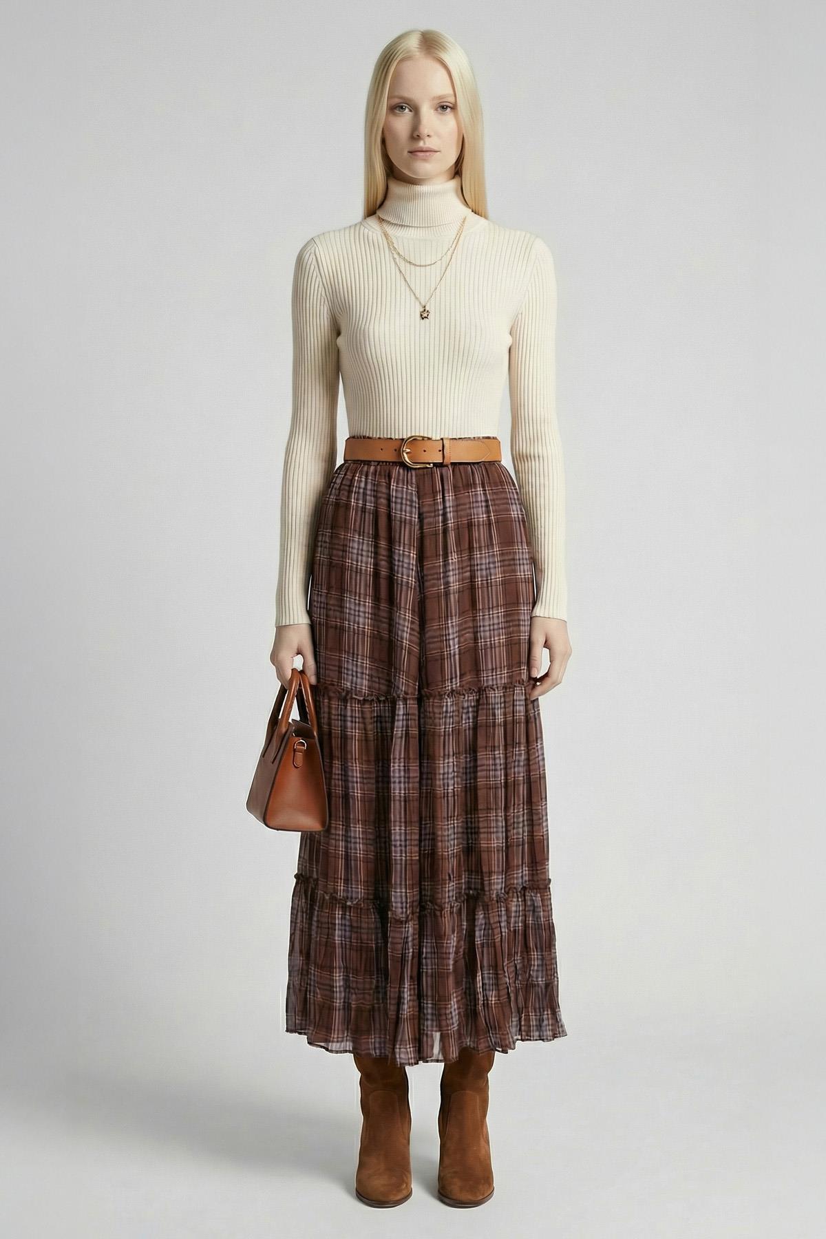 8458A Kemerli Şifon Etek Kahve - RAYS