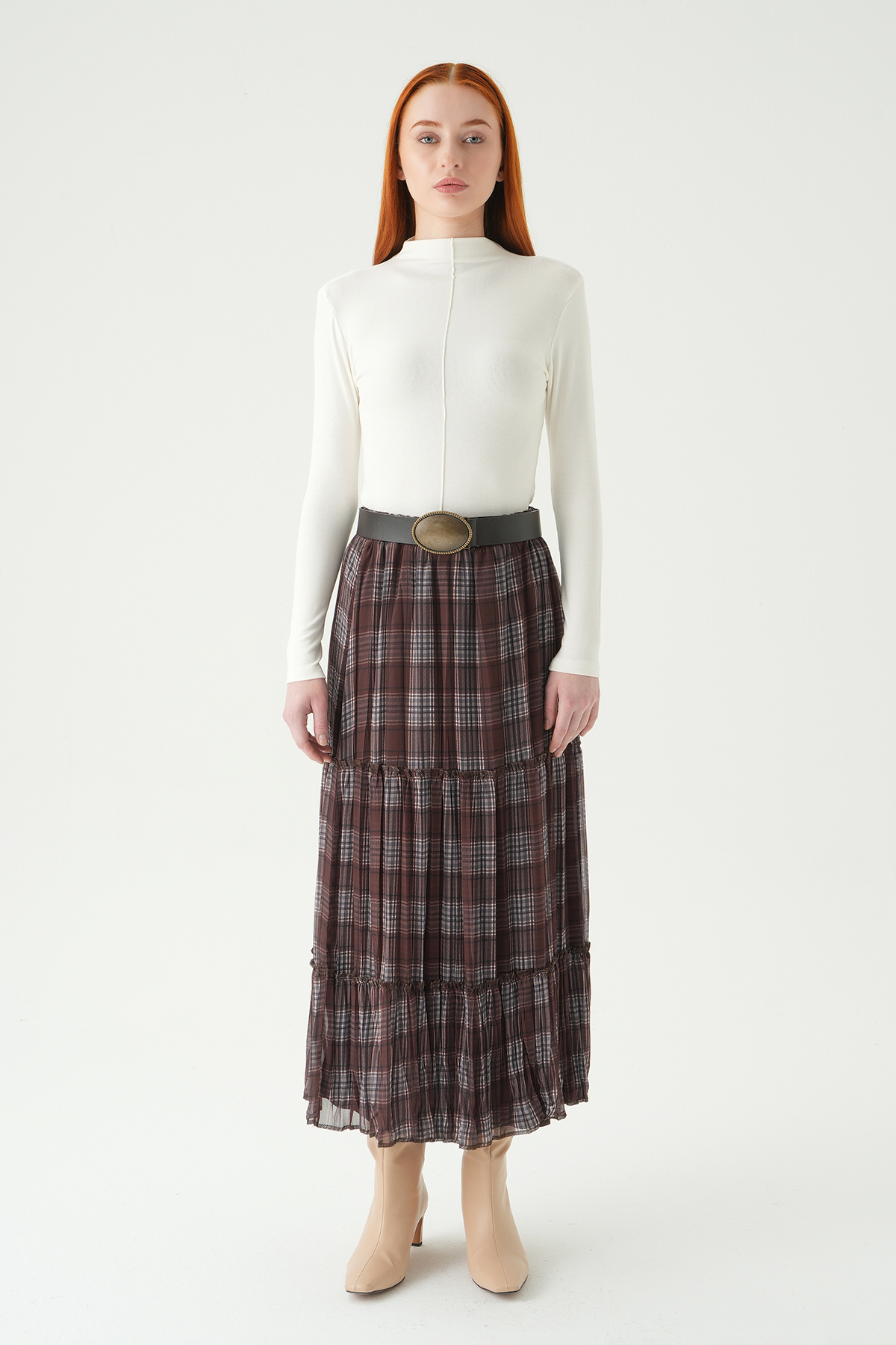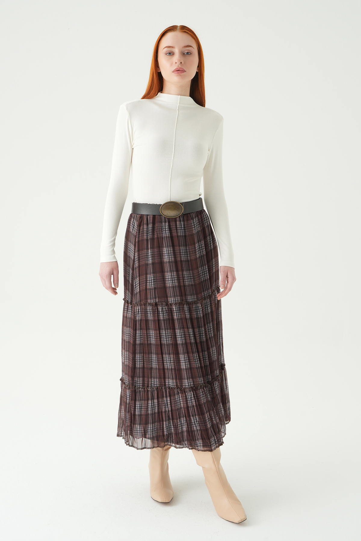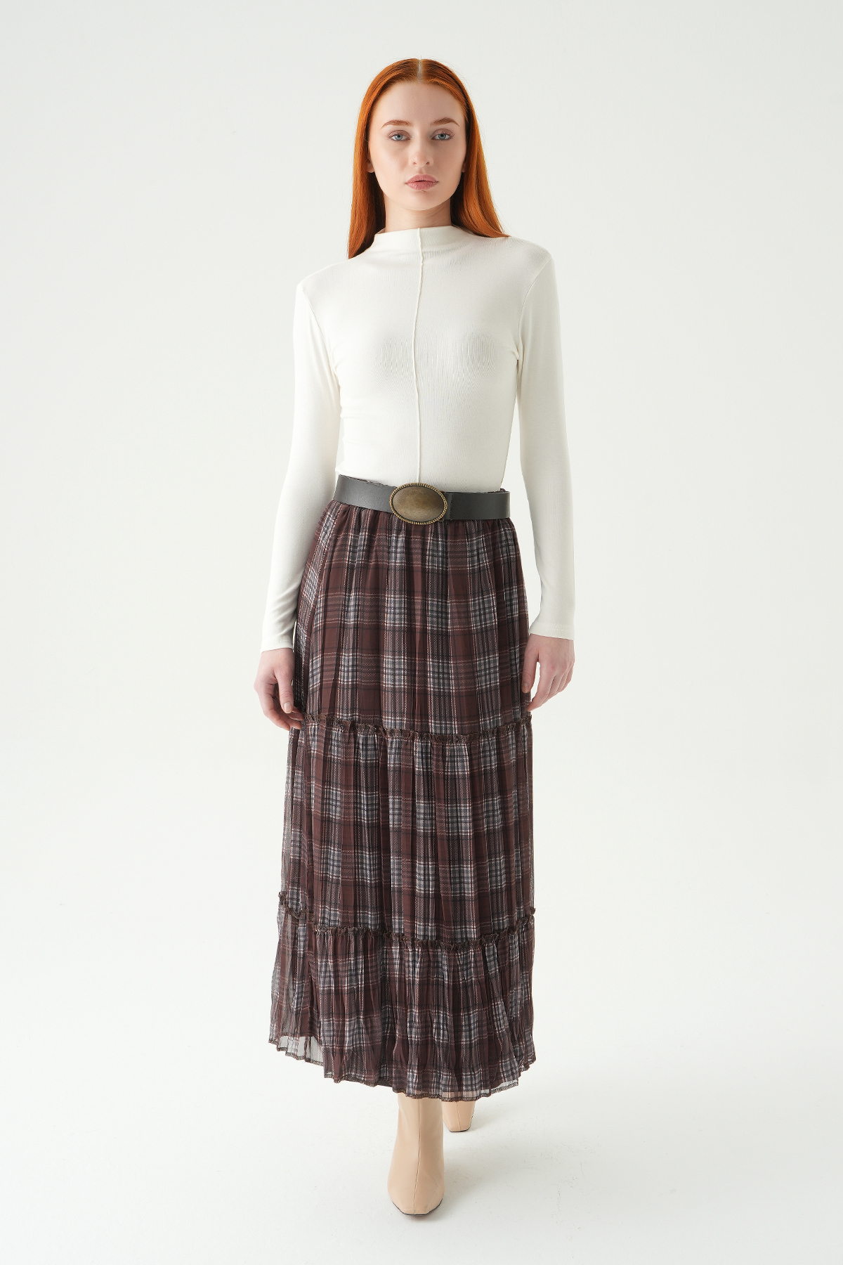 Acı Kahve Desenli Kemerli Etek 1344 - RAYS