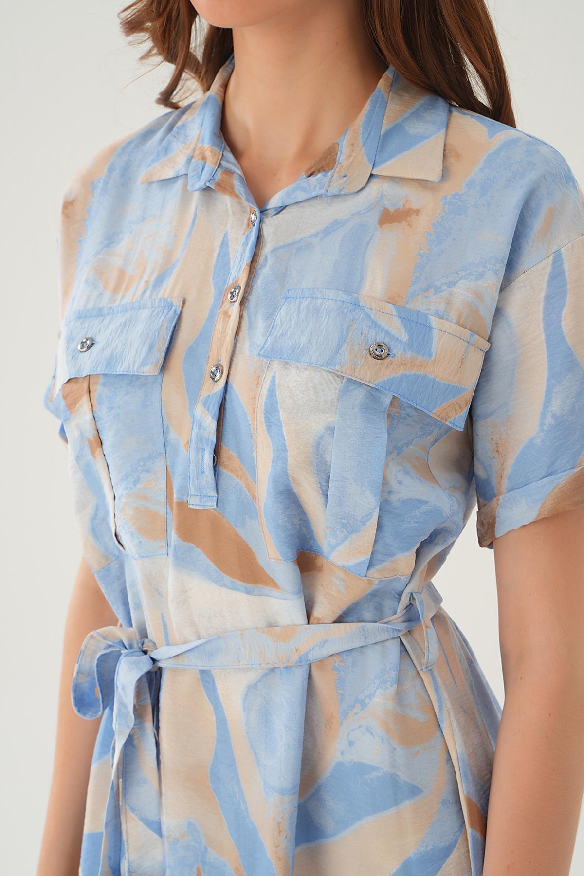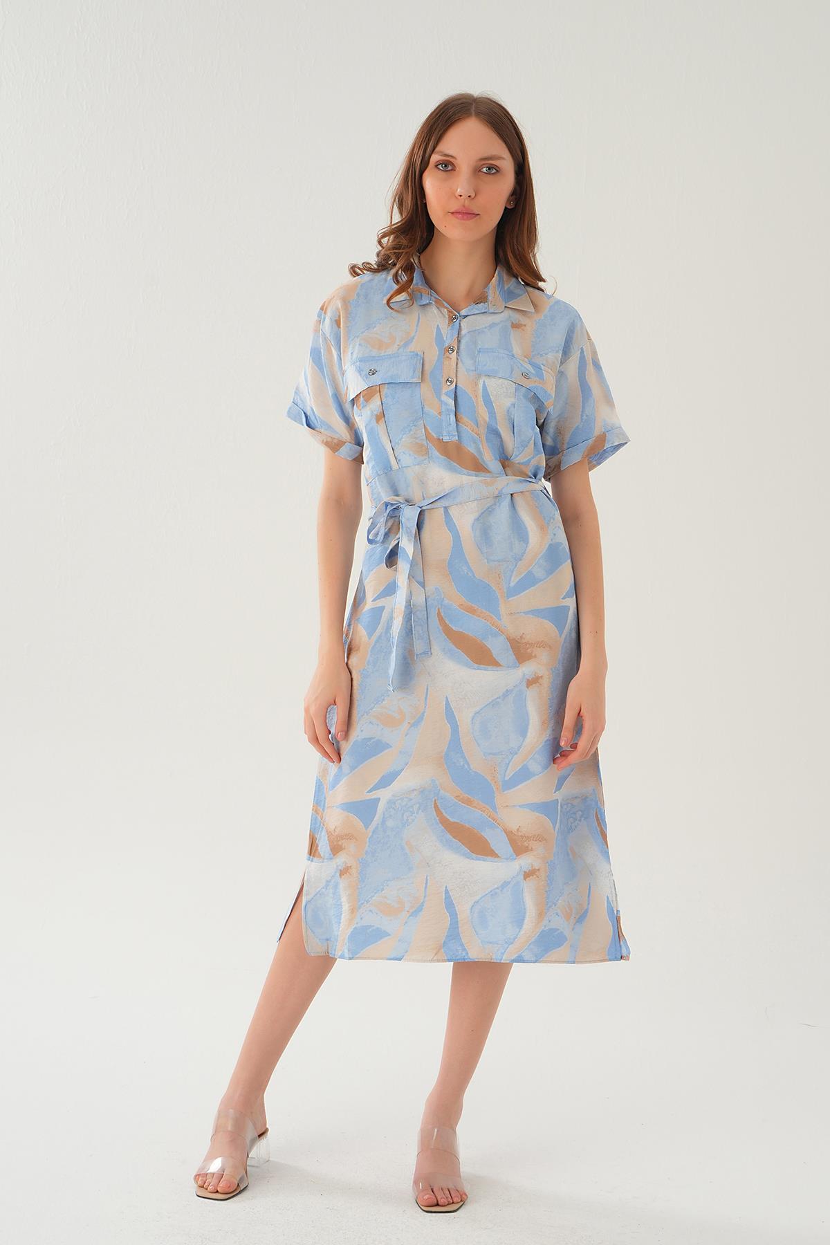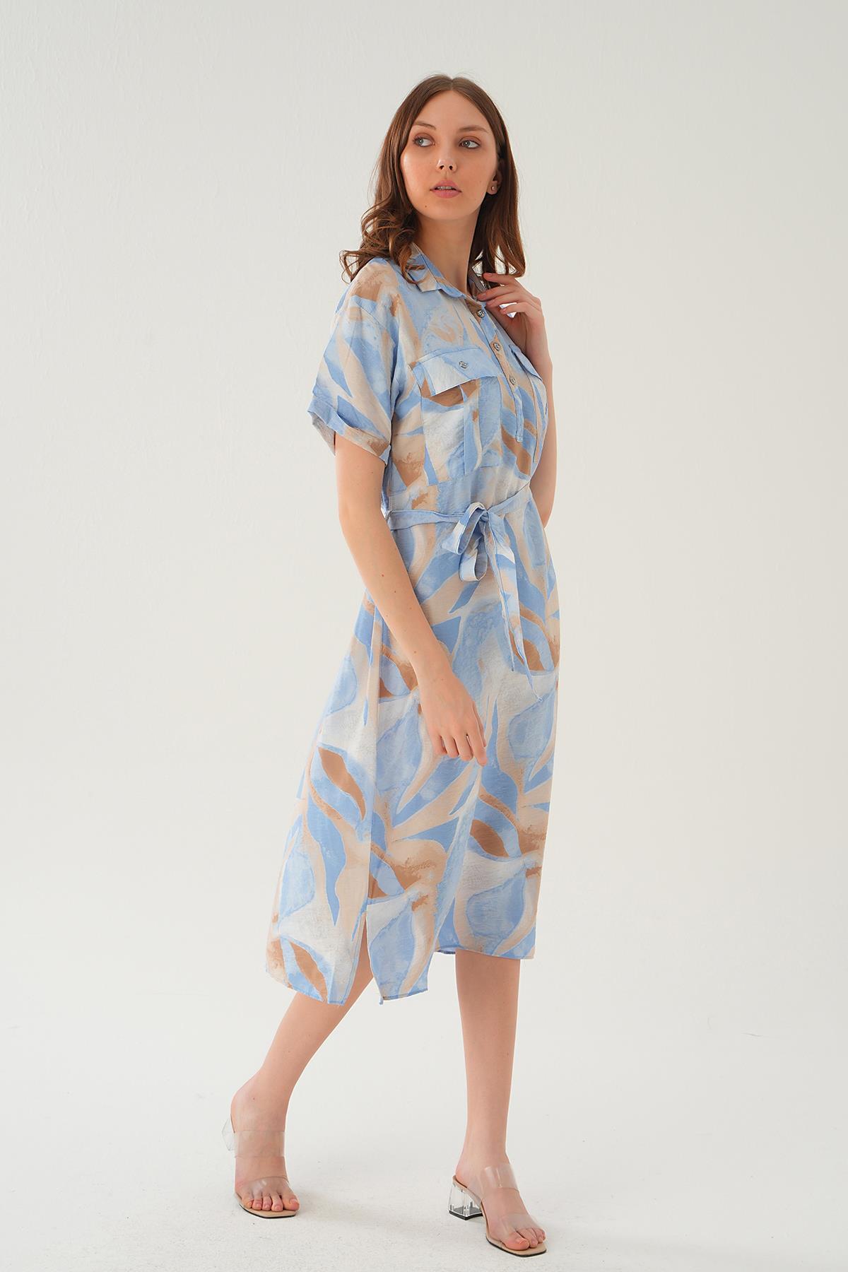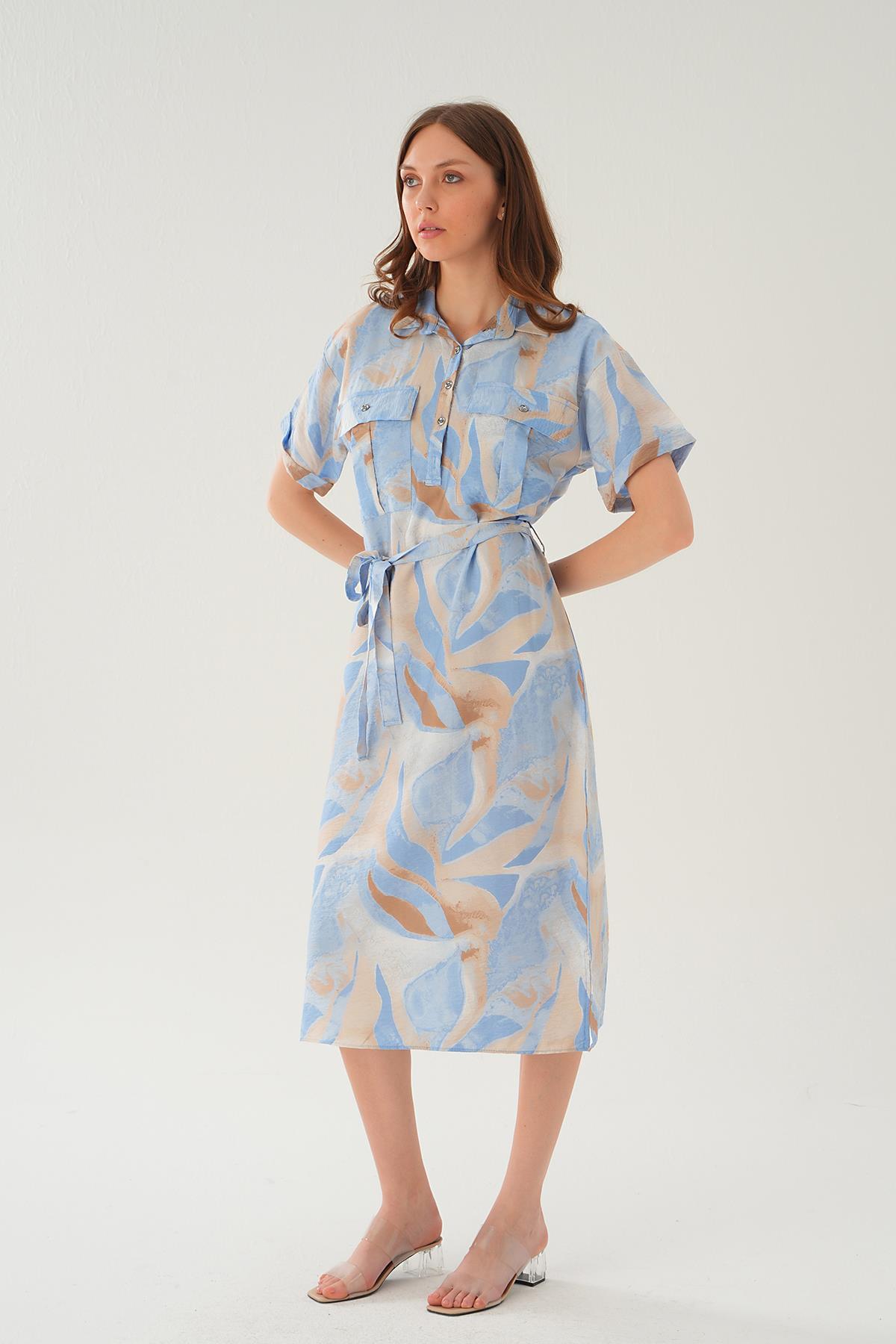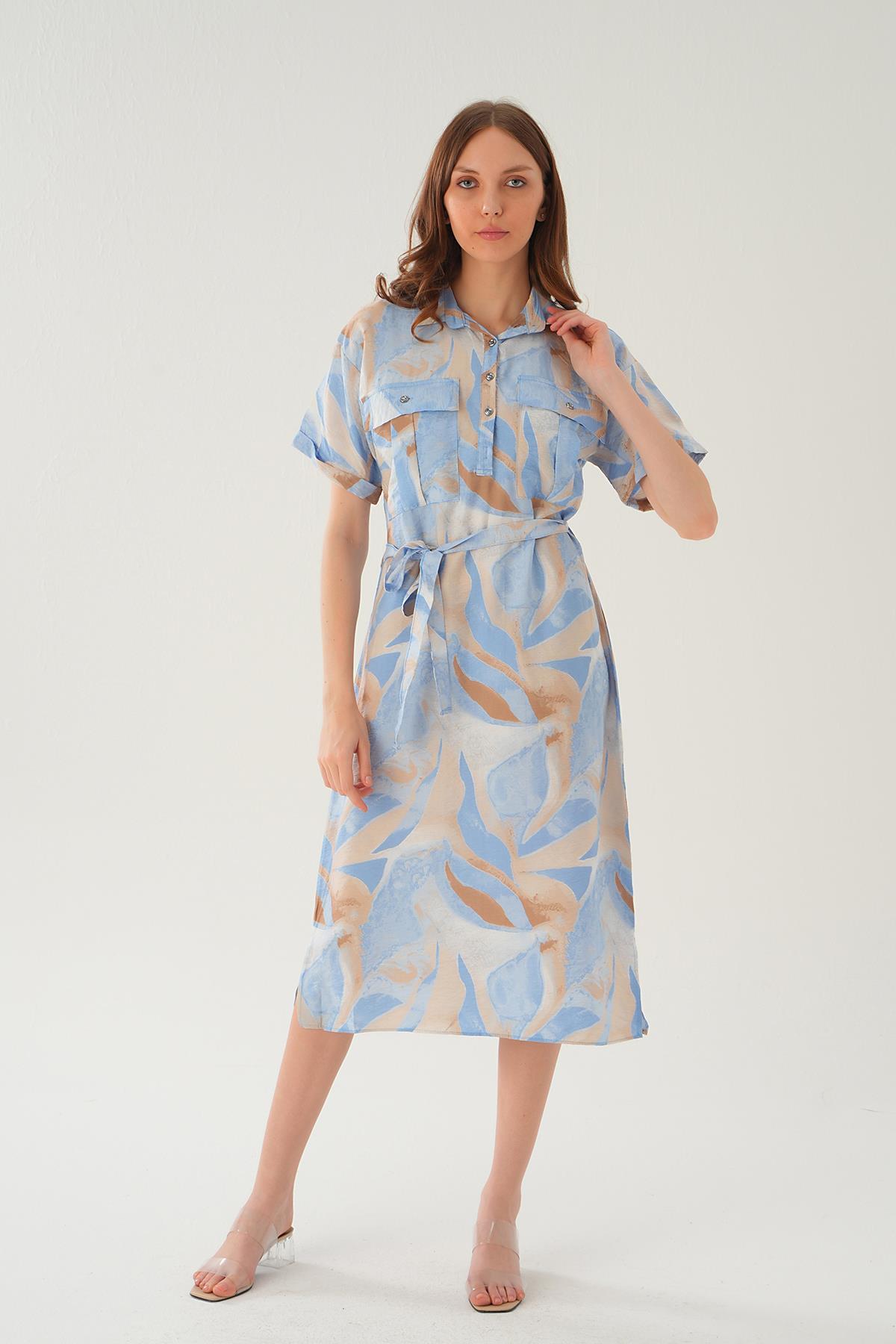 Mavi Cep Detay Uzun Elbise 8670