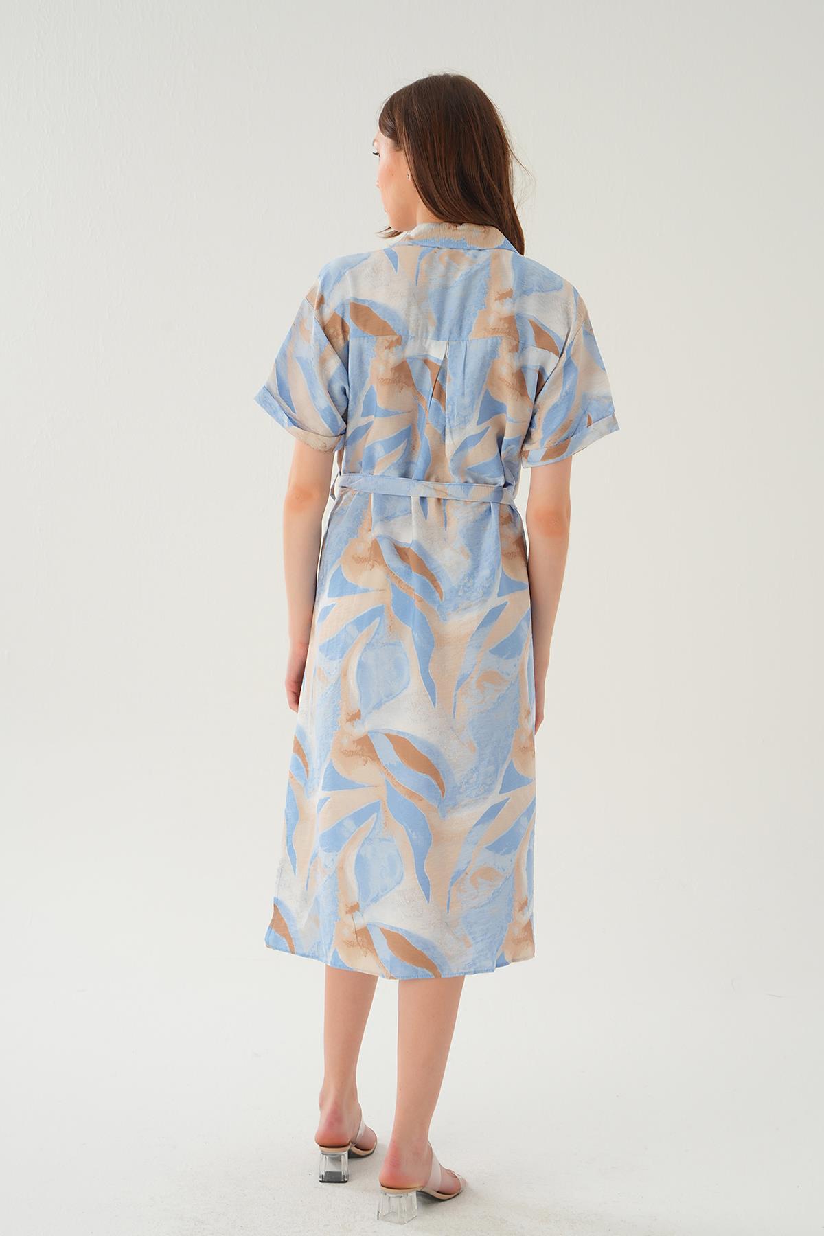 Kahve Desenli Bel Bağlama Elbise 2808
