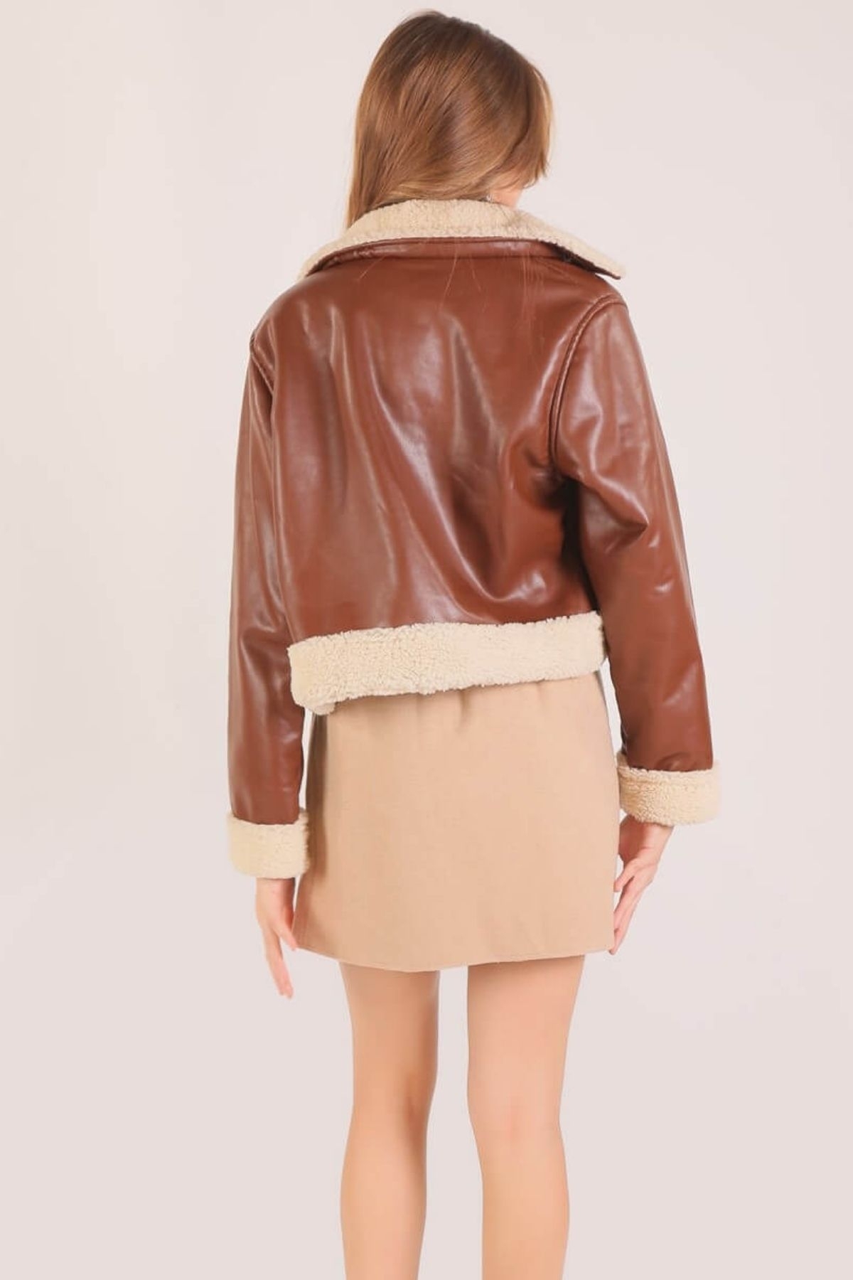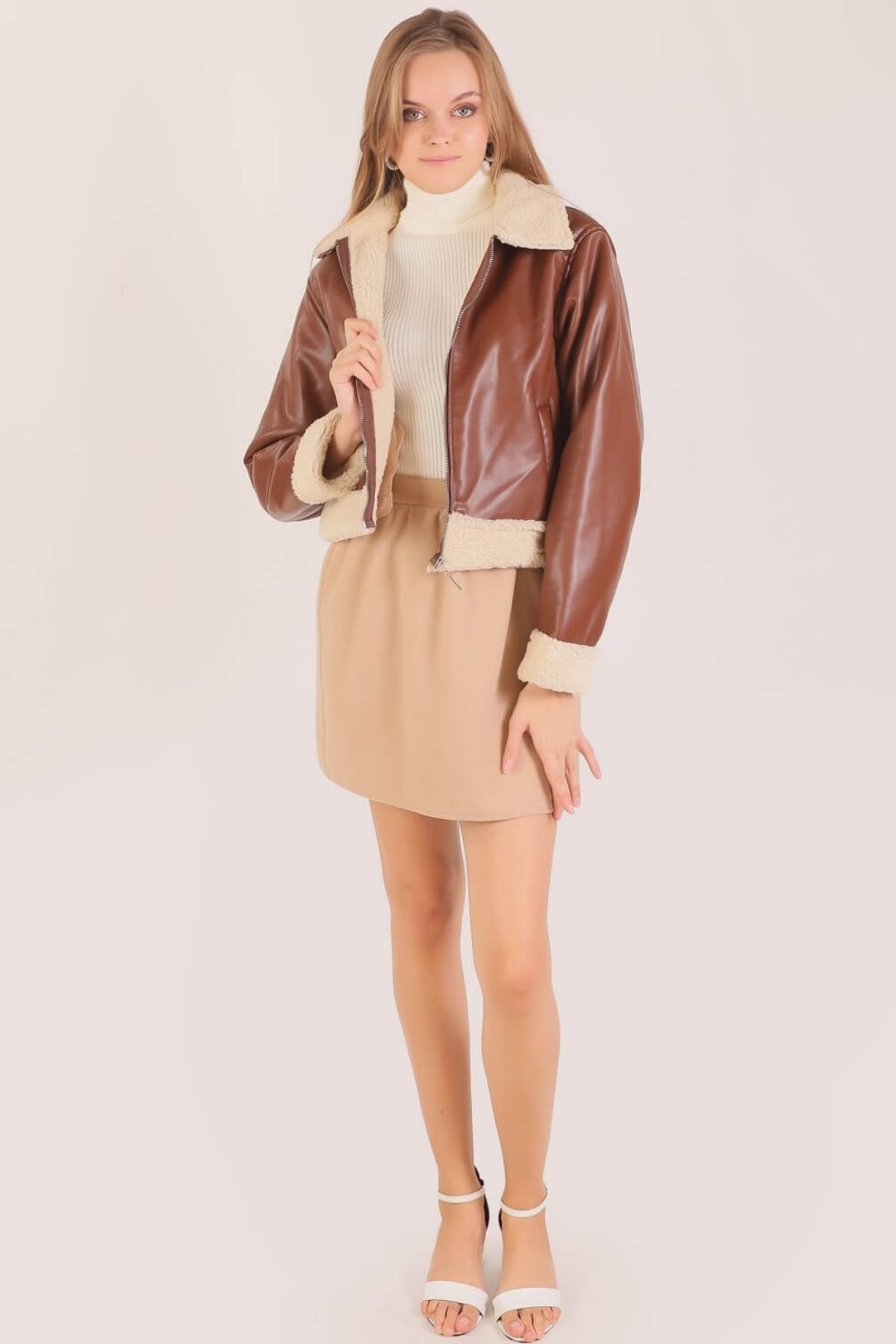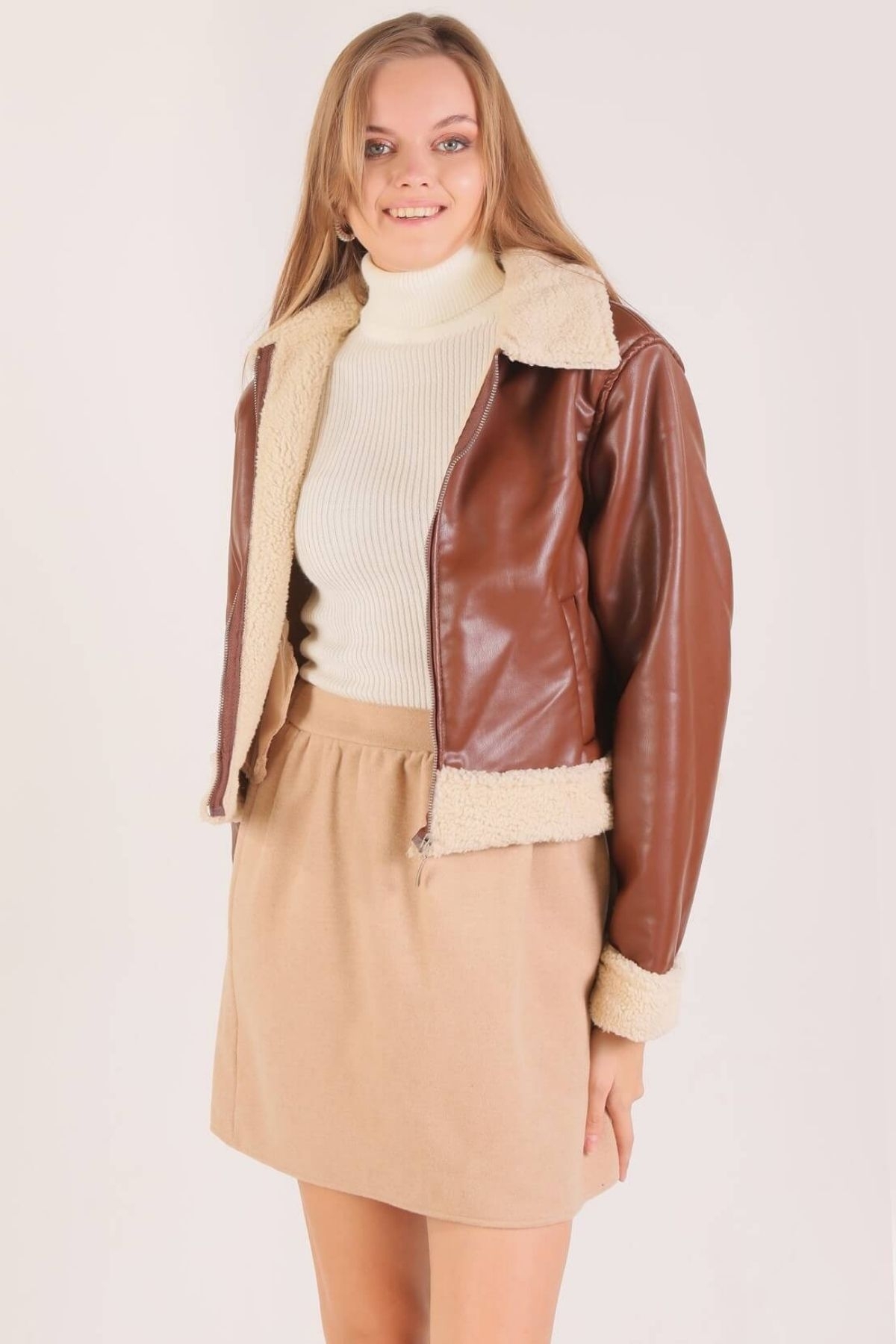 Kahve Yaka Kol Kürklü Deri Ceket 8684