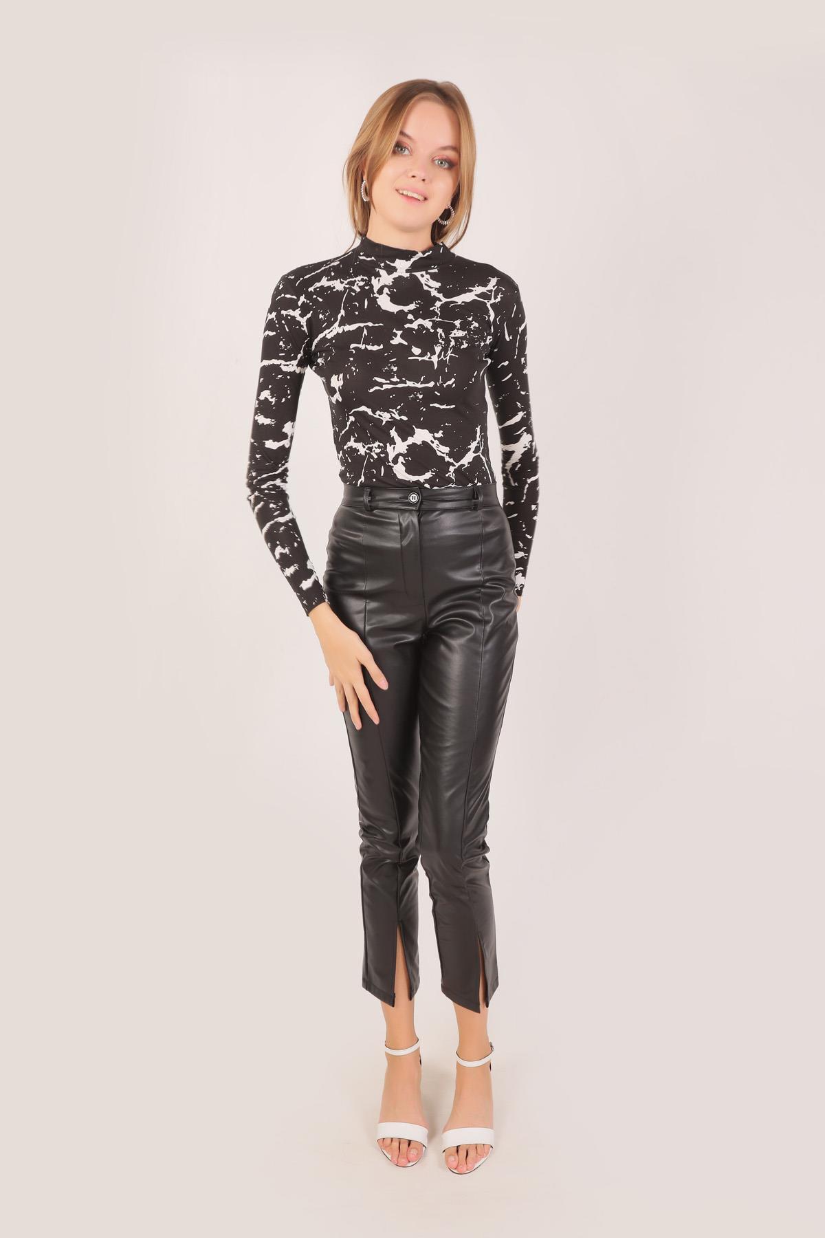 Siyah Paça Yırtmaçlı Deri Pantolon 8749