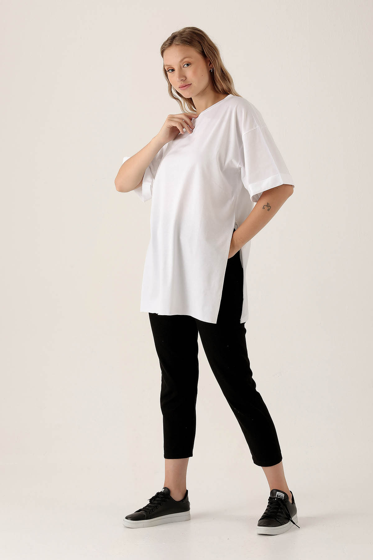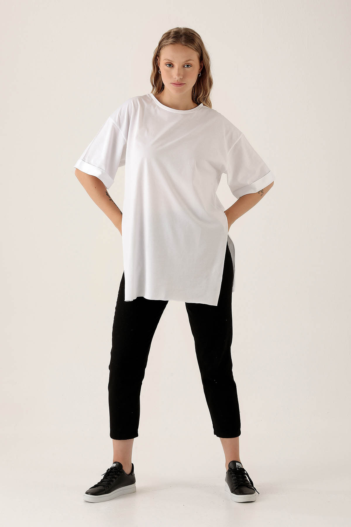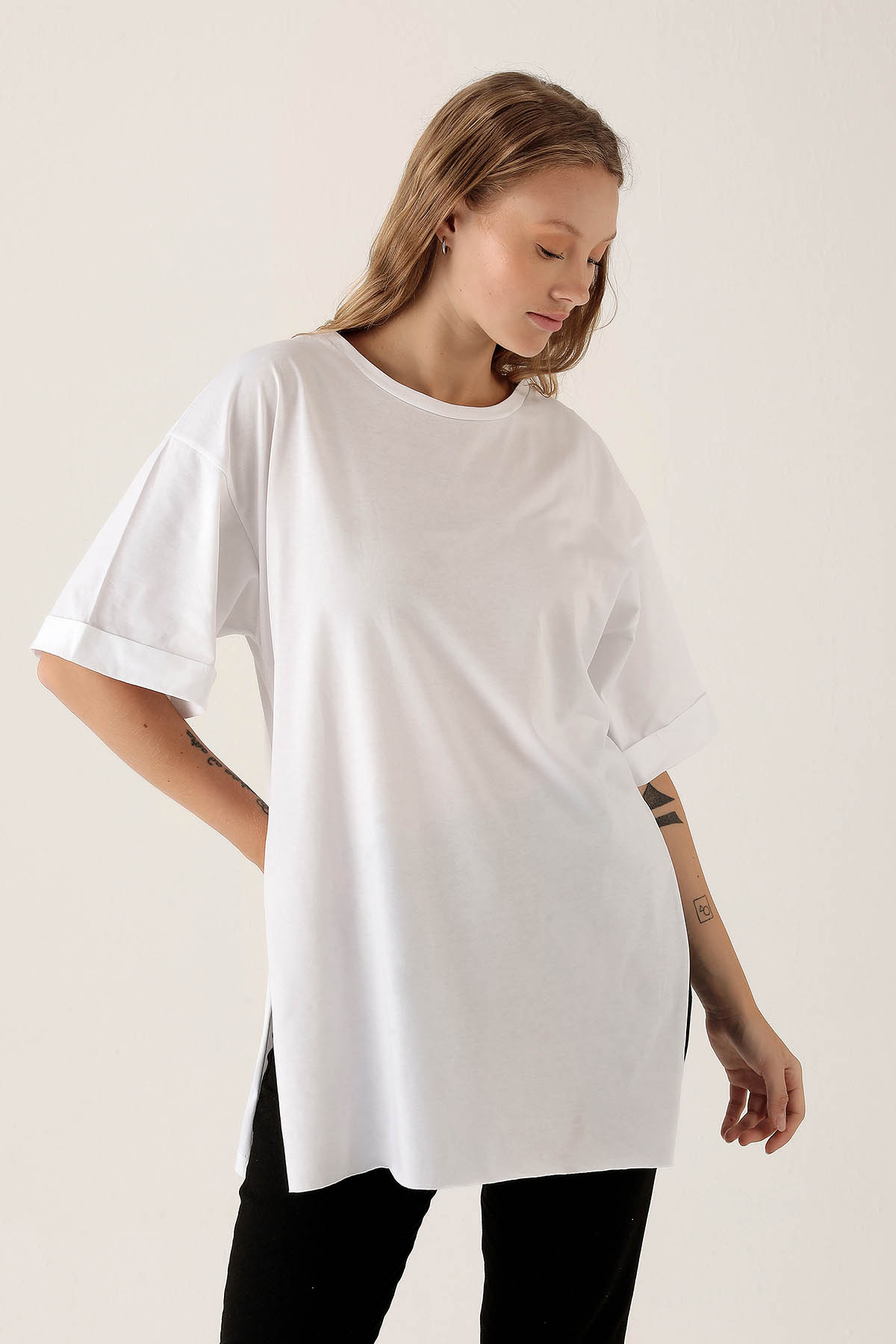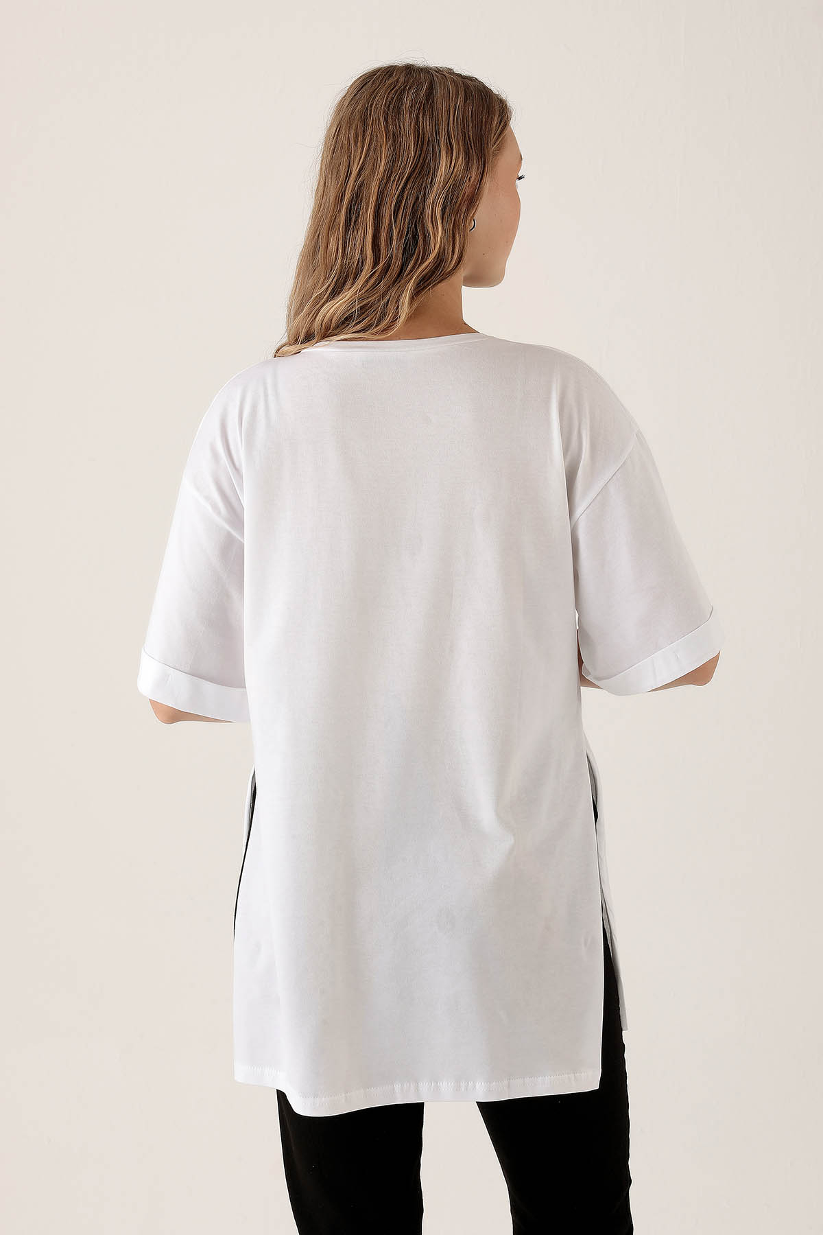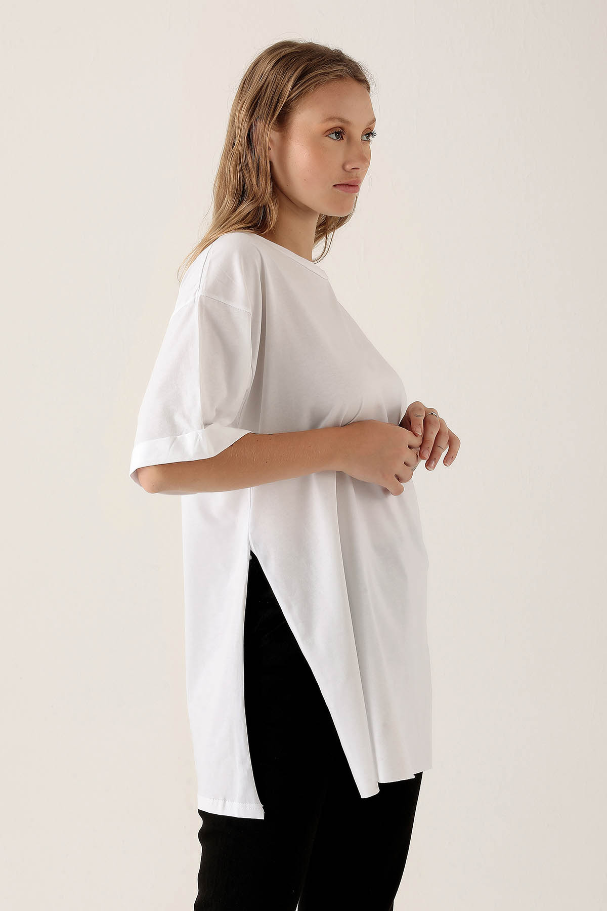 Beyaz Yan Yırtmaç Dubble Kol Tişört 9000M