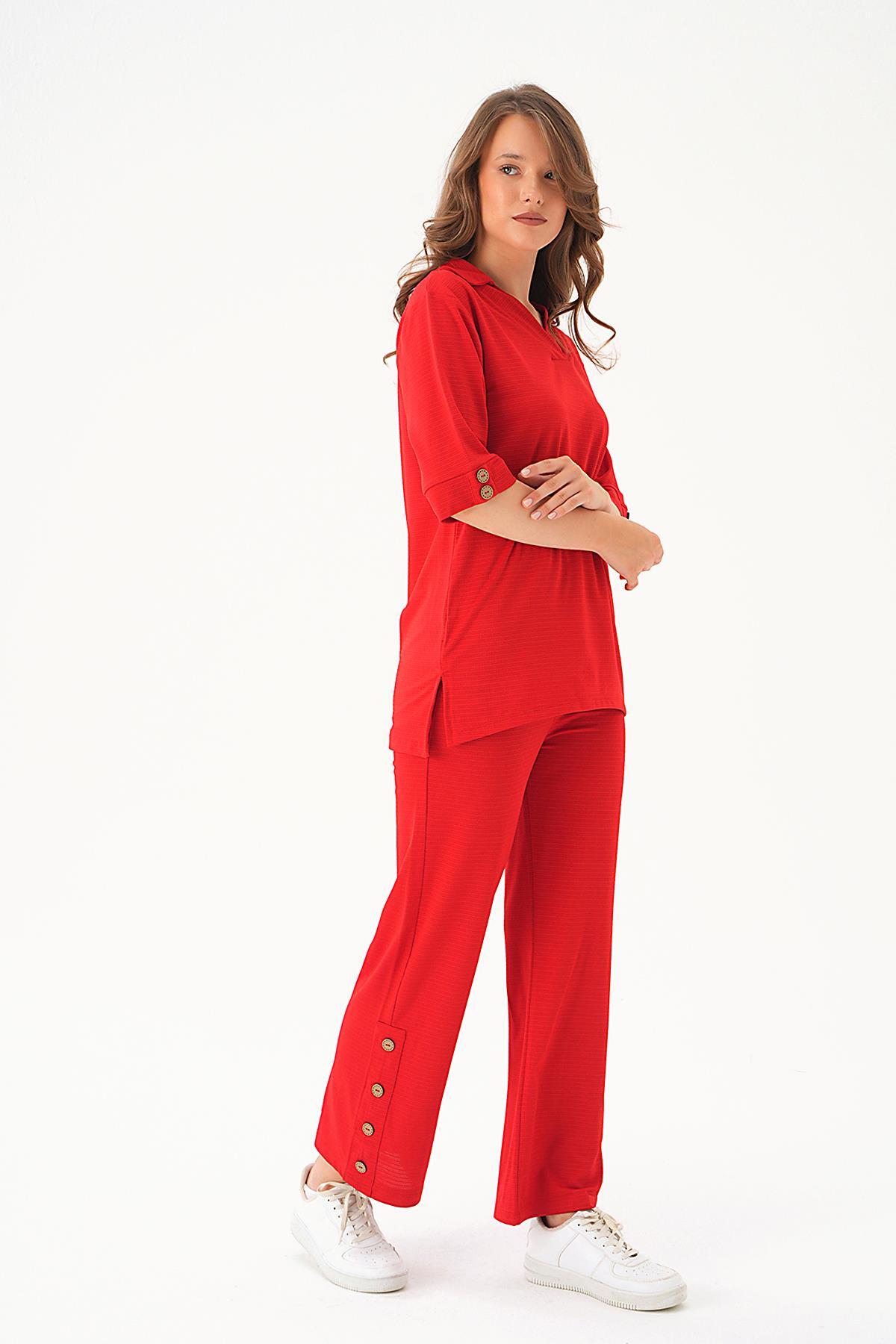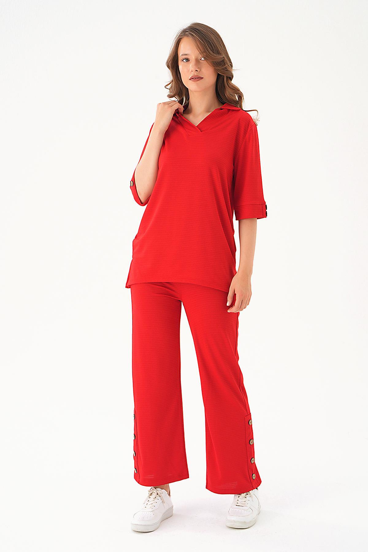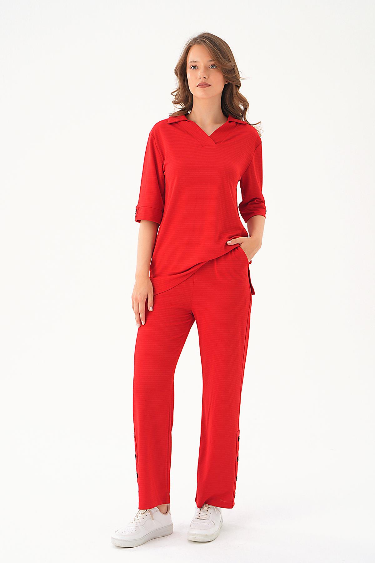Kırmızı Gömlek Yaka Düğmeli Pantolon Takım 9032M