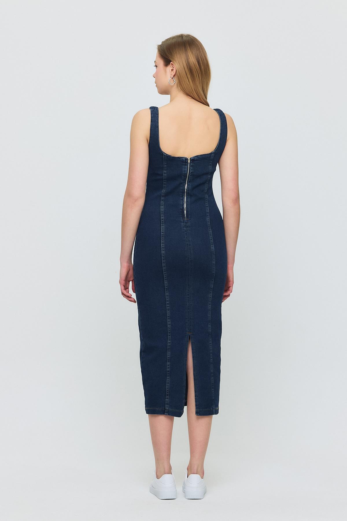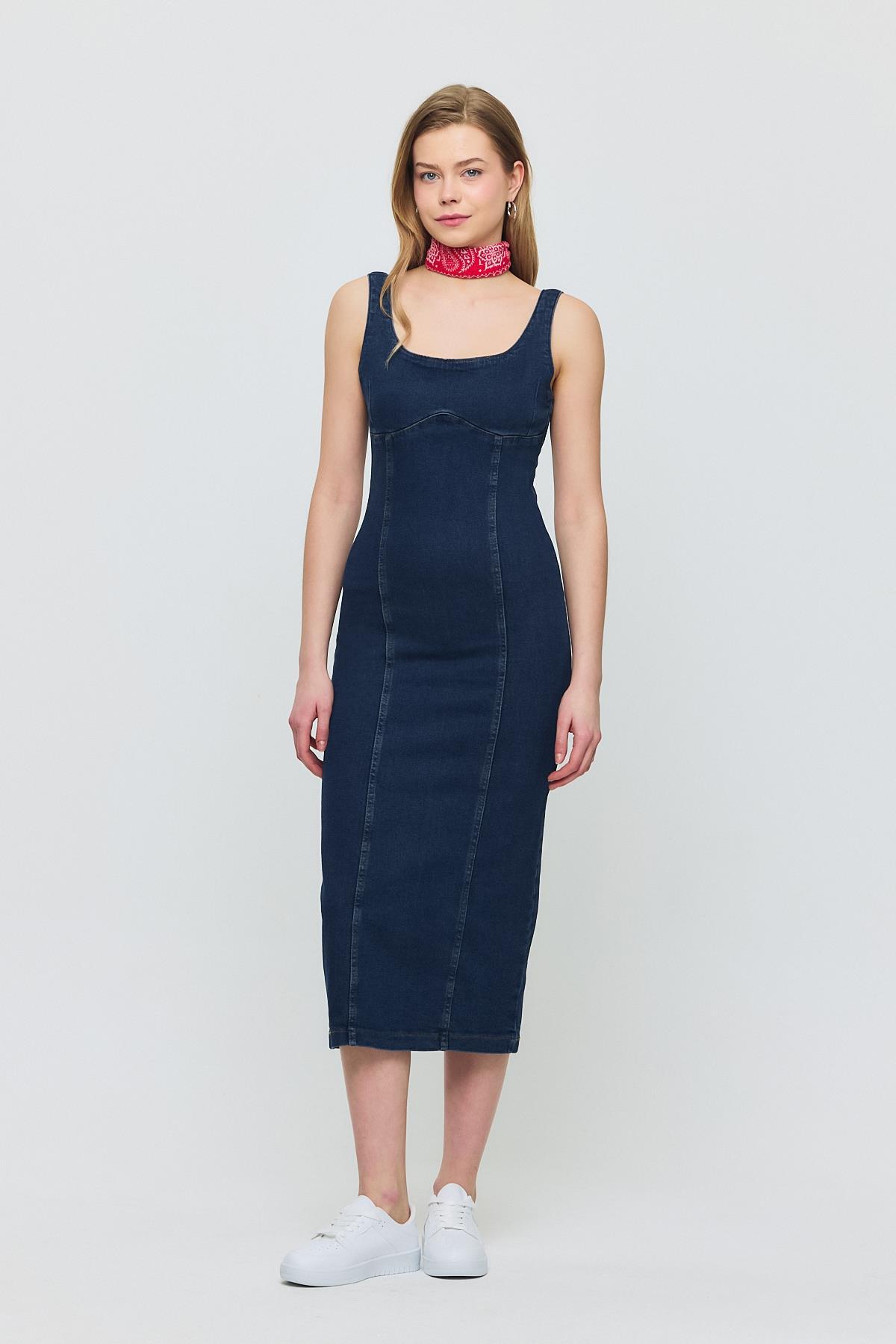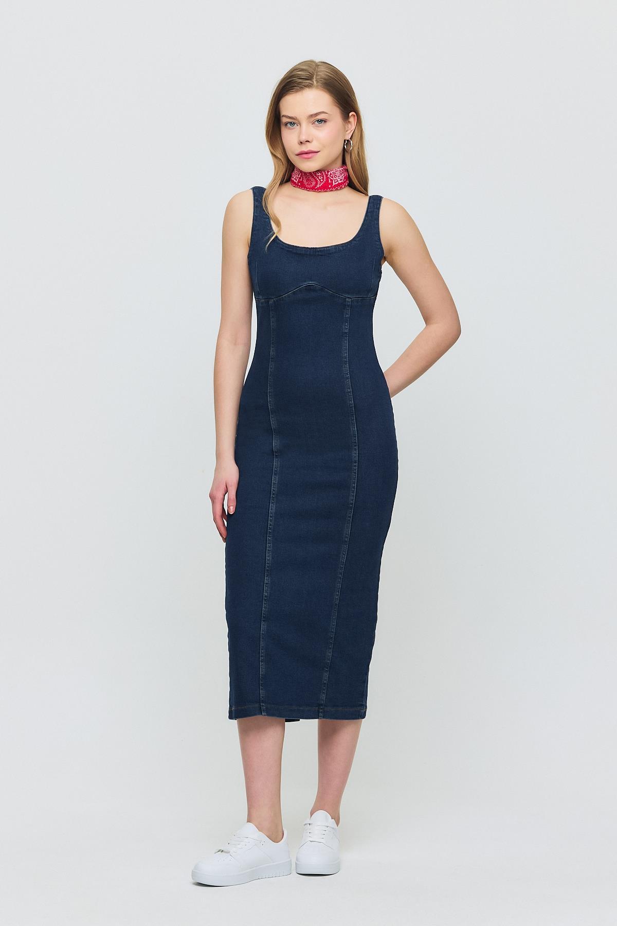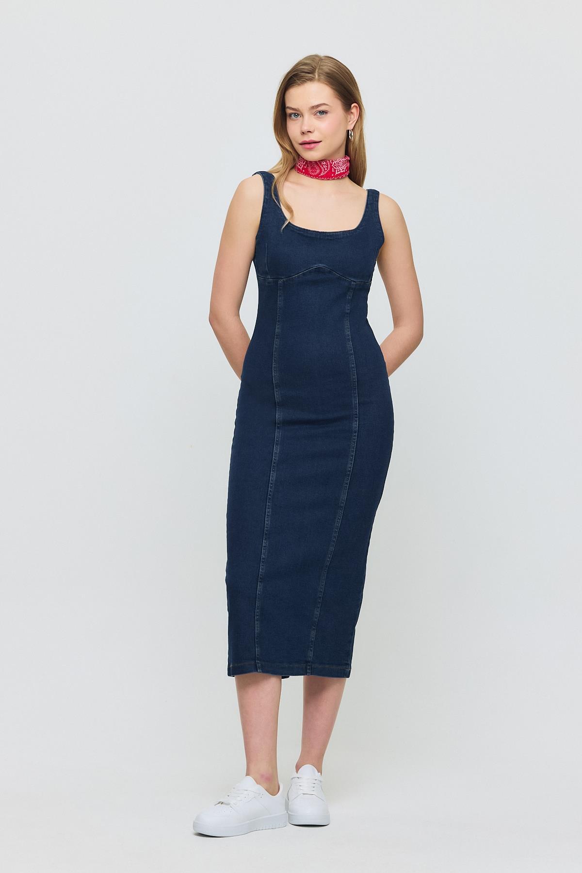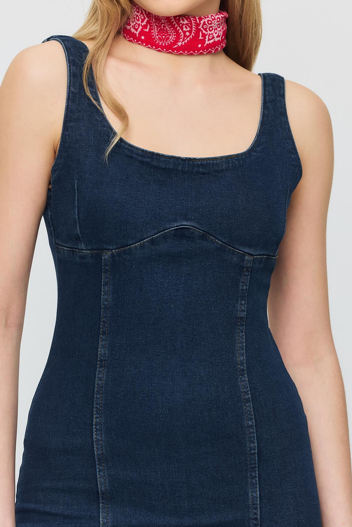 Koyu Mavi Askılı Kot Elbise 9066