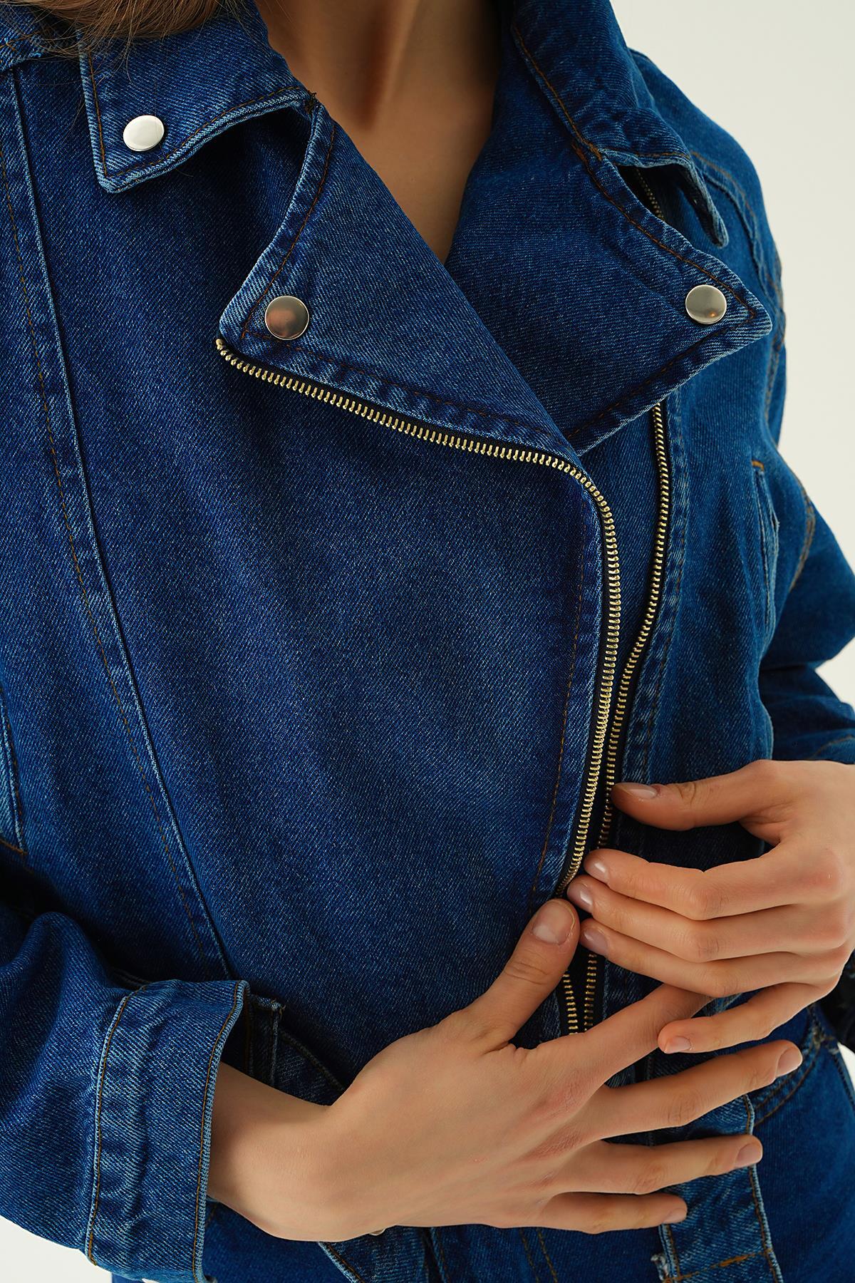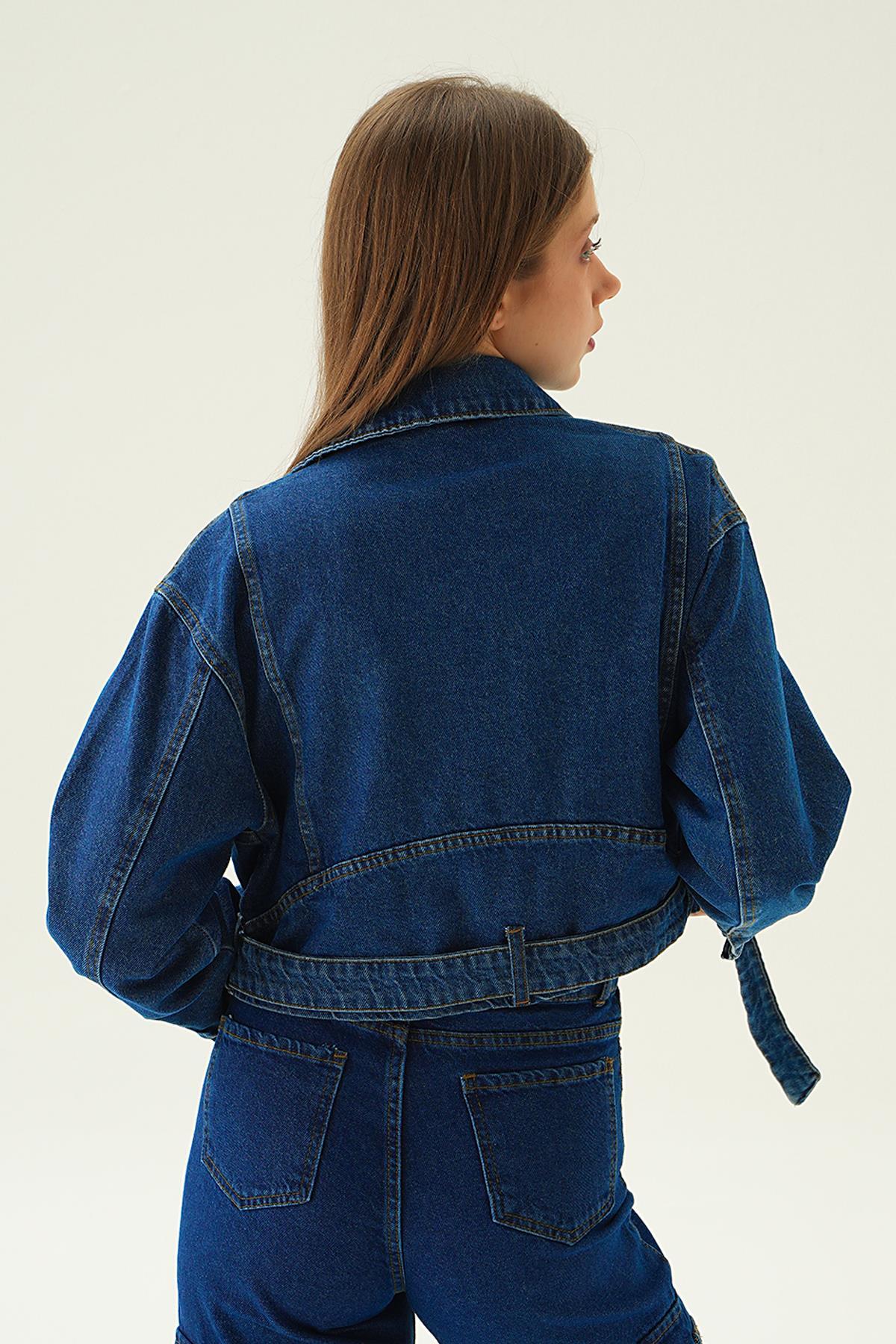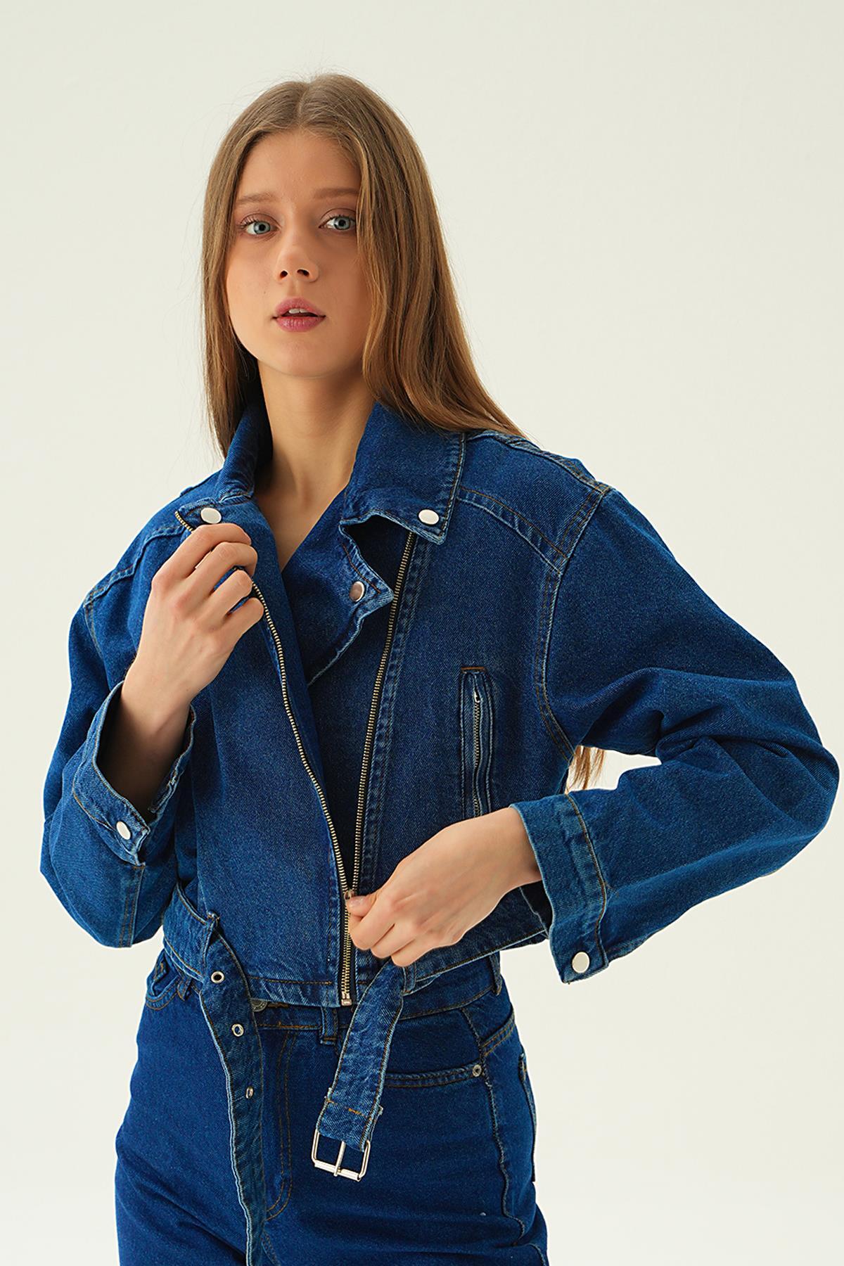 Koyu Mavi Fermuar Detay Kemerli Kot Ceket 9096