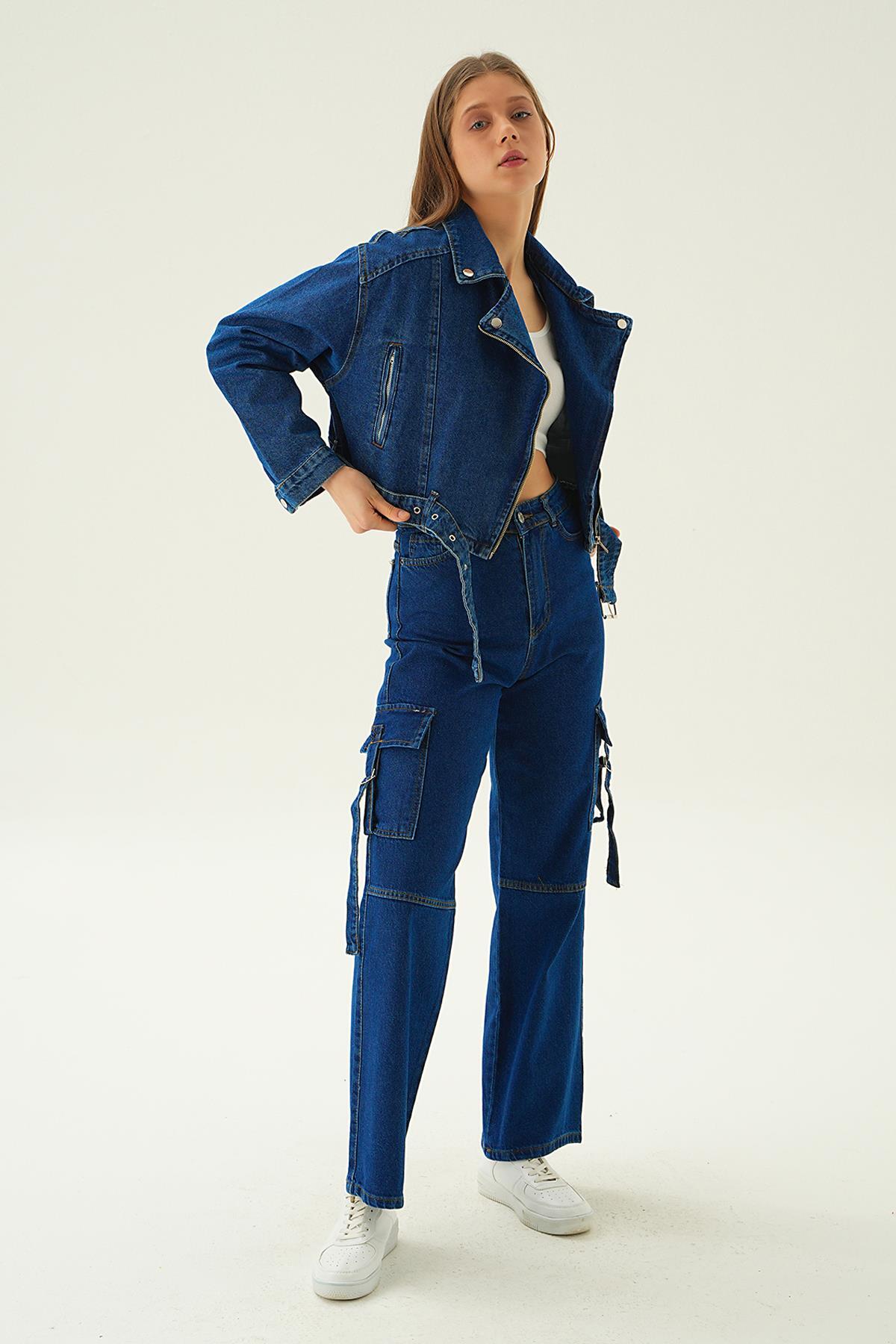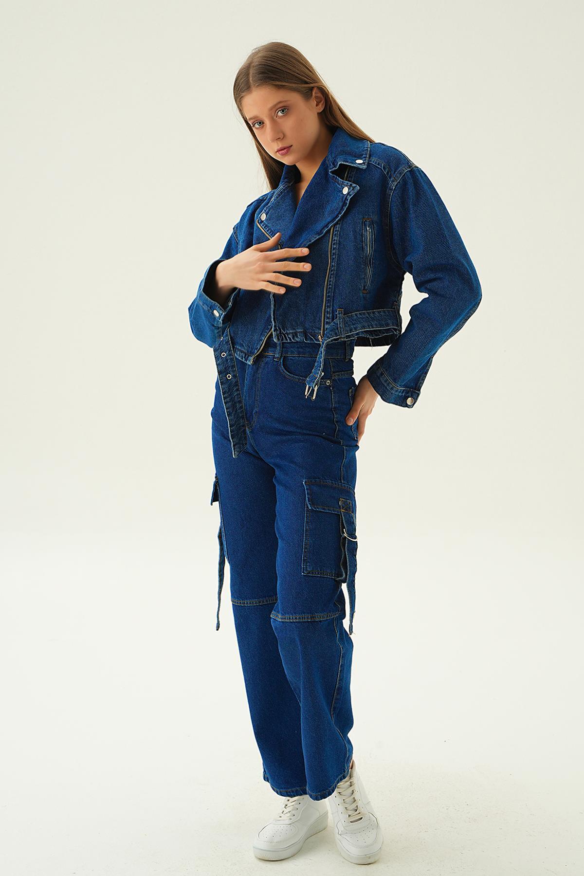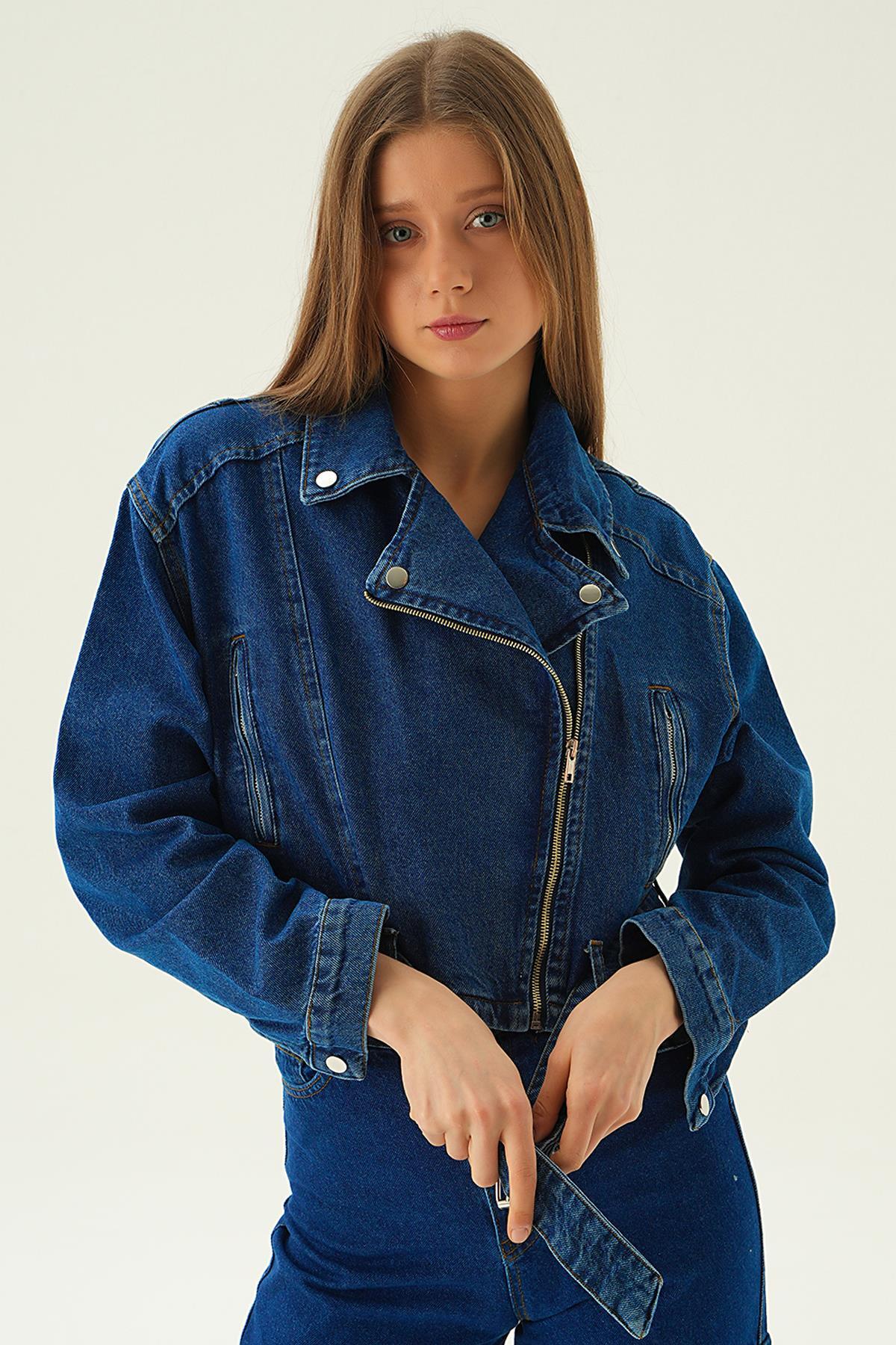 Koyu Mavi Fermuar Detay Kemerli Kot Ceket 9096
