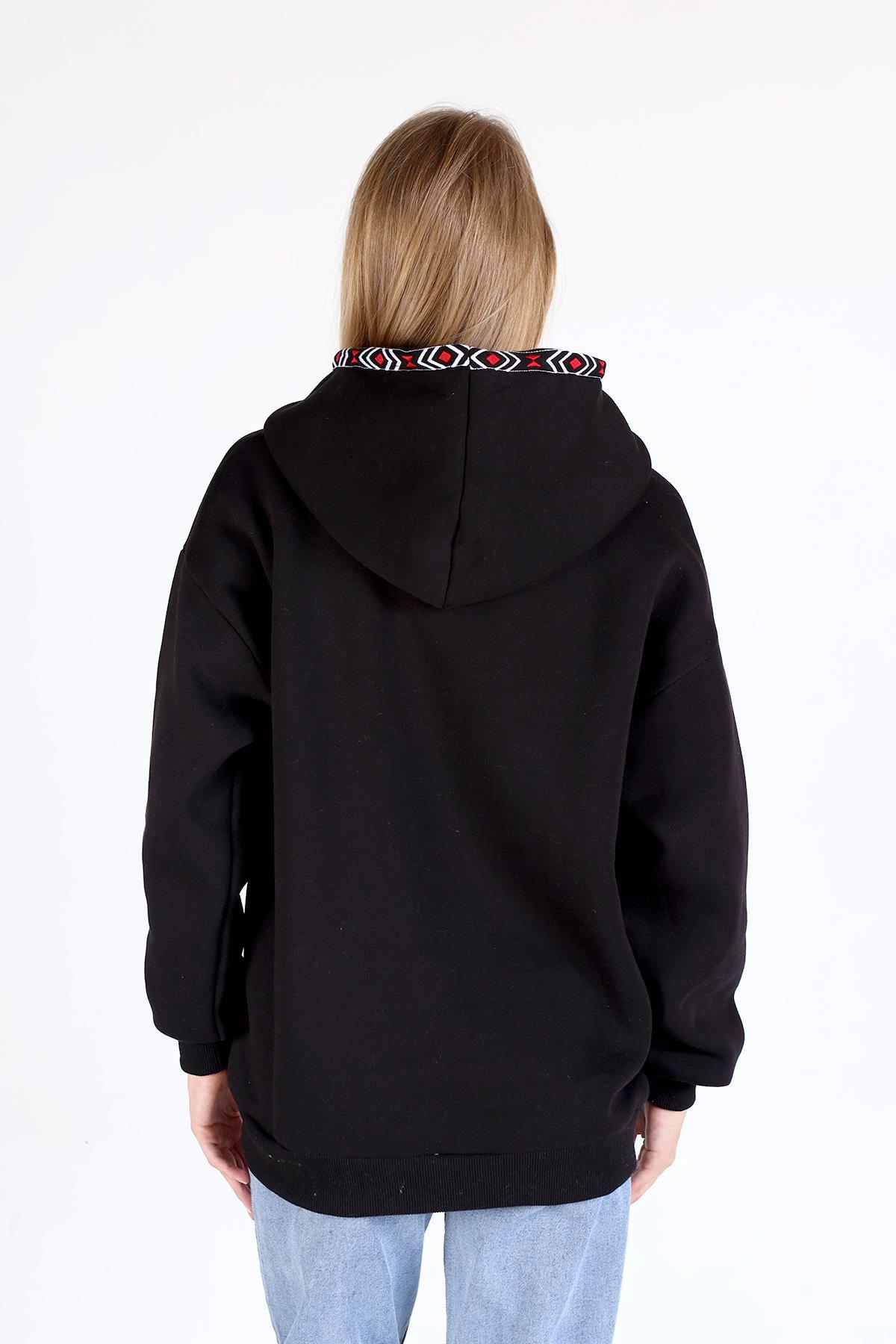Siyah Yaka Cep Nakışlı Kapüşonlu Sweat 9141M