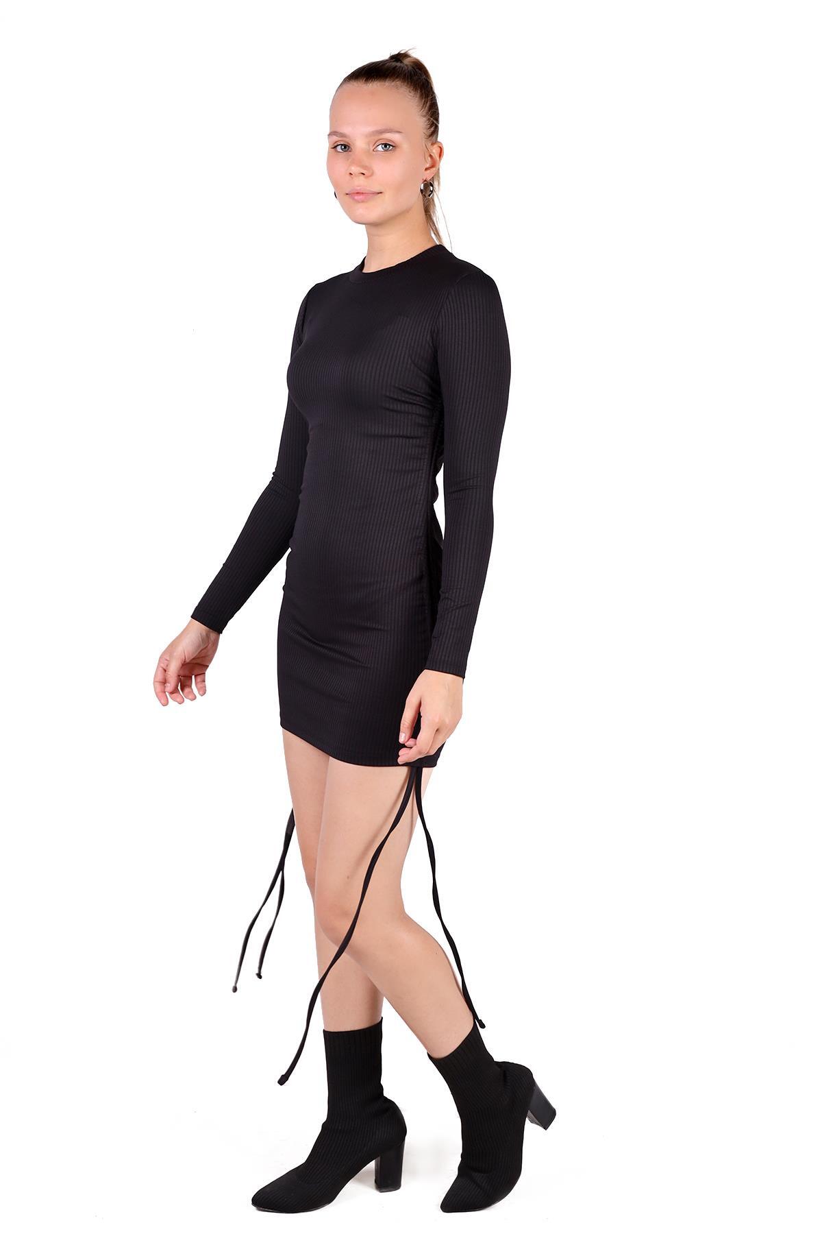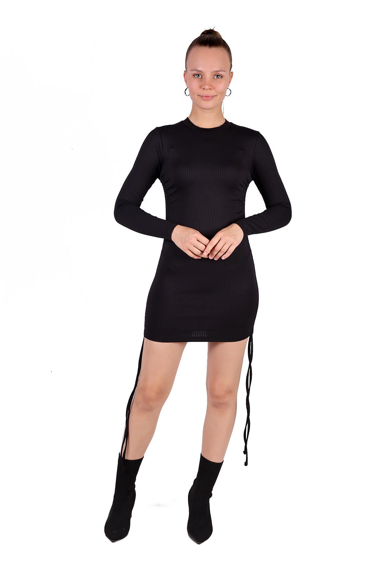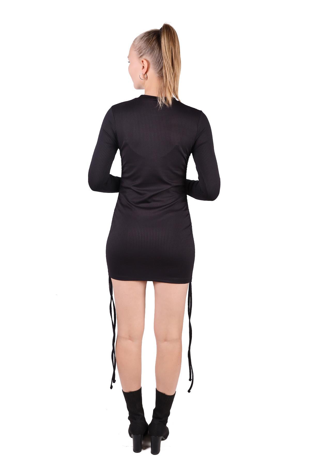 Siyah Yan Büzgülü Fitilli Elbise 9164M