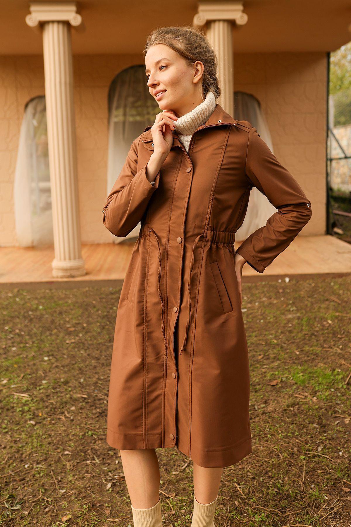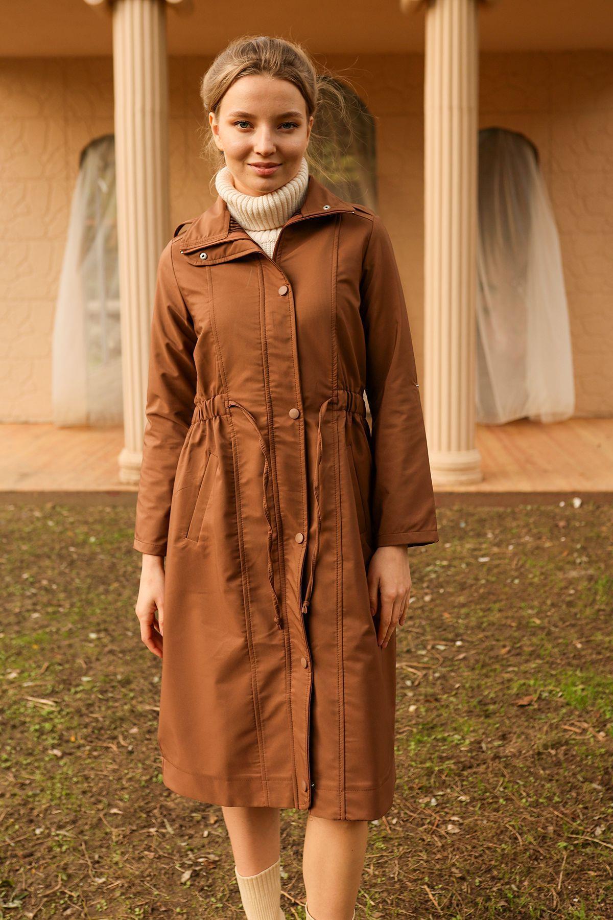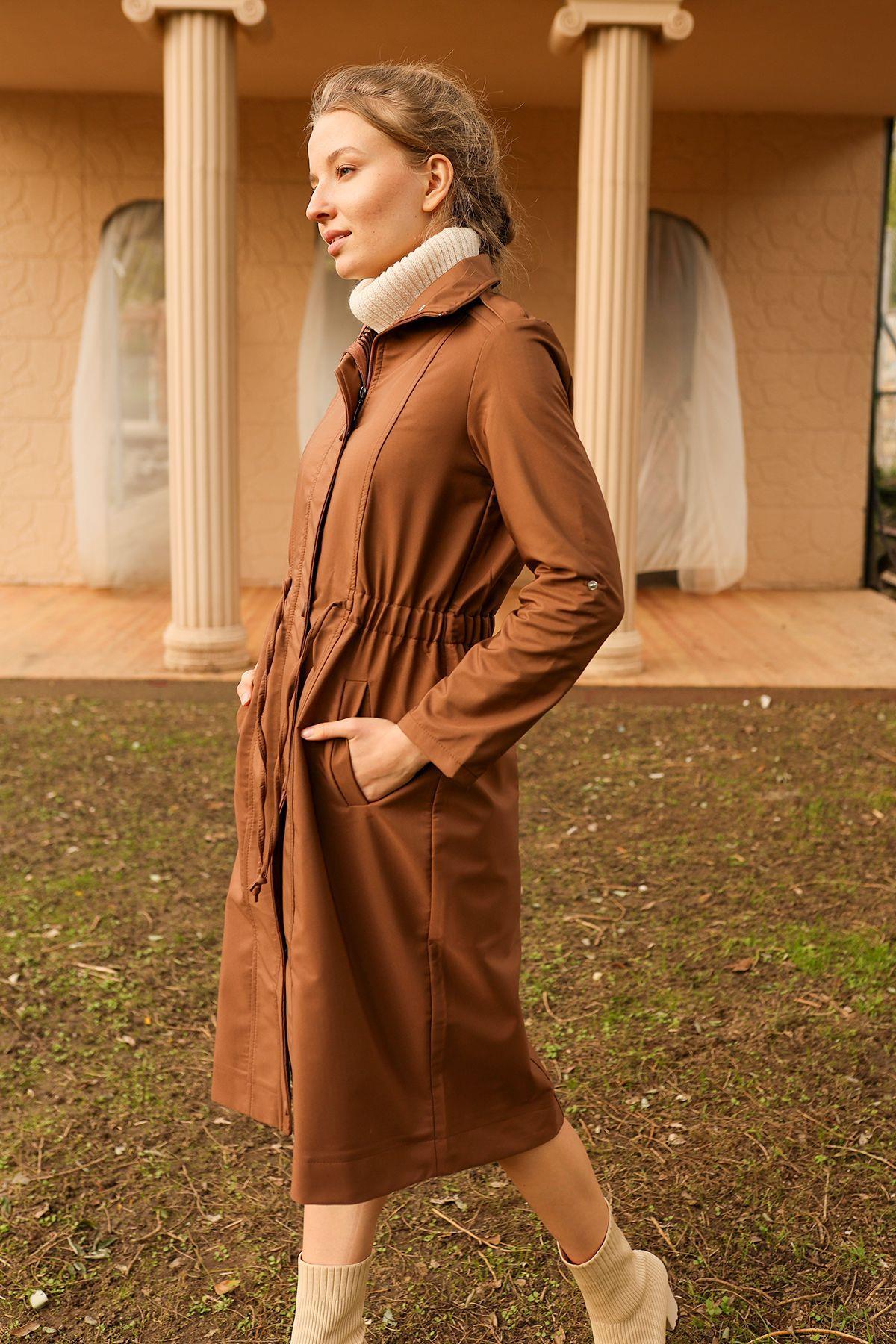 Kahve Kol Katlamalı Uzun Trençkot 9171