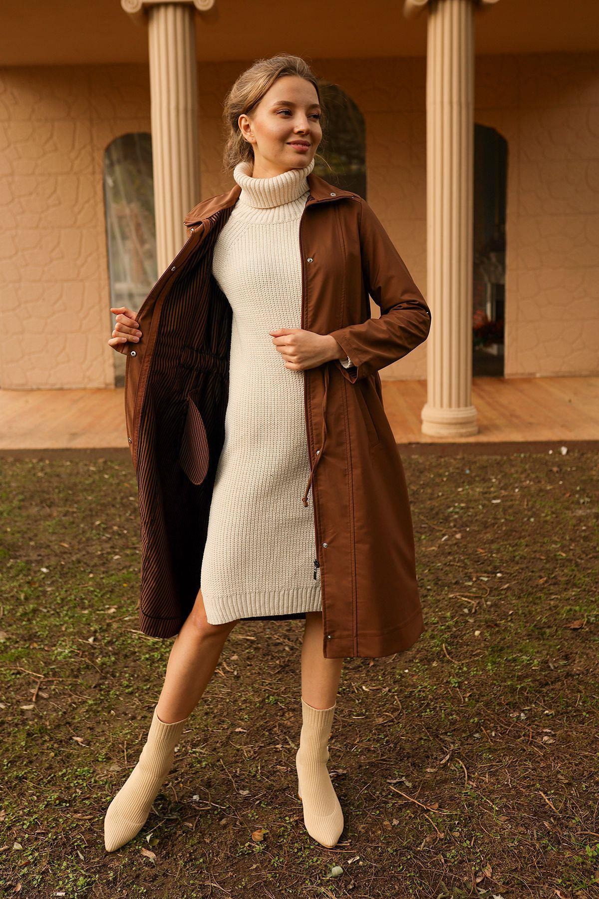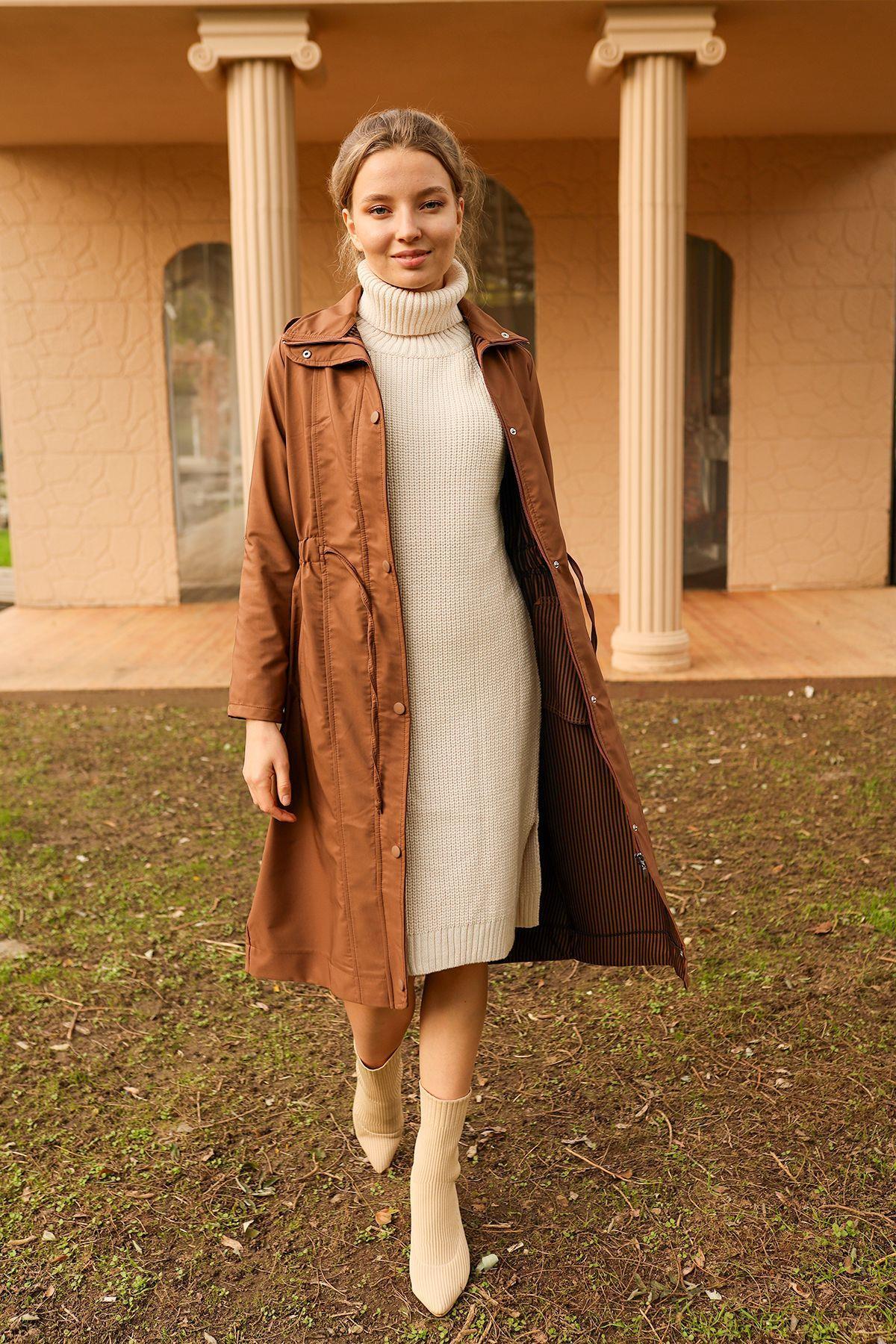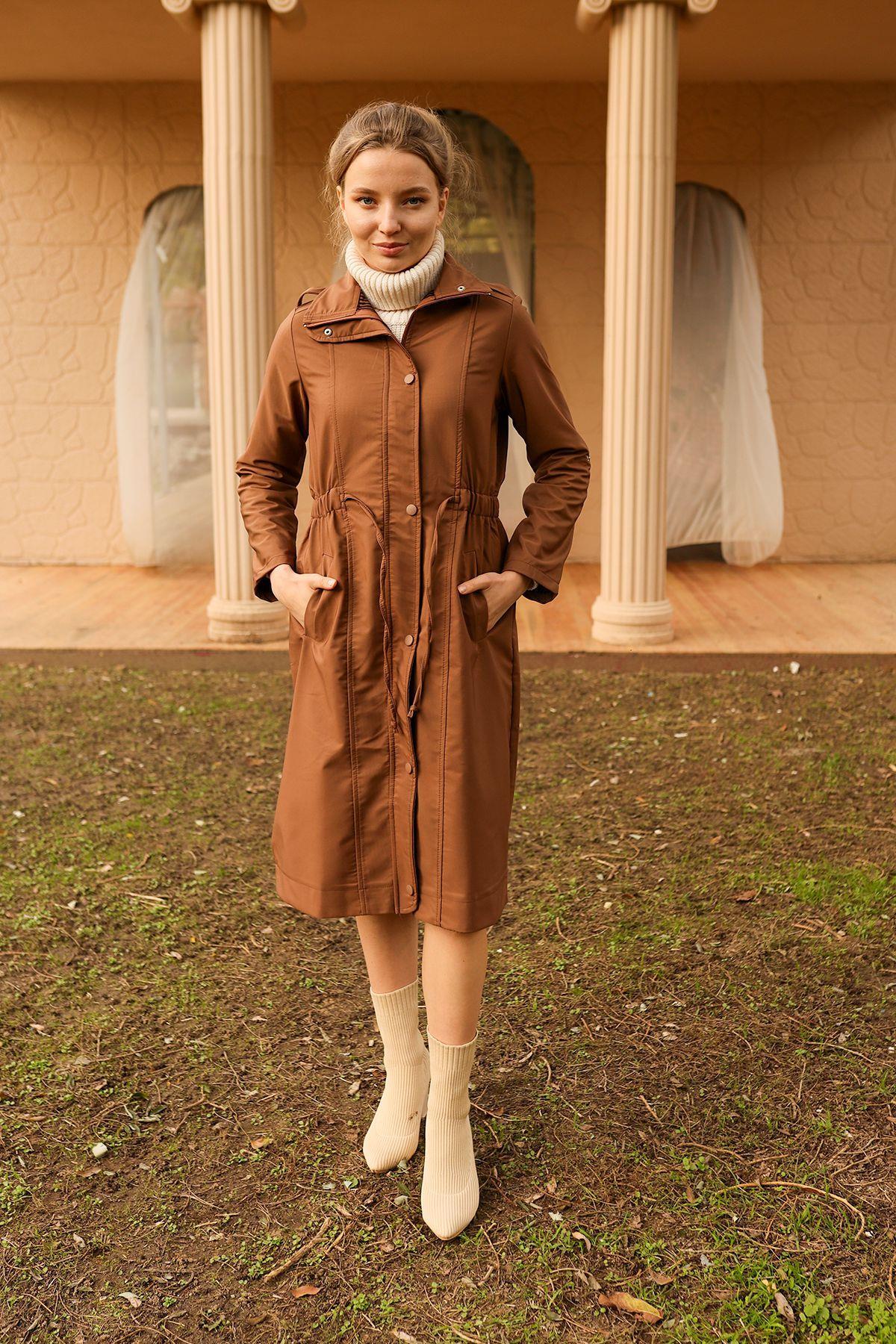 Kahve Kol Katlamalı Uzun Trençkot 9171