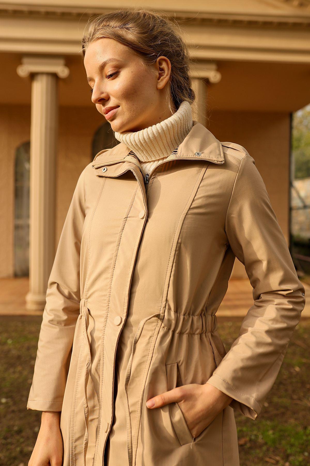 9171 Kol Katlamalı Uzun Trençkot Taş