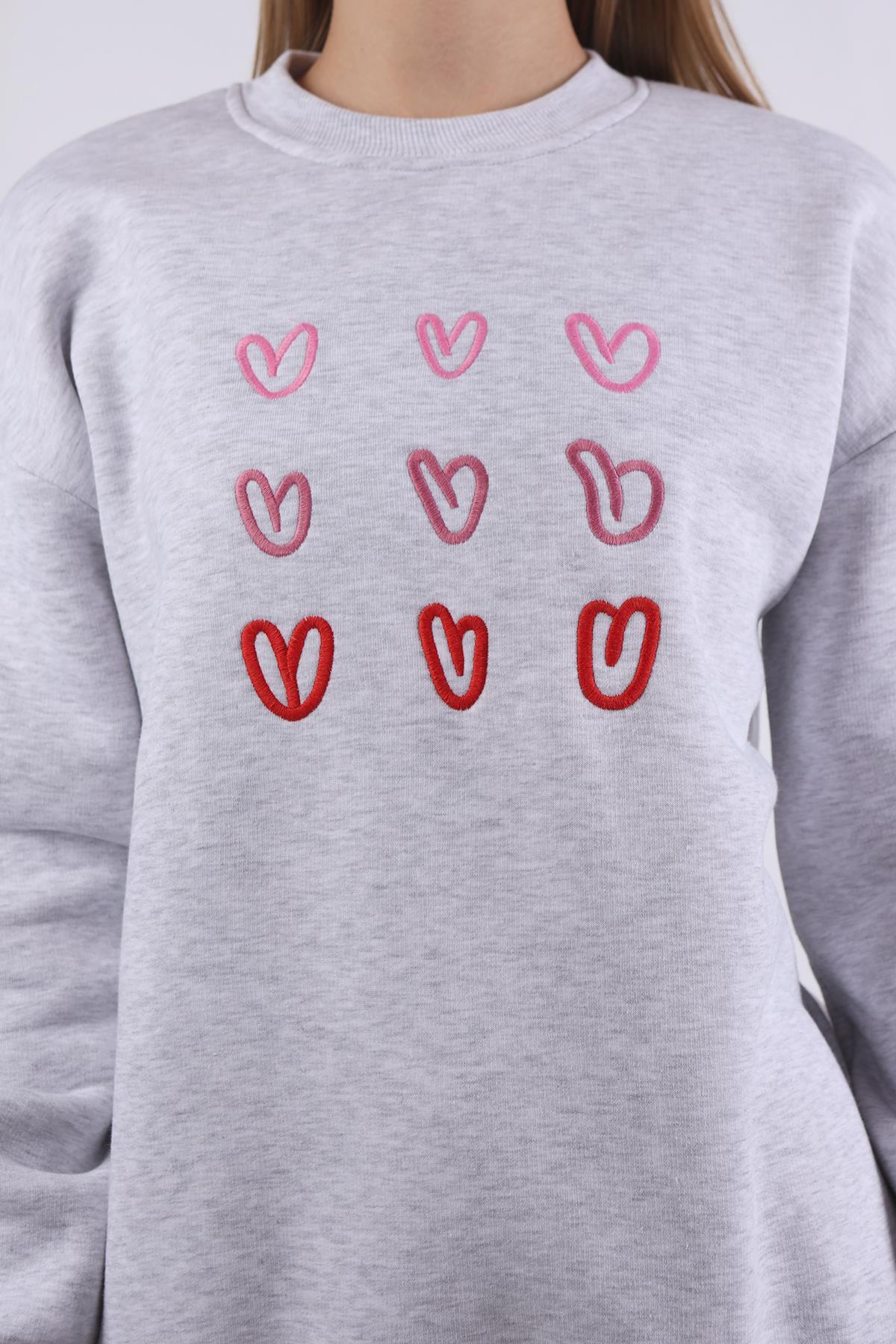 Gri Bisiklet Yaka Kalp Nakışlı Sweat 9175M