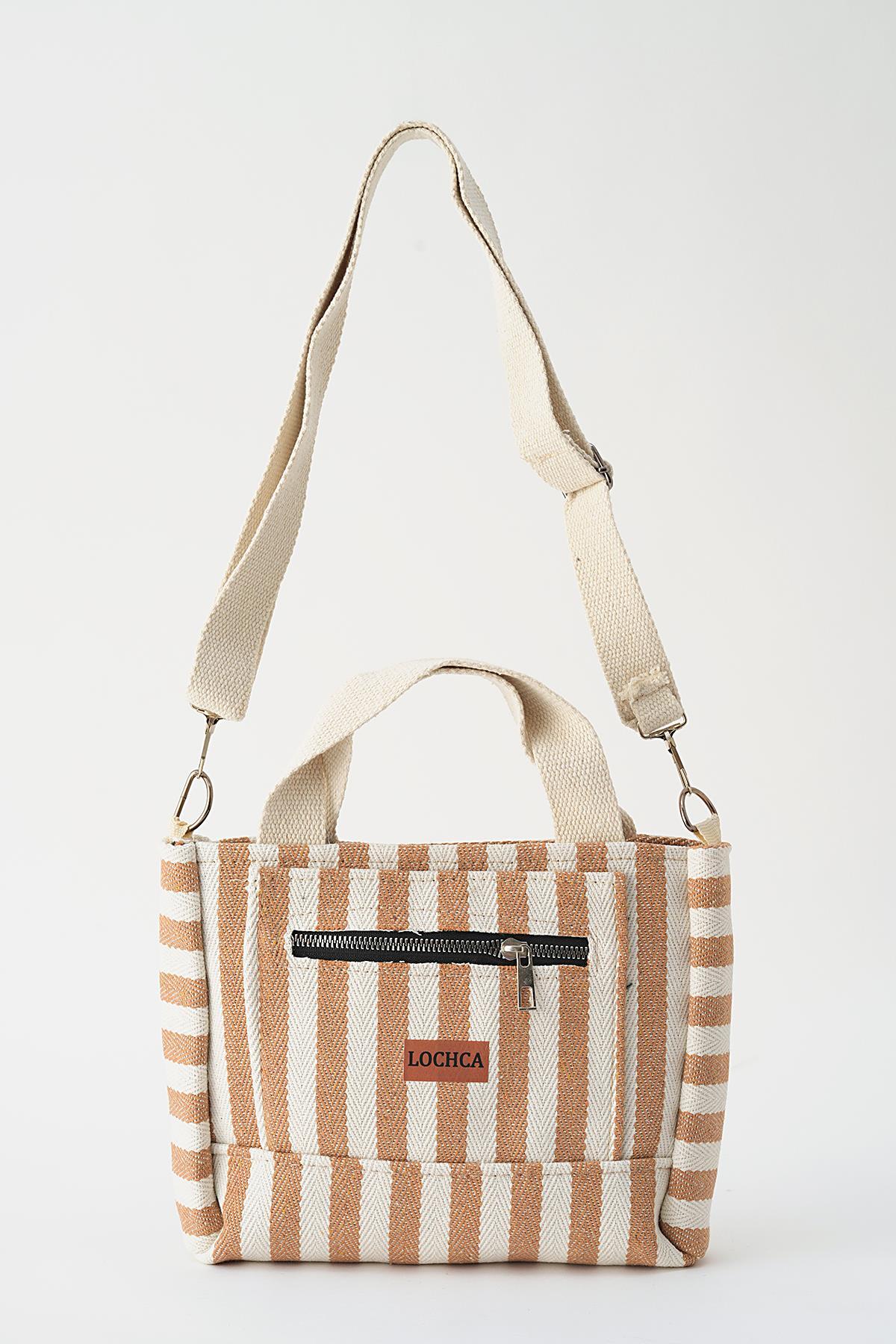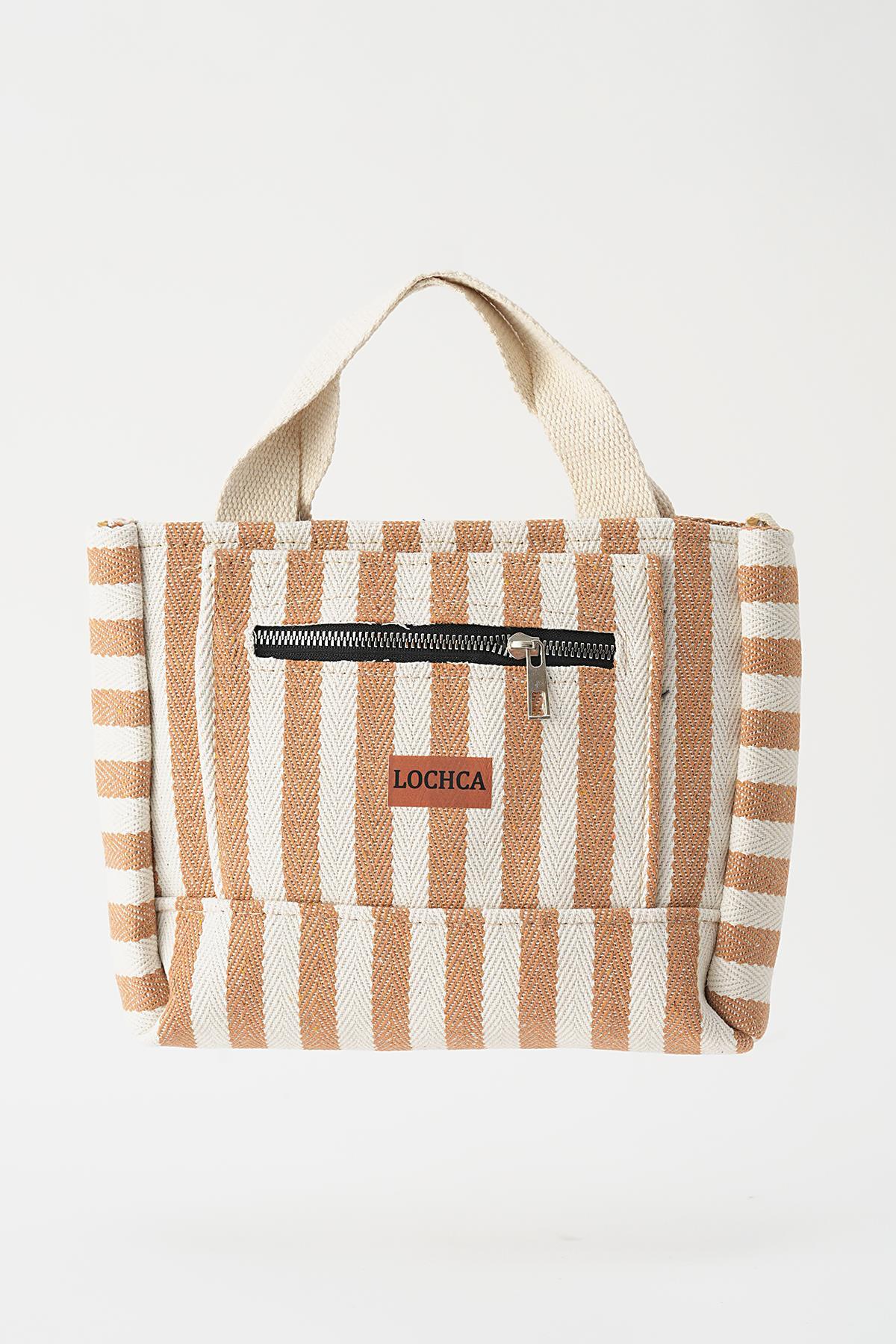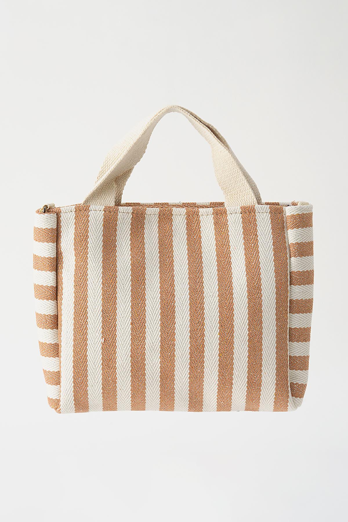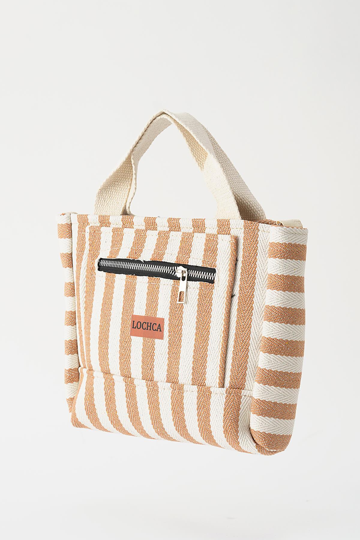 Bej Çizgili Fermuarlı Çanta 9200