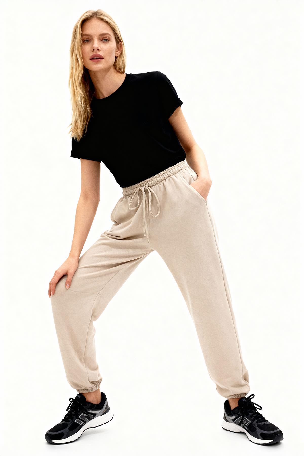 8218M Bel Lastikli Geniş Paça Eşofman Bej
