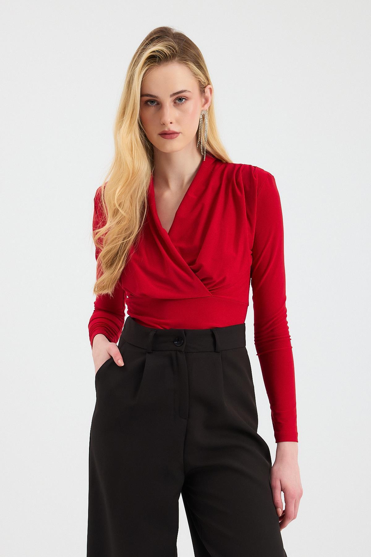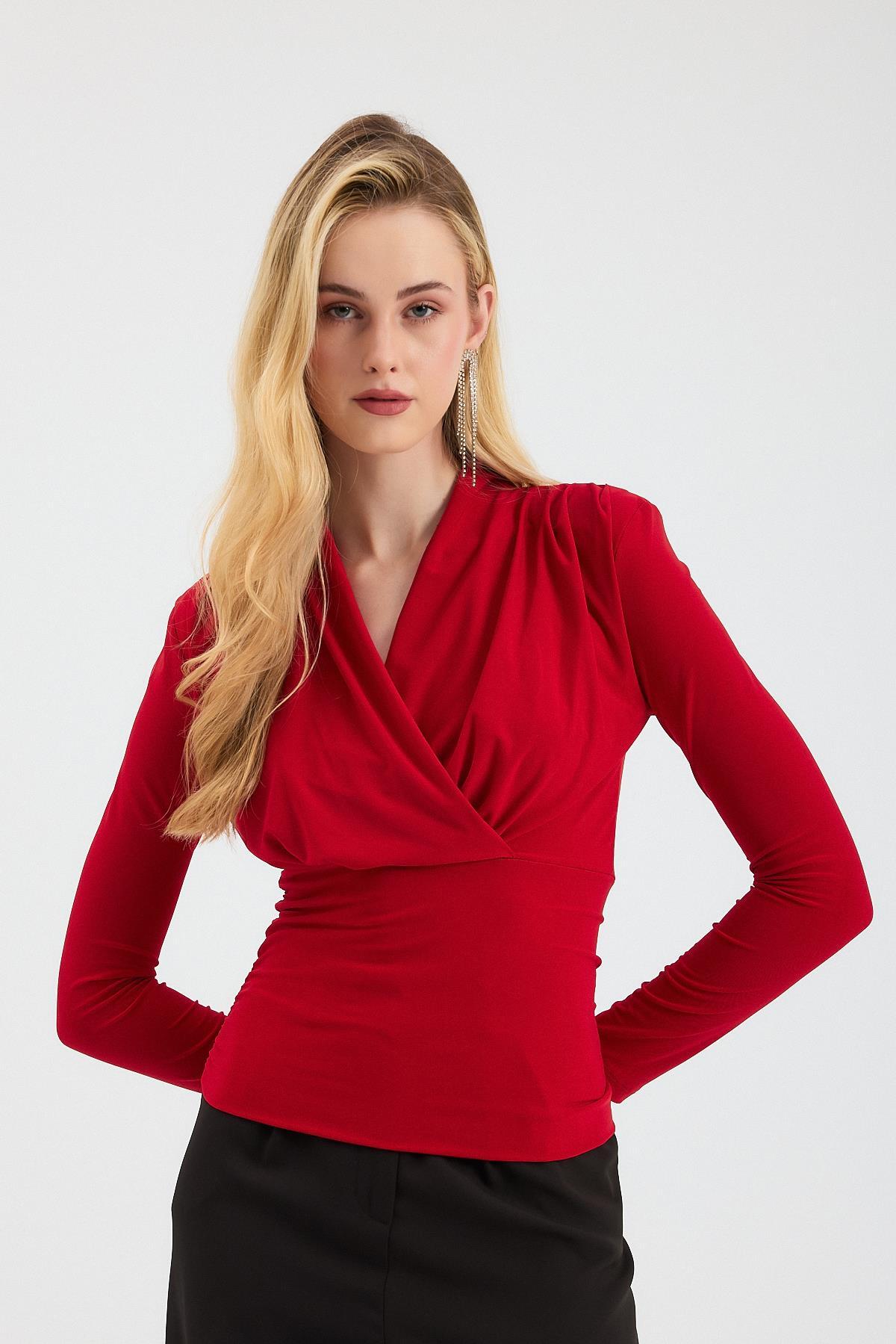 9256 Kruvaze Yaka Vatkalı Bluz Kırmızı