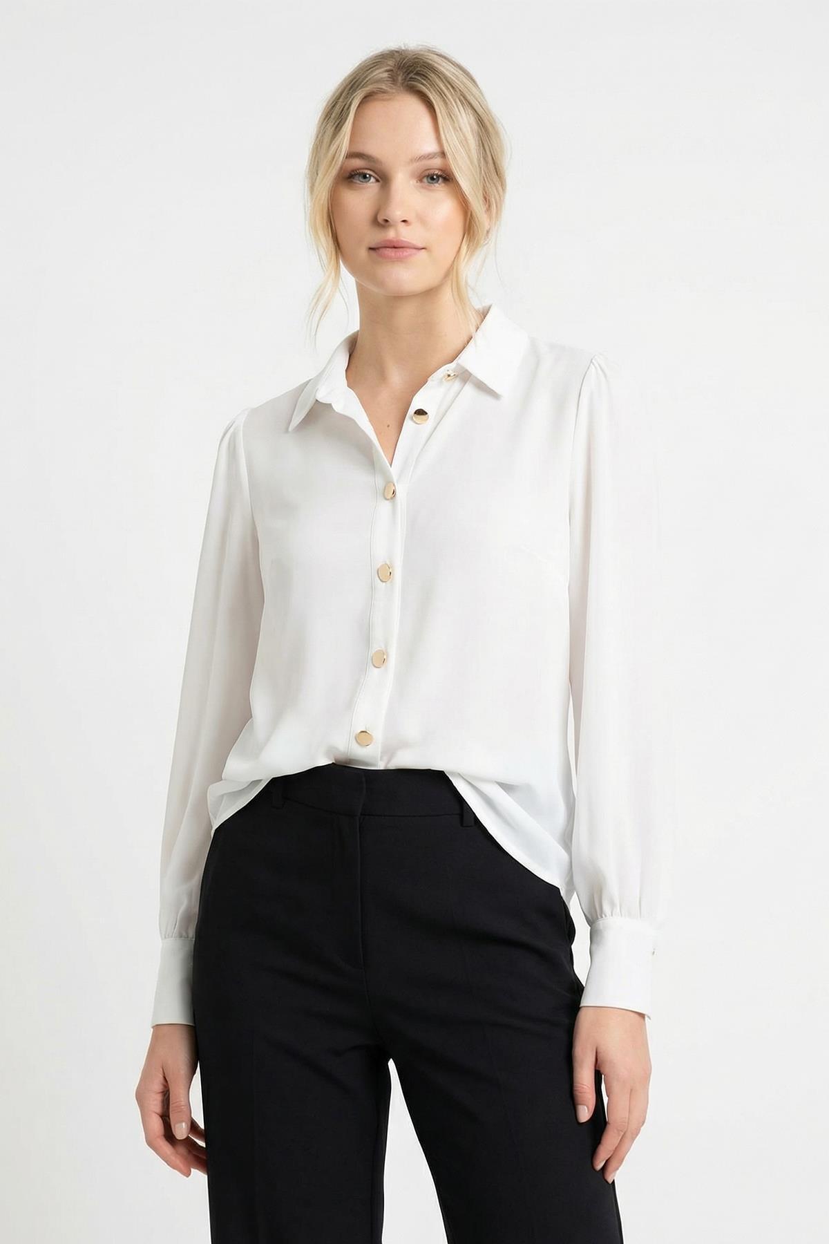 Beyaz Kol Tüllü Düğmeli Bluz 9475