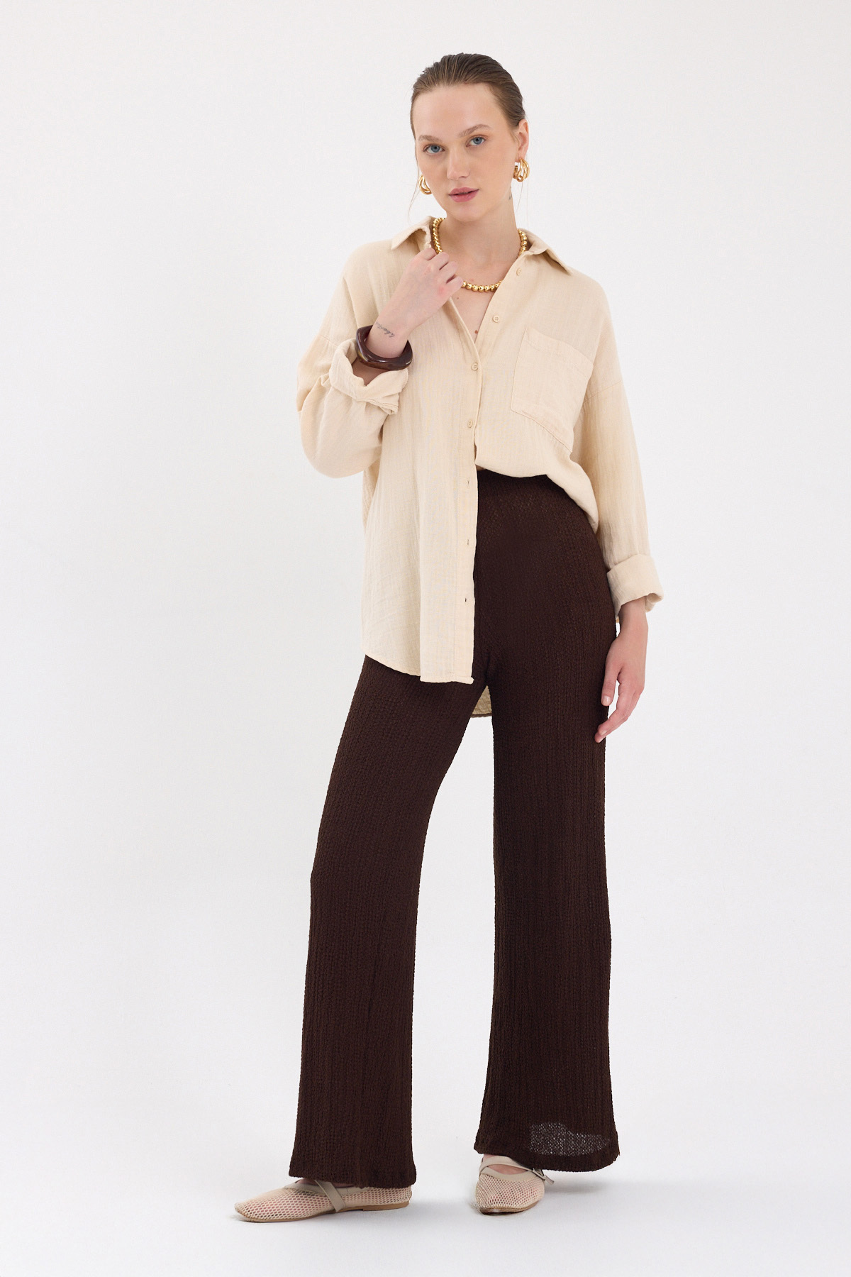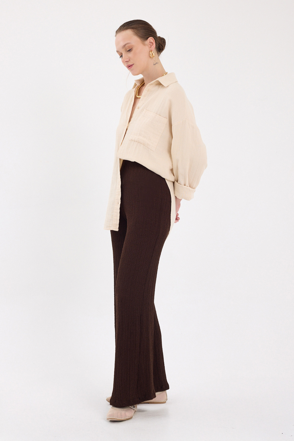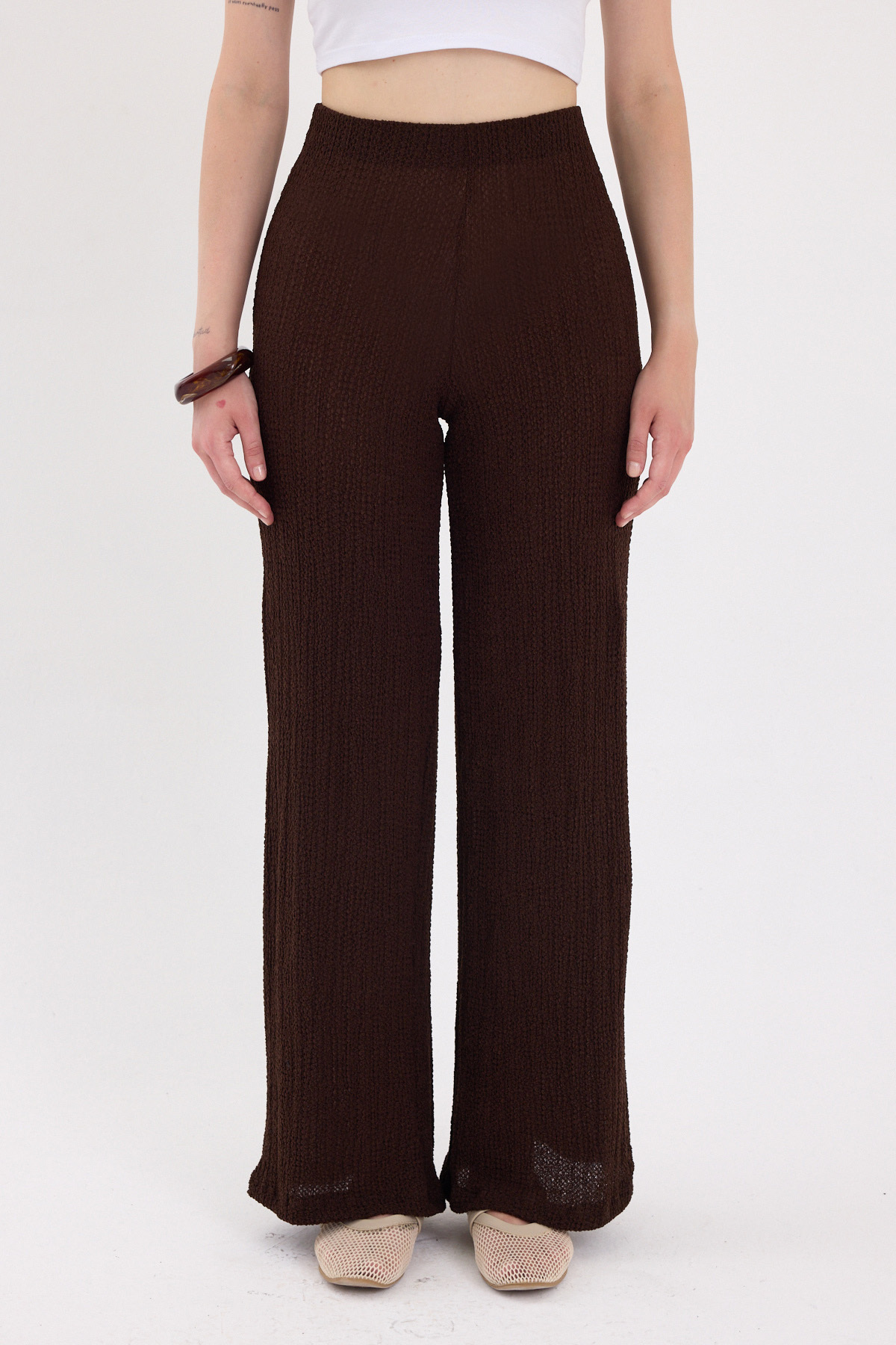 Acı Kahve Bol Paça Bel Lastikli Bürümcük Kumaş Pantolon 2466