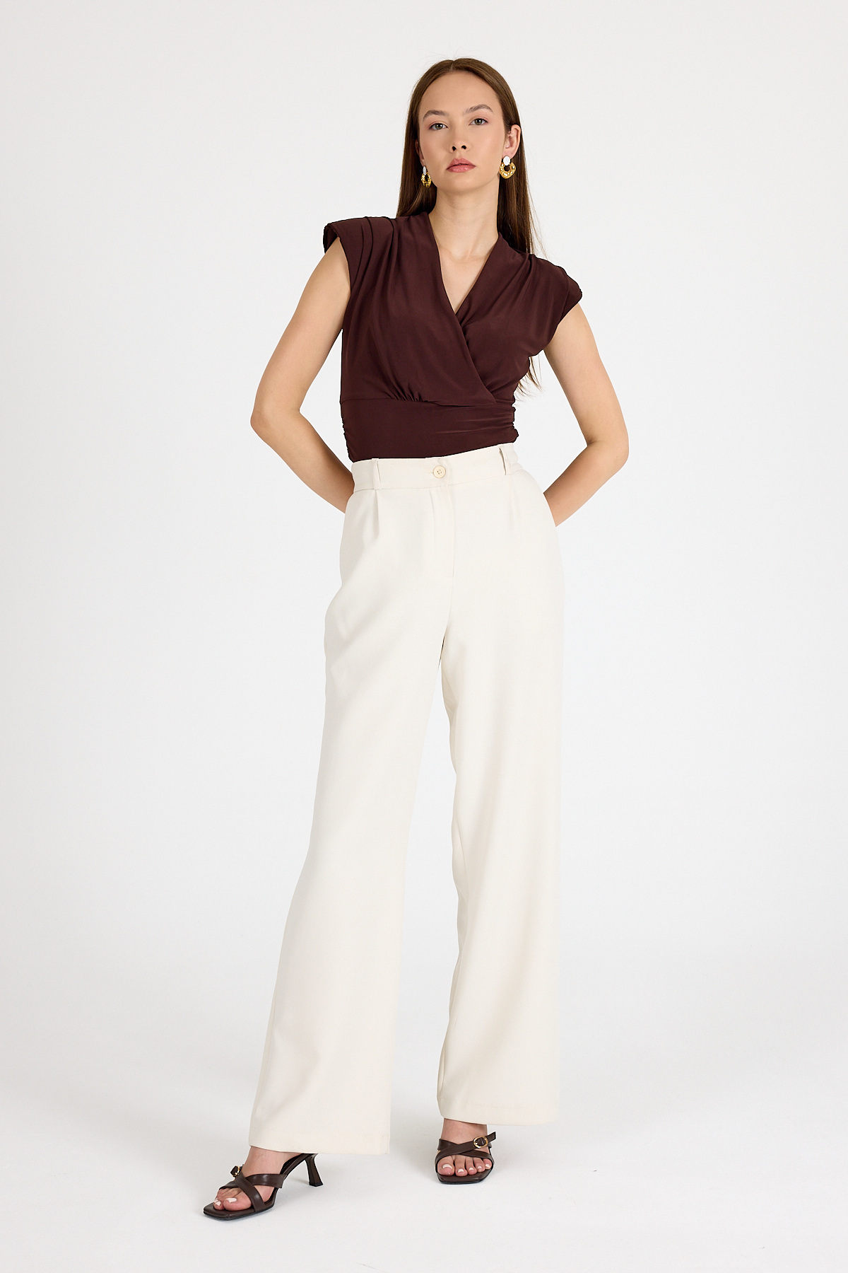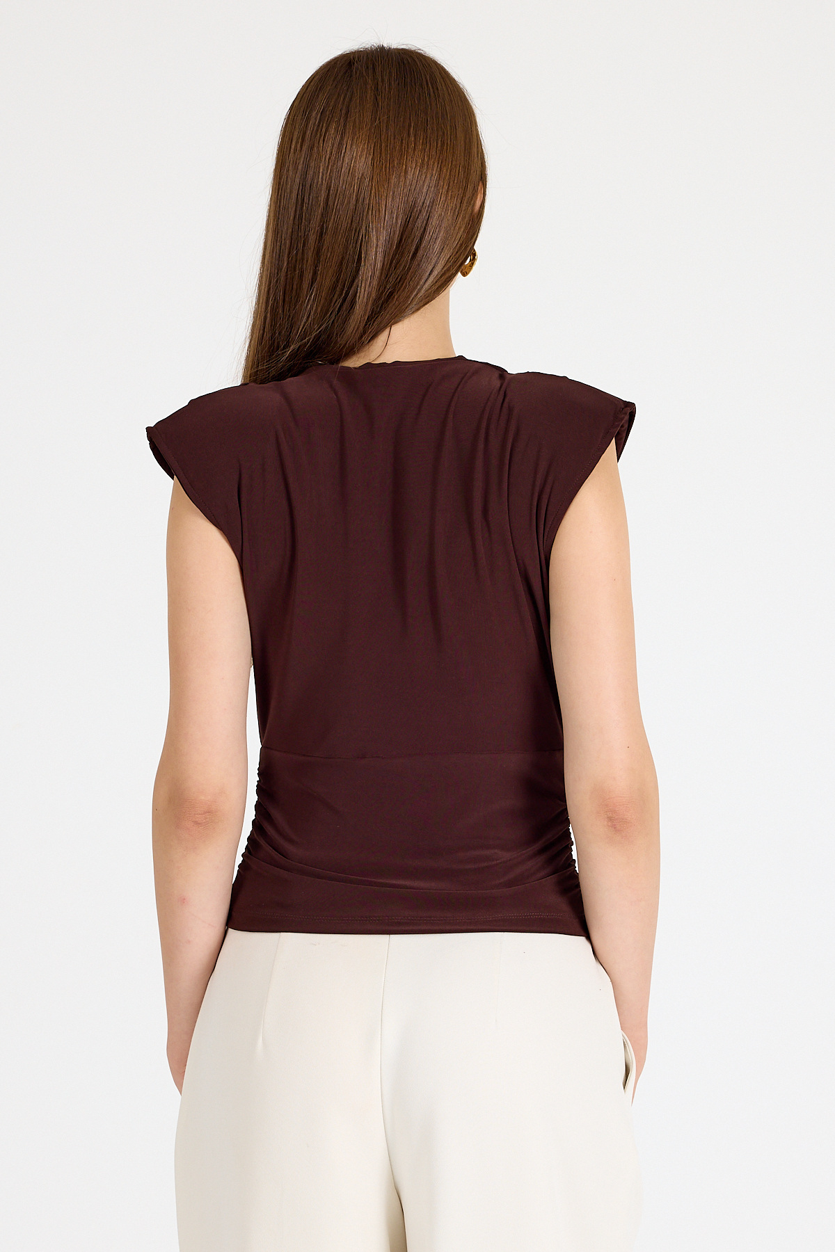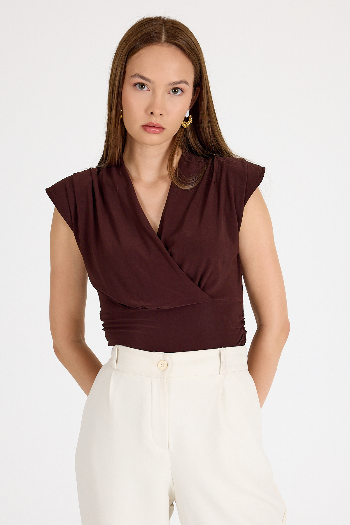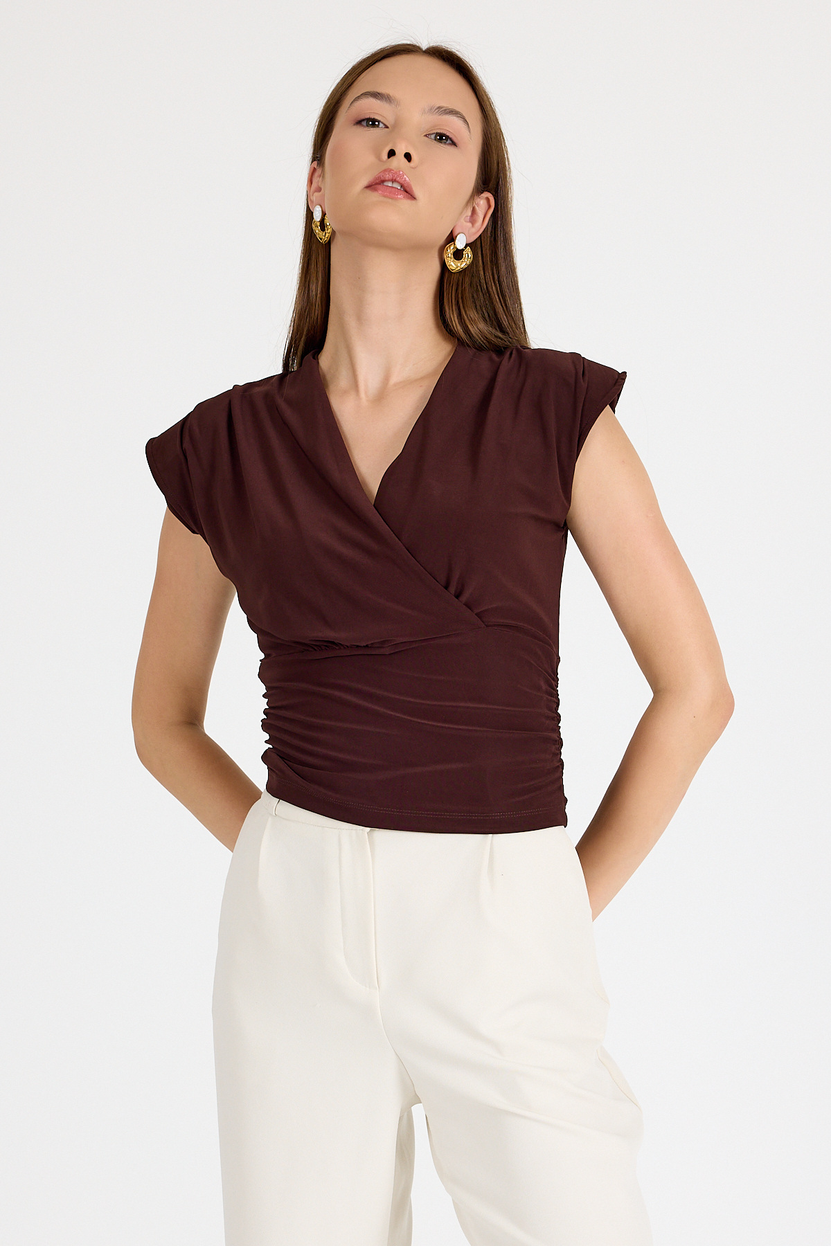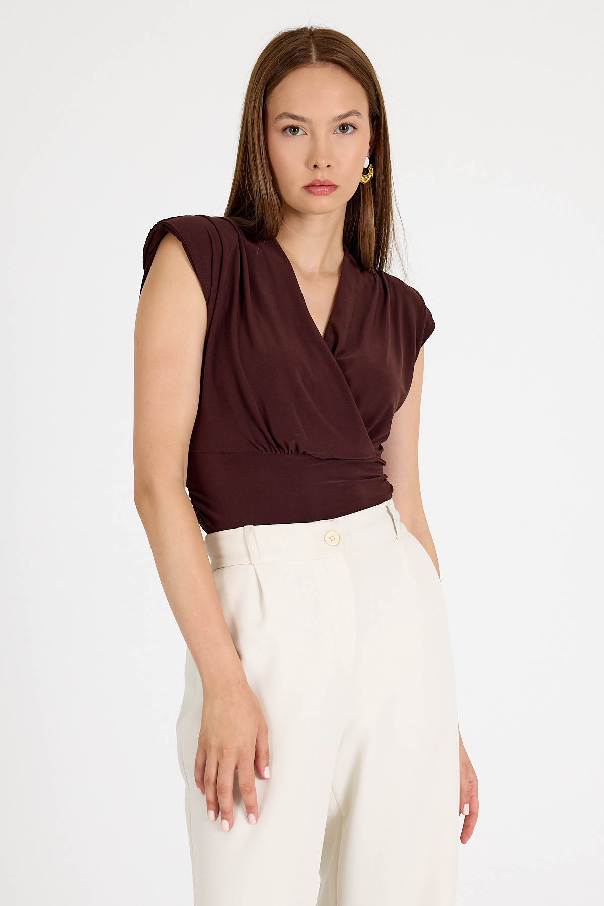 Acı Kahve Vatkalı Kruvaze Yaka Drapeli Bluz 2487