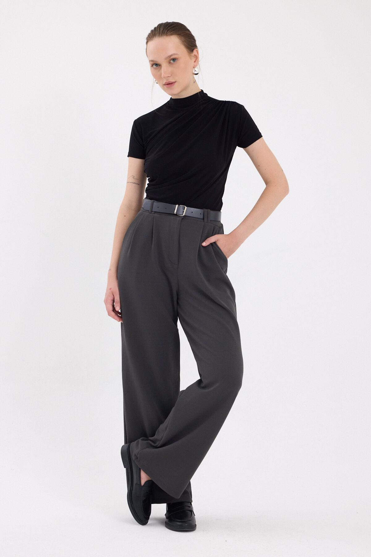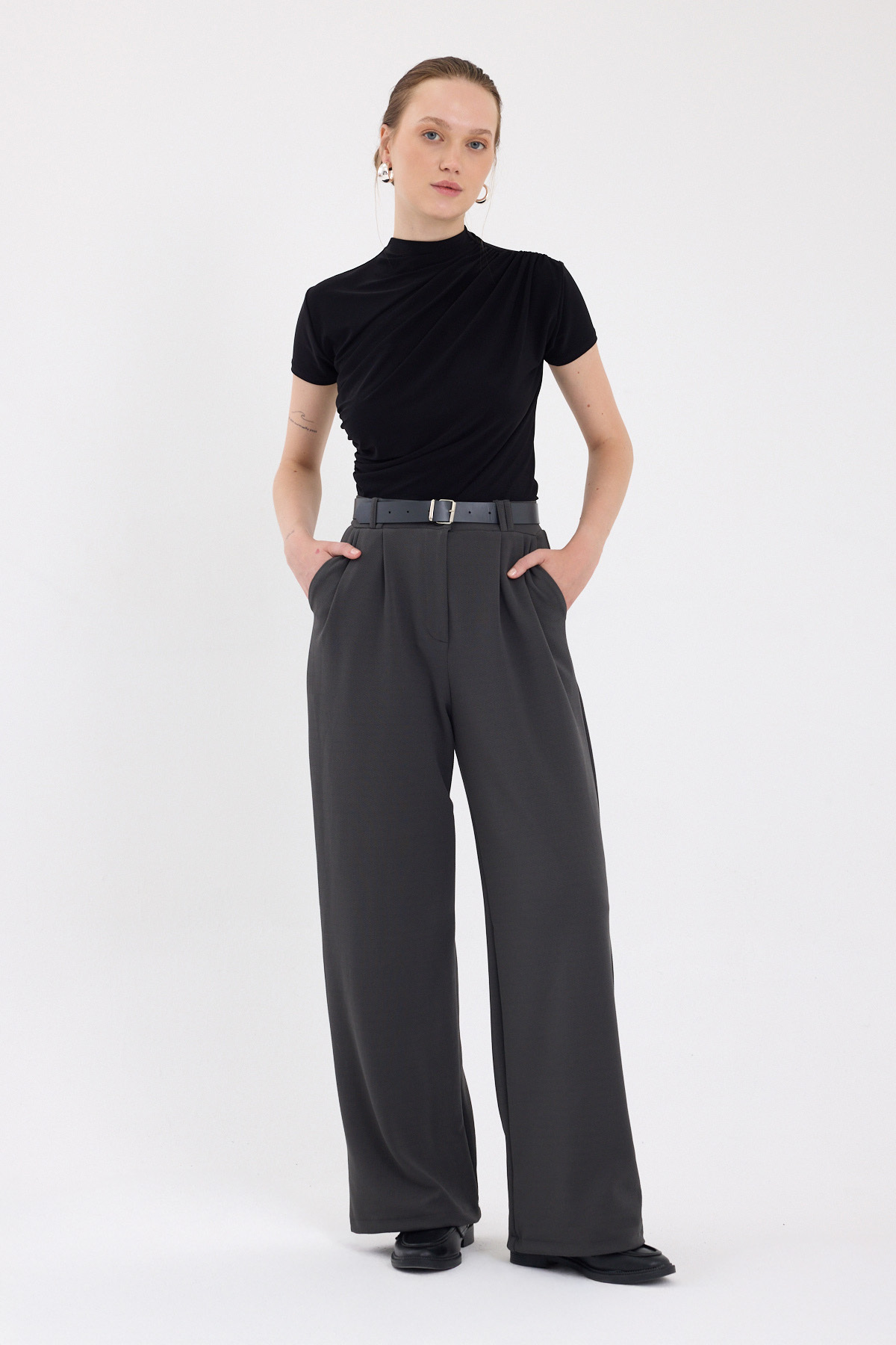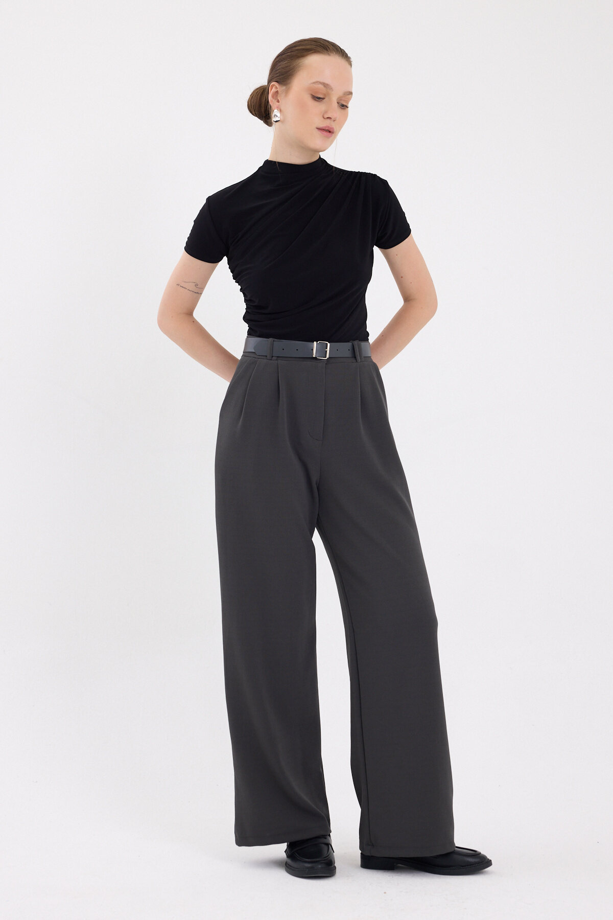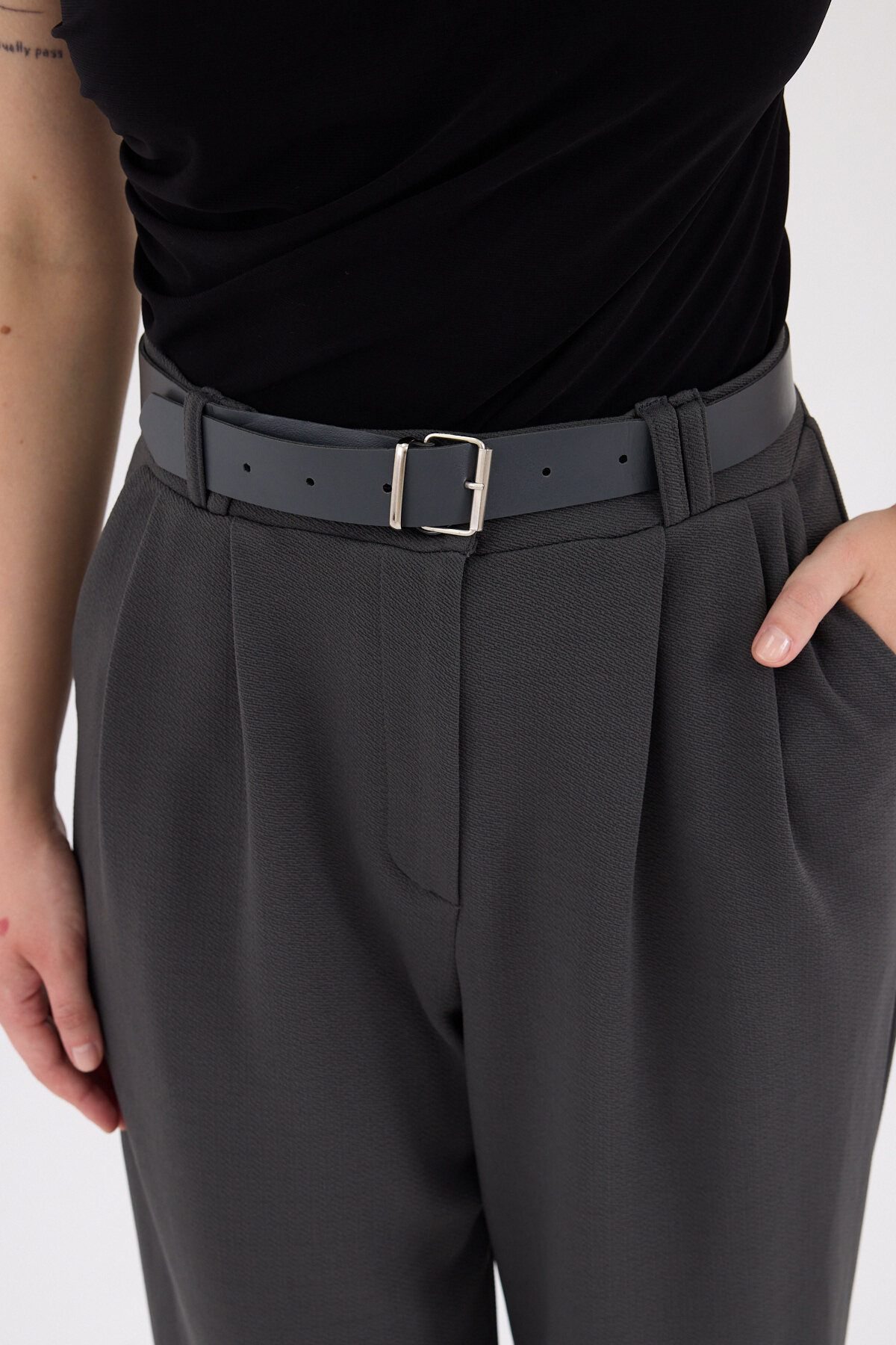Antrasit Çift Pile Detay Kemerli Kadın Pantolon 5009