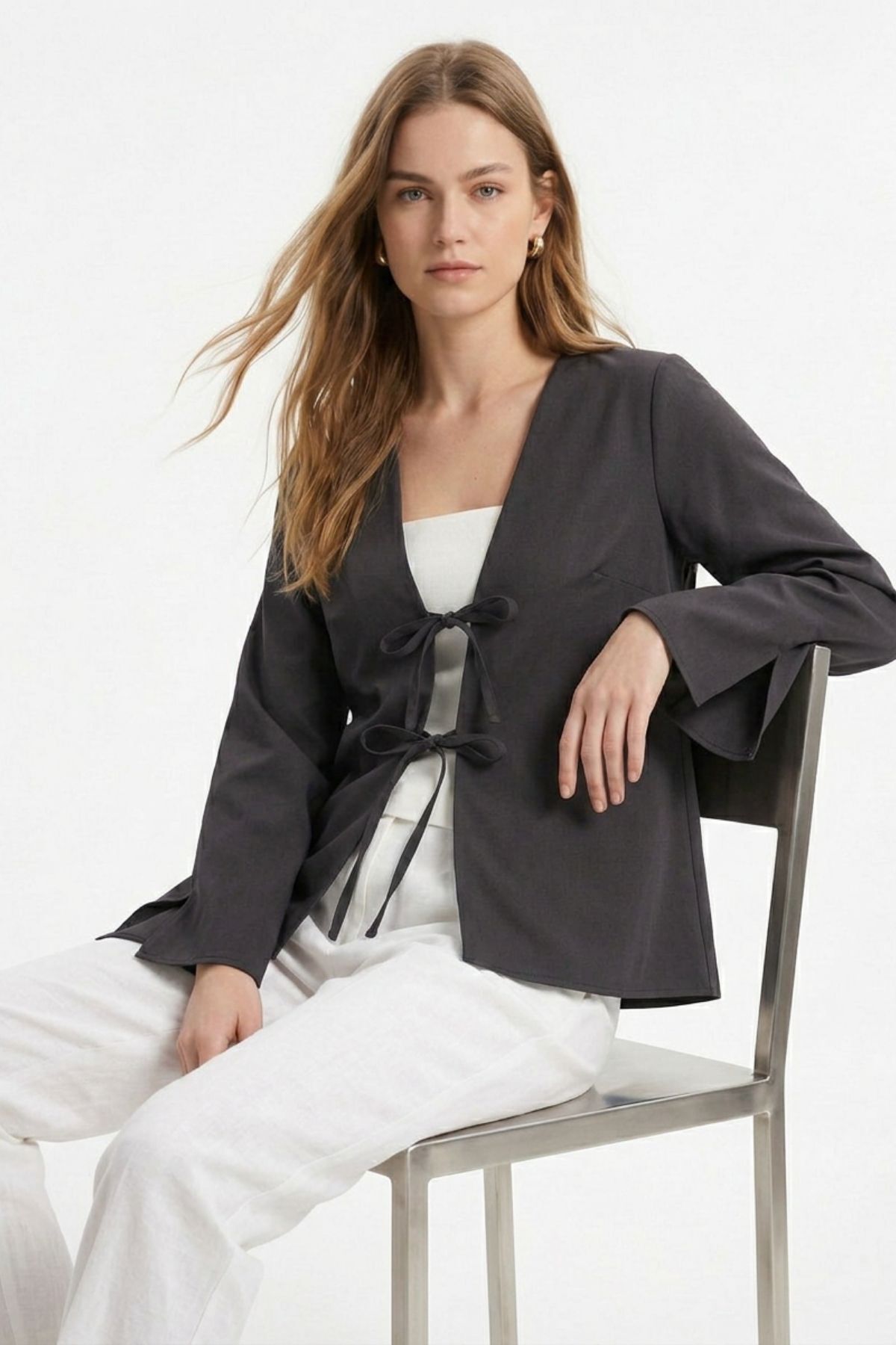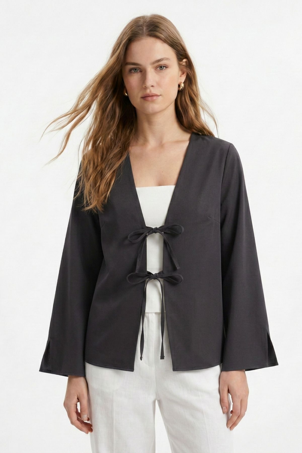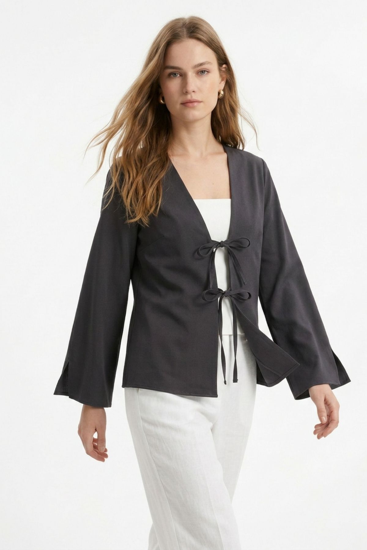 Antrasit Yırtmaçlı İspanyol Kol Ön Bağlama Kimono 5425