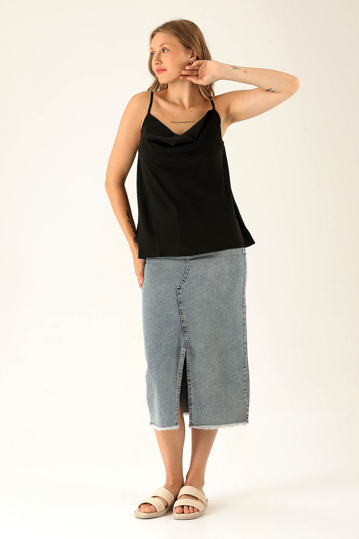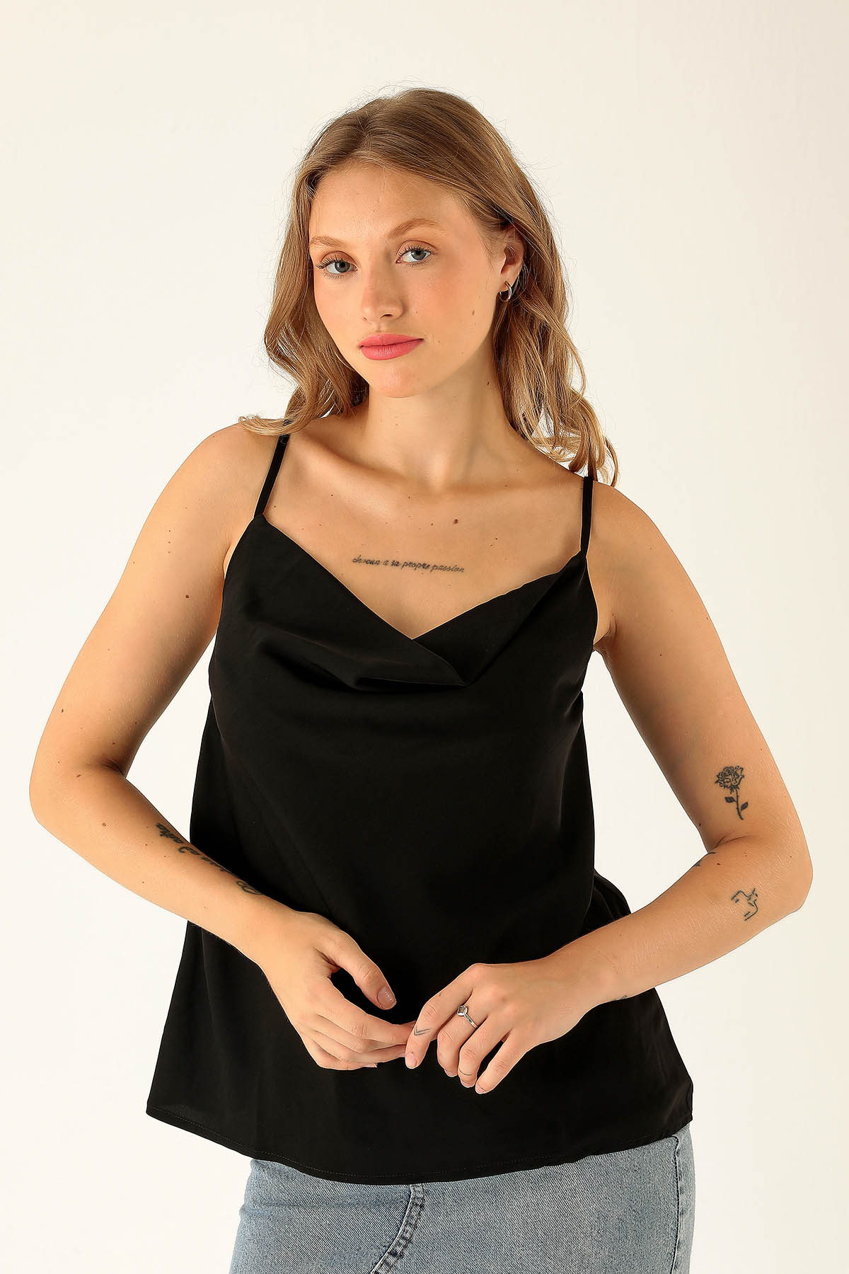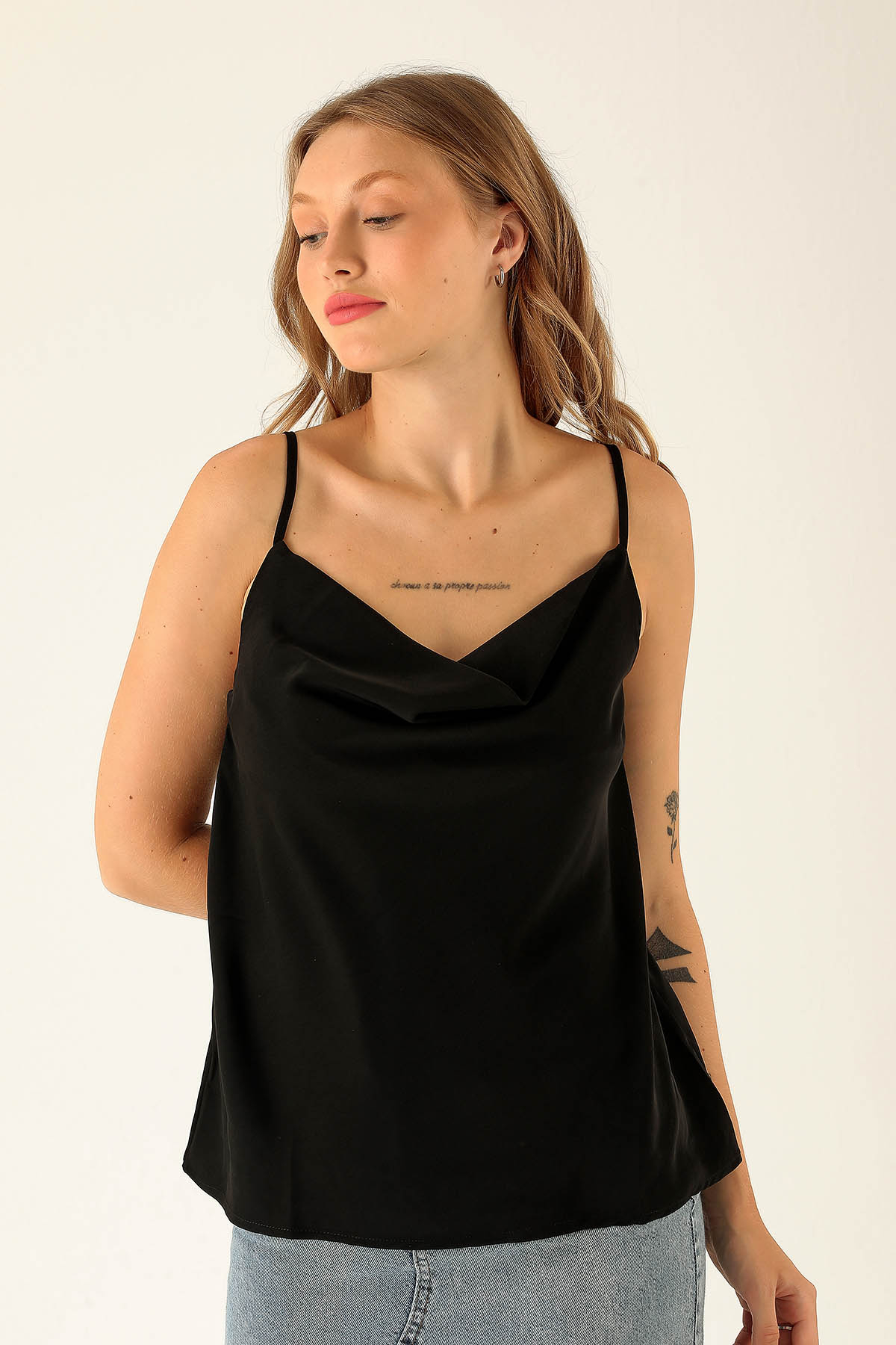 Askılı Degaje Yaka Bluz - 947 Siyah