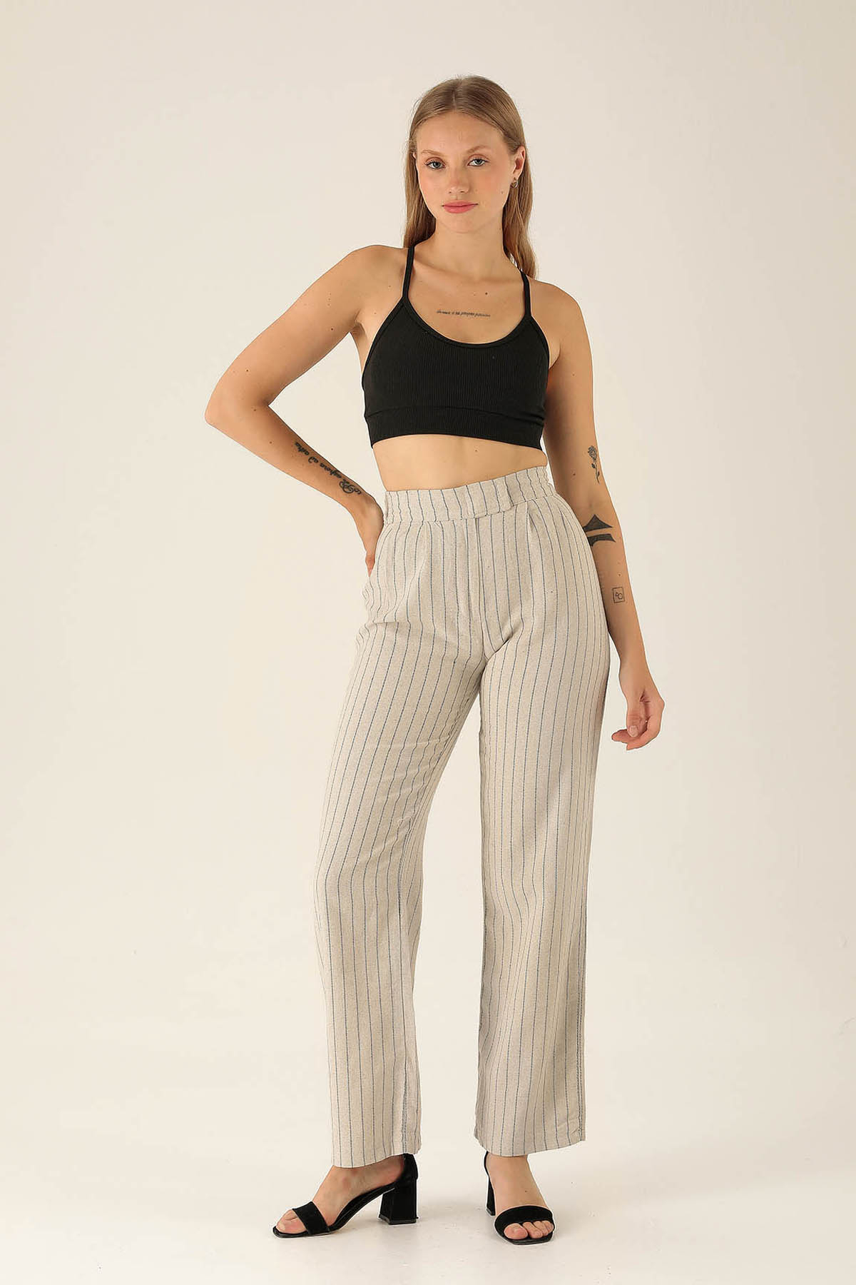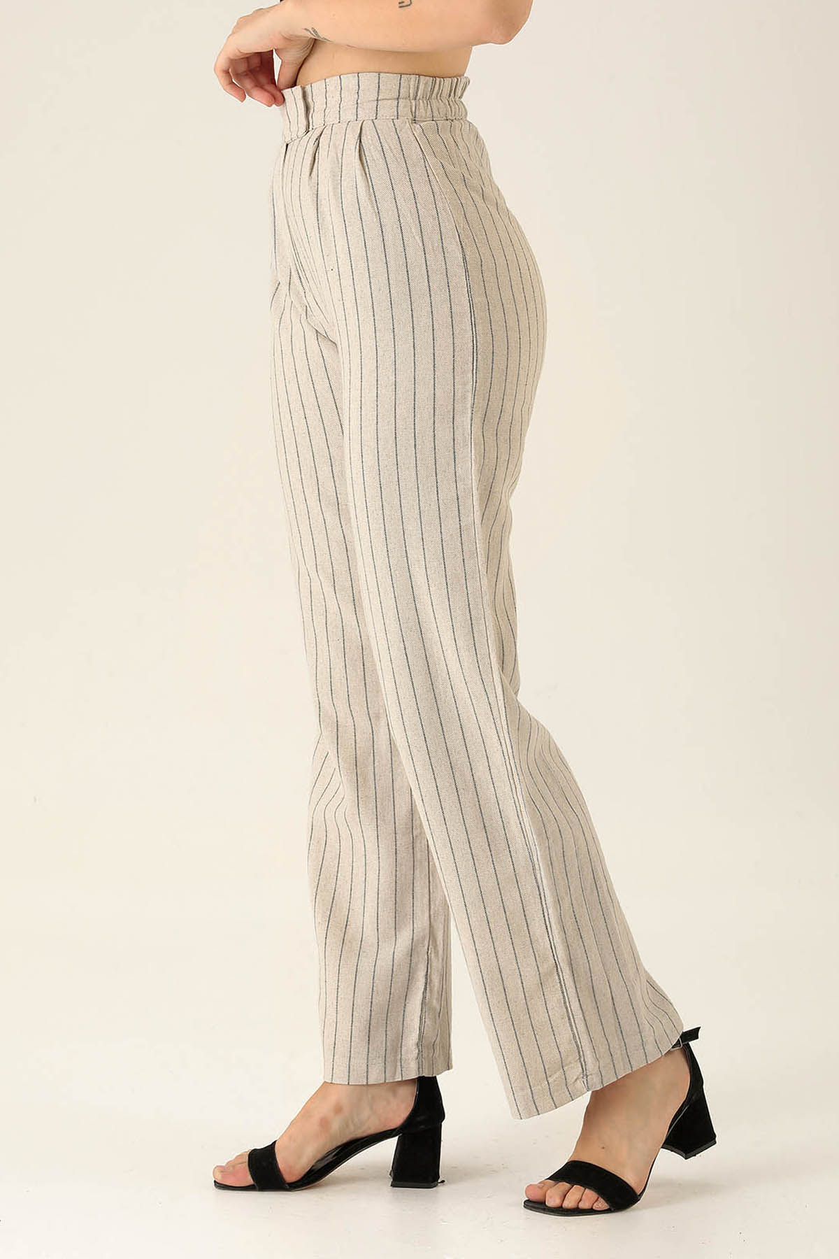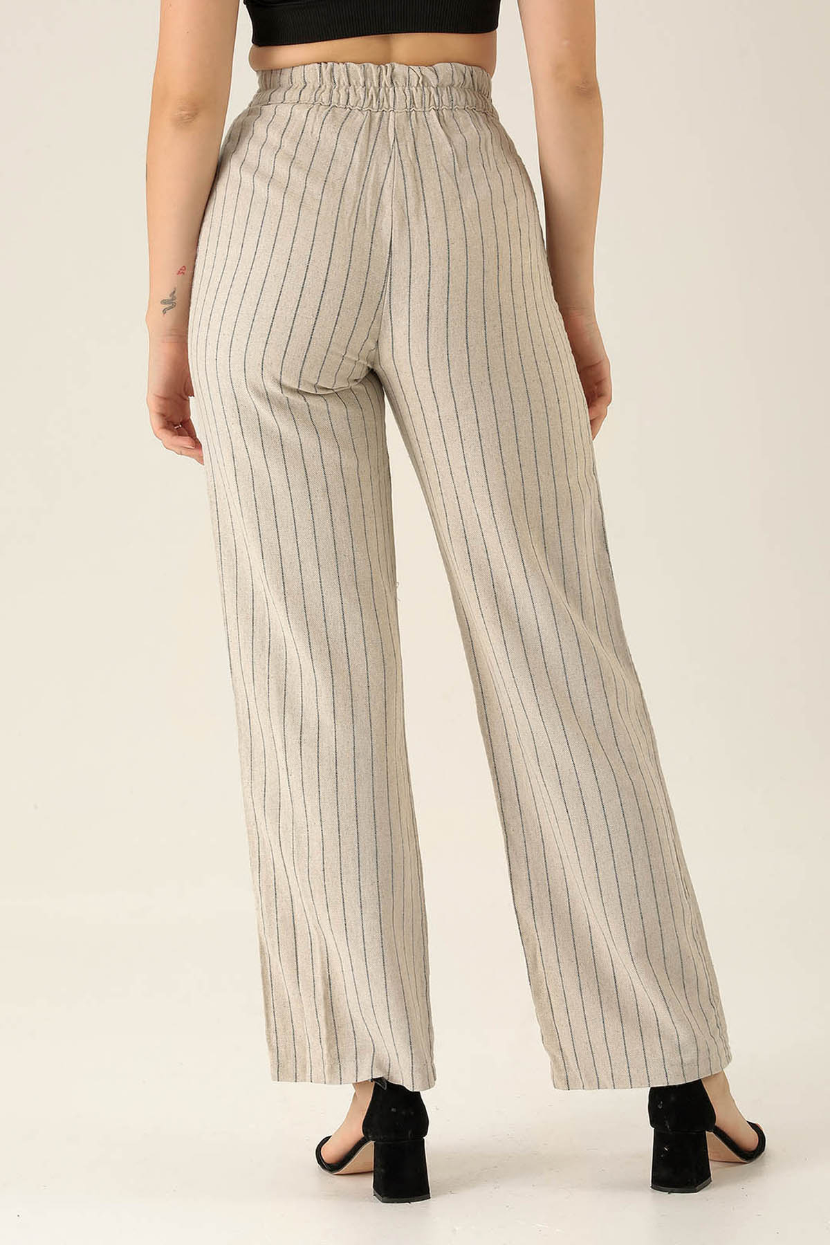 Bantlı Çizgili Palazzo Bayan Pantolon - 3043 Siyah